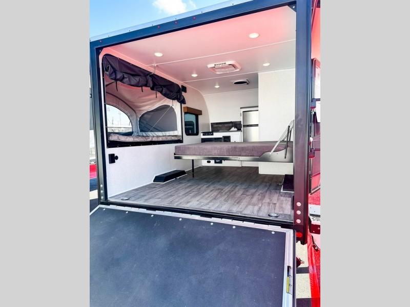 Load up the kayaks or dirt bikes for fun weekends in this toy hauler! Once you've unloaded your toys using the ramp door, you can start lunch in the front corner kitchen that includes a two-burner stove, a 12V refrigerator, and a stainless-steel sink for easy clean up. Speaking of cleaning up, the dry bath is also up front that includes a separate shower and Thetford toilet. And the 50" x 74" Murphy-style bed and side pop-out tent will provide comfy sleeping spaces when you're ready to call it a night!