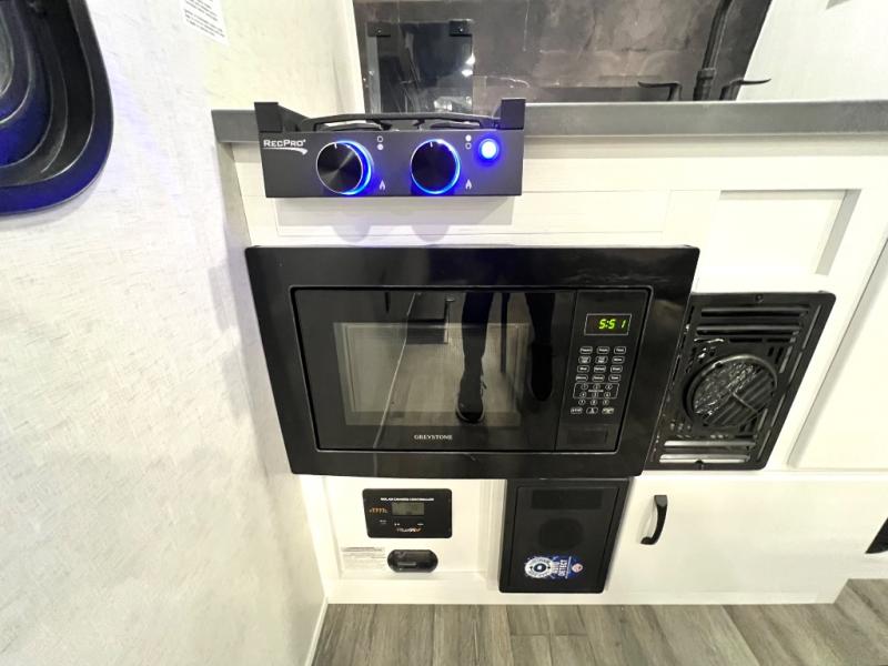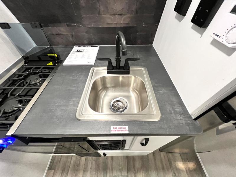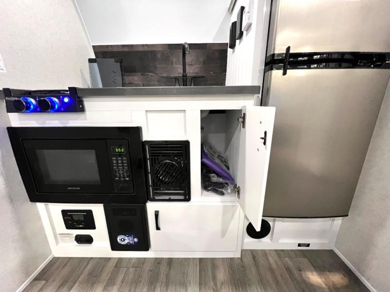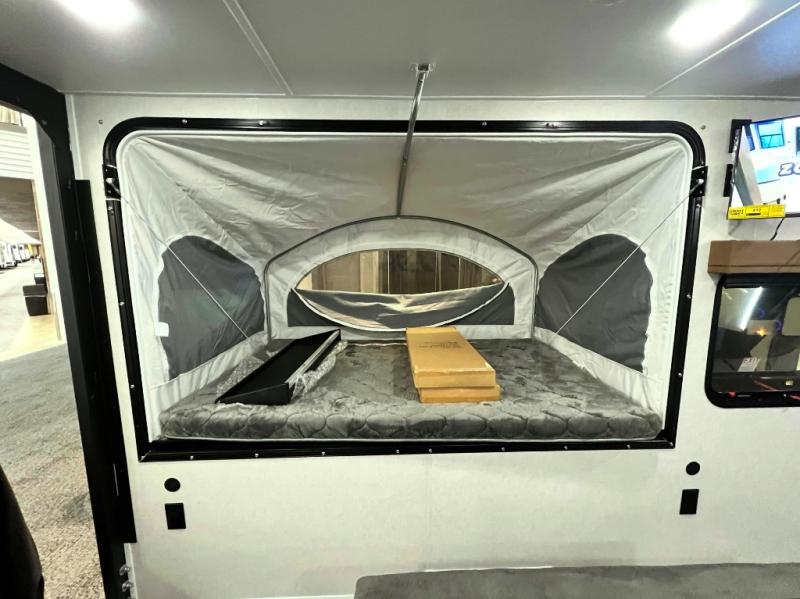 Load up the kayaks or dirt bikes for fun weekends in this toy hauler! Once you've unloaded your toys using the ramp door, you can start lunch in the front corner kitchen that includes a two-burner stove, a 12V refrigerator, and a stainless-steel sink for easy clean up. Speaking of cleaning up, the dry bath is also up front that includes a separate shower and Thetford toilet. And the 50" x 74" Murphy-style bed and side pop-out tent will provide comfy sleeping spaces when you're ready to call it a night!