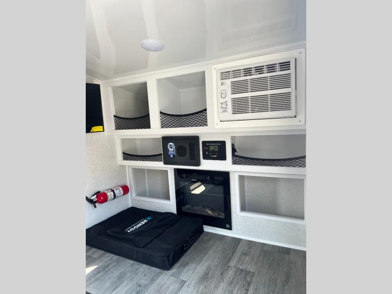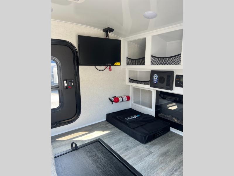 Take this Little Buggy wherever the road leads you! There is sleeping space for two adults on a comfy 6" memory foam mattress, and storage for your necessities with three cubbies and four enclosed cabinets inside, all built with premium birch wood. More storage can be found in the front exterior box made of steel for either your clothing, dry food, or gear. The mattress easily converts to a sofa which is perfect for daytime relaxing. Also inside, you will enjoy a fireplace to warm you right up on those cool summer evenings or crisp, fall mornings, and the HD TV will entertain you when the weather keeps you indoors. The roof top carriage rack allows you to carry your paddle boards, bikes, or more camping gear, or you can add the optional rooftop tent which will allow you to sleep two more!