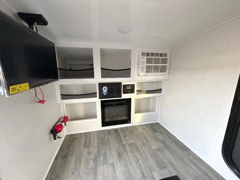 Take this Little Buggy wherever the road leads you! There is sleeping space for two adults on a comfy 6" memory foam mattress, and storage for your necessities with three cubbies and four enclosed cabinets inside, all built with premium birch wood. More storage can be found in the front exterior box made of steel for either your clothing, dry food, or gear. The mattress easily converts to a sofa which is perfect for daytime relaxing. Also inside, you will enjoy a fireplace to warm you right up on those cool summer evenings or crisp, fall mornings, and the HD TV will entertain you when the weather keeps you indoors. The roof top carriage rack allows you to carry your paddle boards, bikes, or more camping gear, or you can add the optional rooftop tent which will allow you to sleep two more!