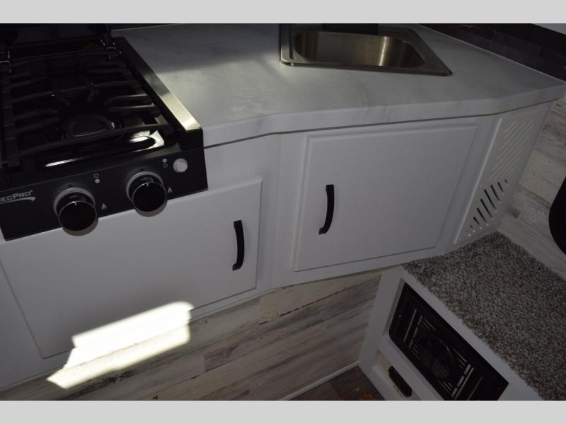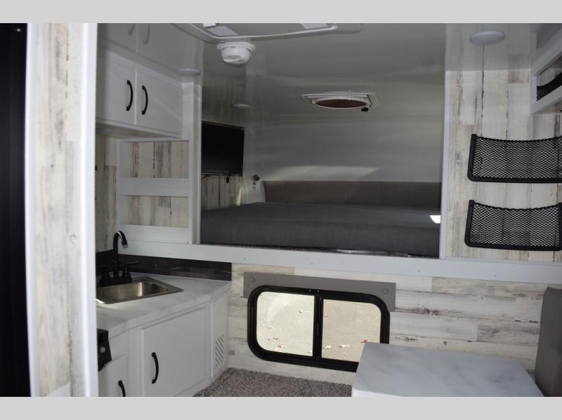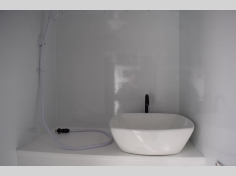 The Modern Buggy truck camper is constructed with Azdel walls, roof and ceiling for added durability, plus they are off-grid ready with torsion axles, all-terrain tires, and optional solar power. You will love the stainless steel sink with a faucet, and the USB stations will keep your electronics powered up. There is an outside spray port shower box outside, and you can choose an optional power jack for hassle-free set up!