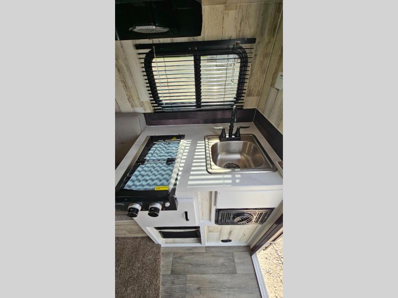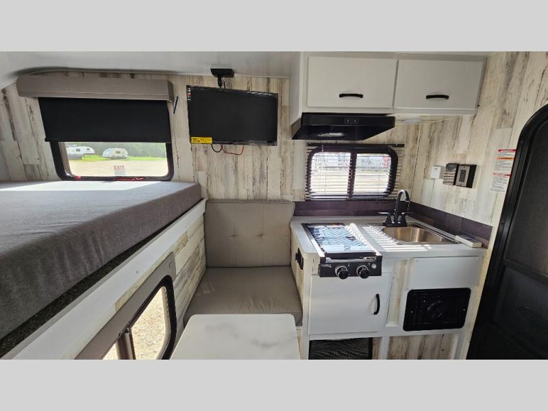 This cozy truck camper is perfect for those who love simple camping! There is a two burner cooktop with a cover for seamless countertop space, and a large refrigerator will let you store perishables. The 25" x 80" dinette bed will provide a place to dine and play games each night, and you're sure to love 60" x 80" queen-size bed to sleep on instead of an air mattress.