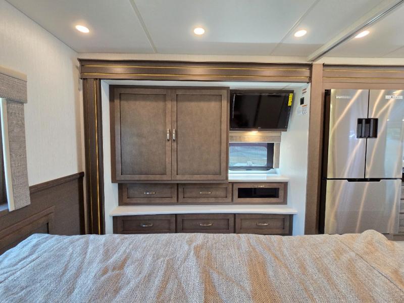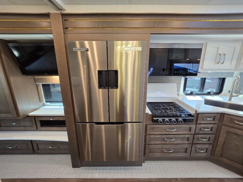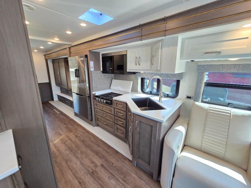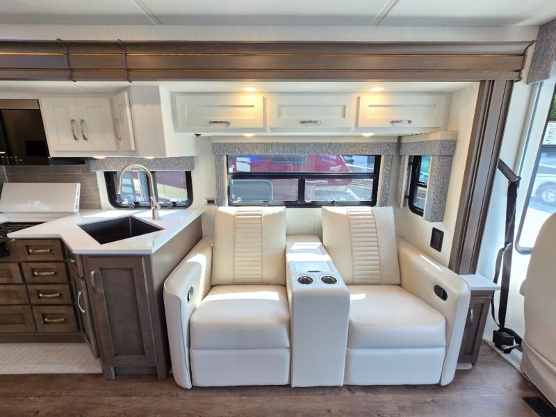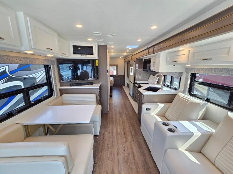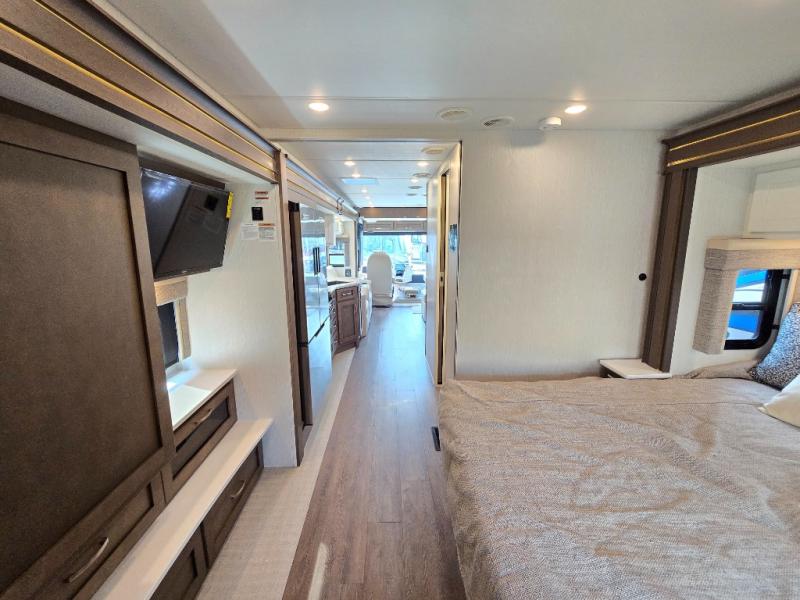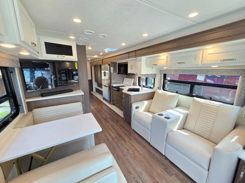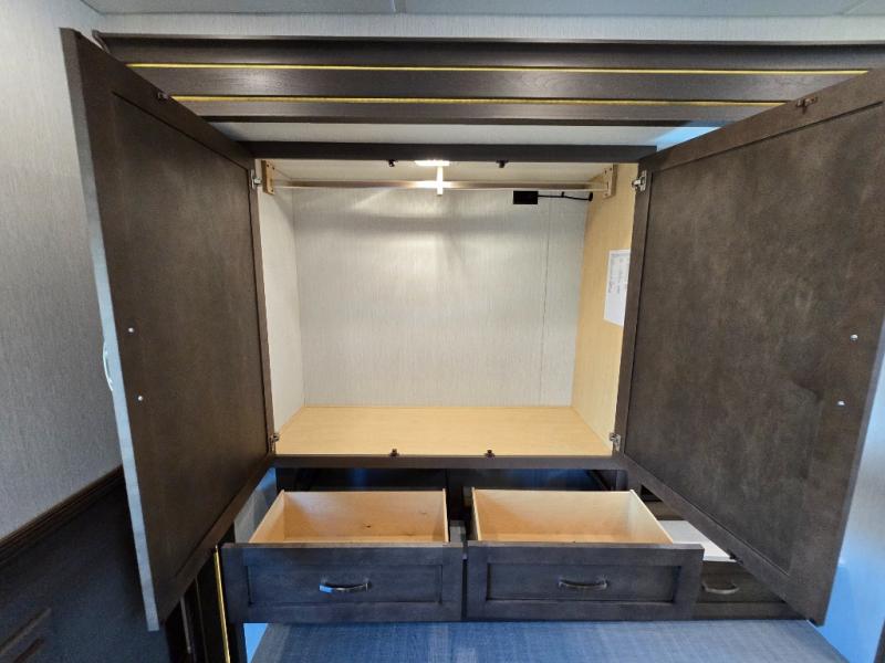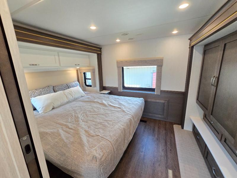 Make each trip luxurious in this spacious coach that can sleep five to six people each night. If you're needing additional sleeping space, just choose the optional drop-down bunk above the cockpit. You will wake up feeling refreshed after sleeping on the king bed slide out, and your guests can put away their bedding after sleeping on the sofa comfort lounge and booth dinette. Breakfast can be made on the three burner cooktop or in the 30" convection microwave. You will appreciate the pantry and a Norcold 10 cu. ft. refrigerator for your food. This model also includes a shirt wardrobe in the bedroom, along with a dresser so you can bring along your favorite outfits. And you'll never go bored with Samsung LED TV's in the bedroom and living area!