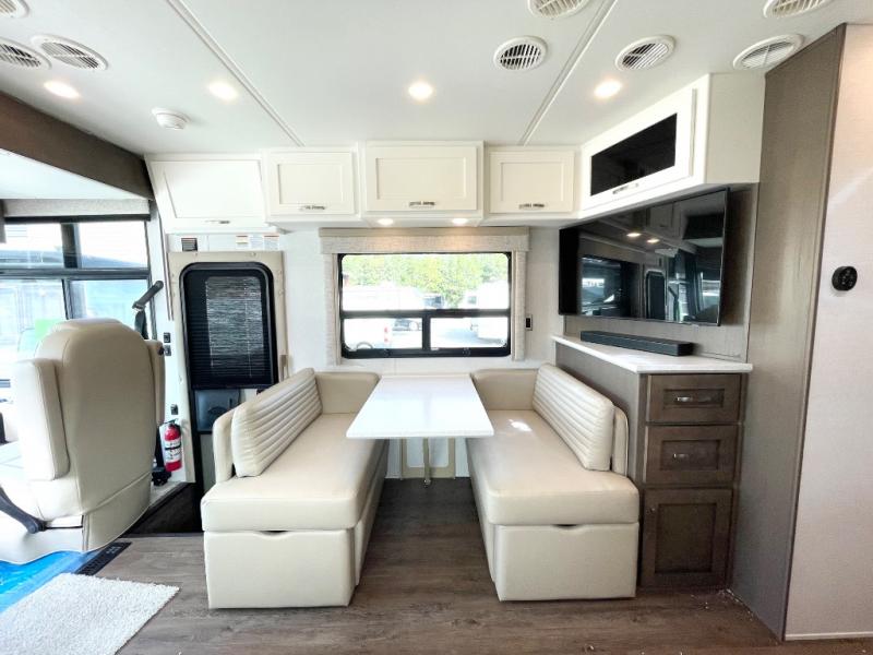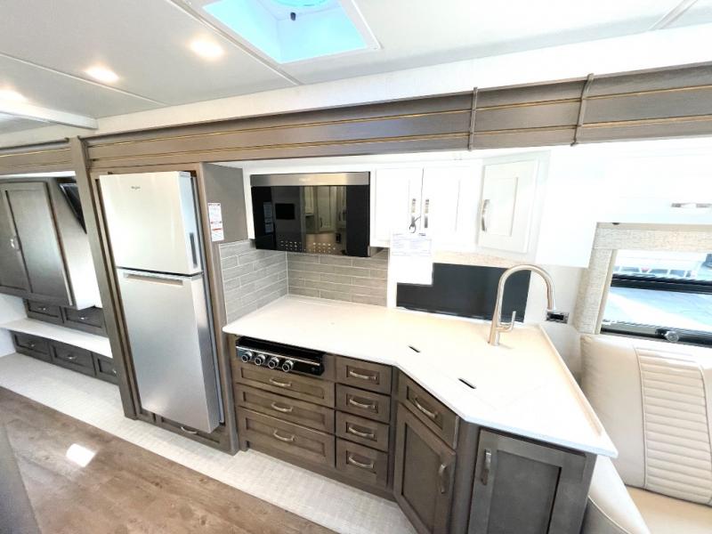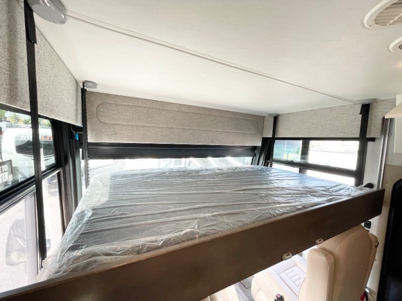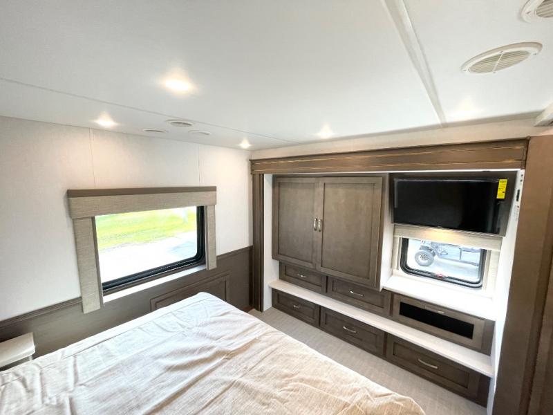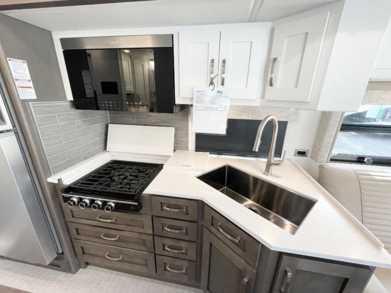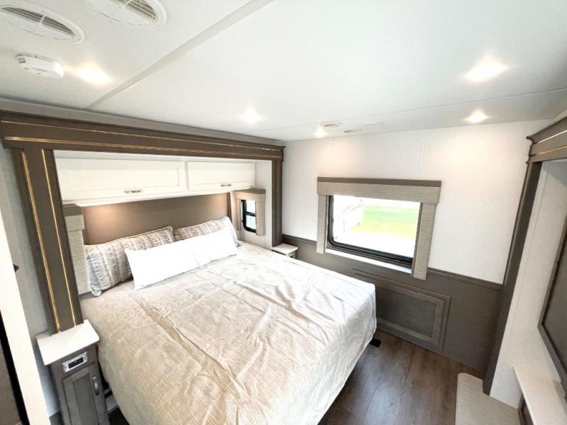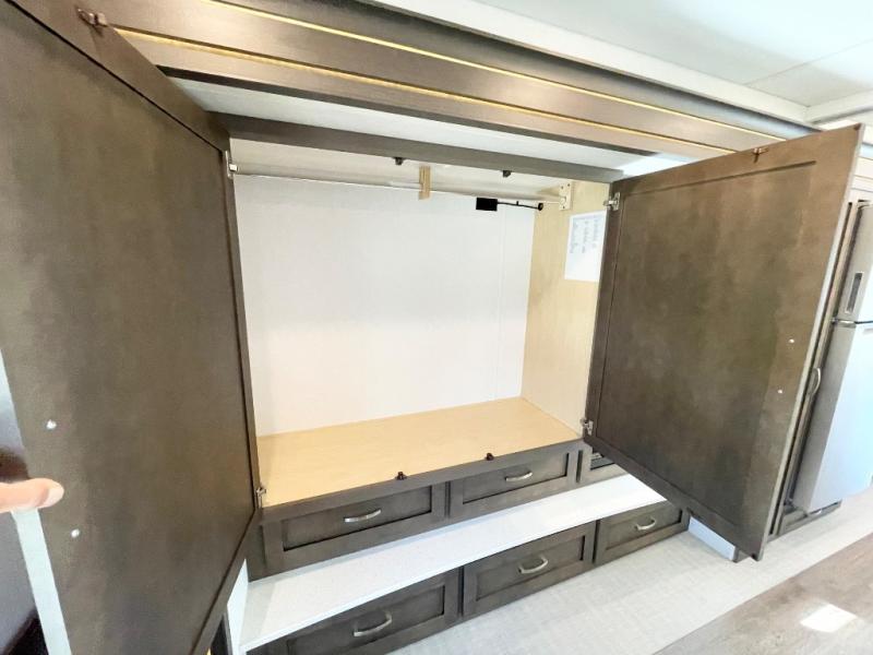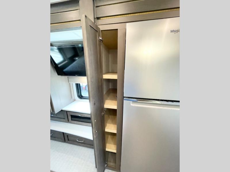Make each trip luxurious in this spacious coach that can sleep five to six people each night. If you're needing additional sleeping space, just choose the optional drop-down bunk above the cockpit. You will wake up feeling refreshed after sleeping on the king bed slide out, and your guests can put away their bedding after sleeping on the sofa comfort lounge and booth dinette. Breakfast can be made on the three burner cooktop or in the 30" convection microwave. You will appreciate the pantry and a Norcold 10 cu. ft. refrigerator for your food. This model also includes a shirt wardrobe in the bedroom, along with a dresser so you can bring along your favorite outfits. And you'll never go bored with Samsung LED TV's in the bedroom and living area!