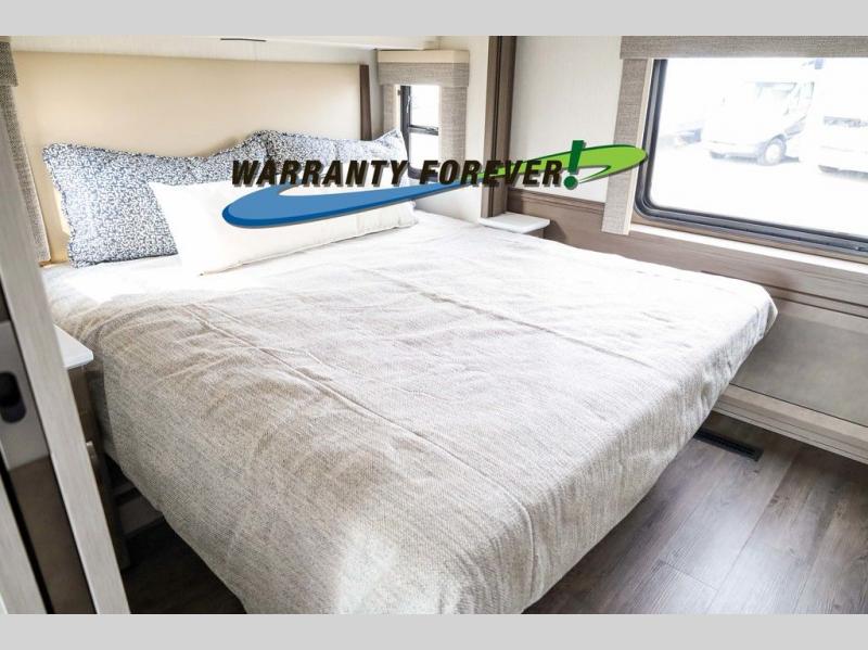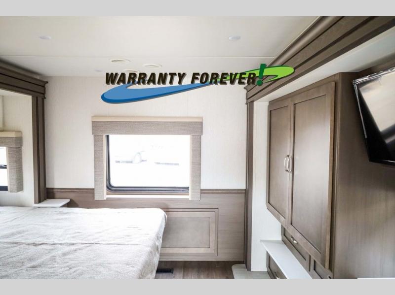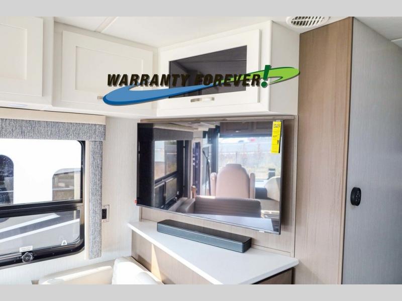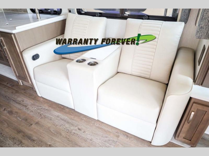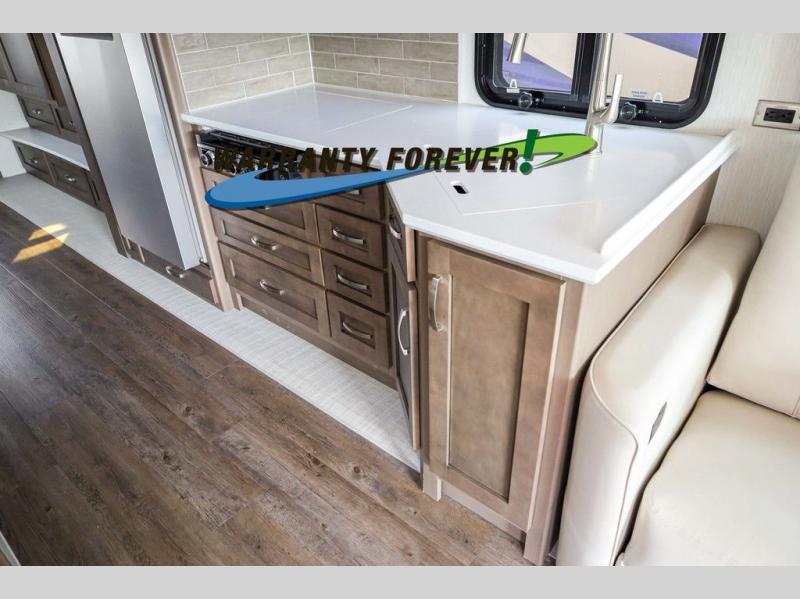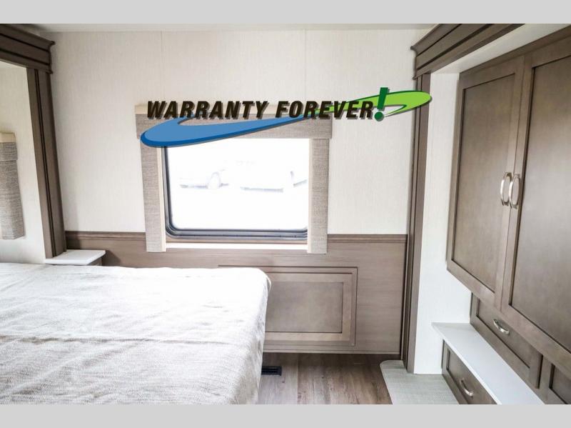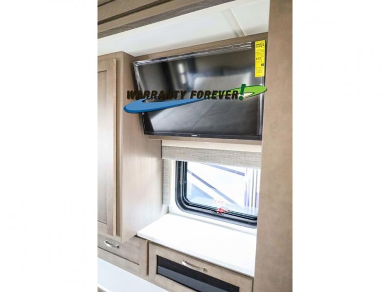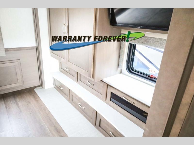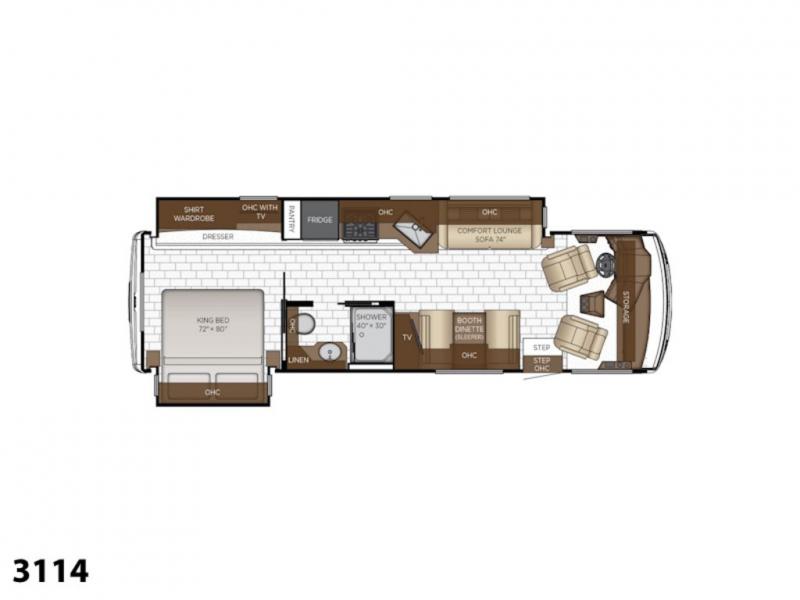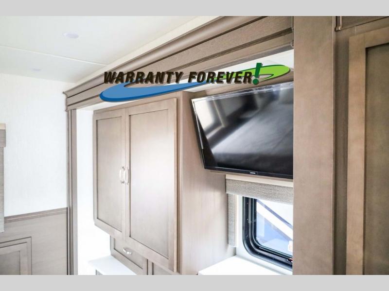 Make each trip luxurious in this spacious coach that can sleep five to six people each night. If you're needing additional sleeping space, just choose the optional drop-down bunk above the cockpit. You will wake up feeling refreshed after sleeping on the king bed slide out, and your guests can put away their bedding after sleeping on the sofa comfort lounge and booth dinette. Breakfast can be made on the three burner cooktop or in the 30" convection microwave. You will appreciate the pantry and a Norcold 10 cu. ft. refrigerator for your food. This model also includes a shirt wardrobe in the bedroom, along with a dresser so you can bring along your favorite outfits. And you'll never go bored with Samsung LED TV's in the bedroom and living area!