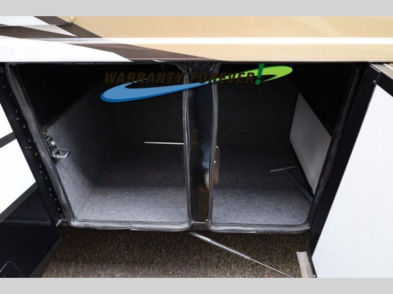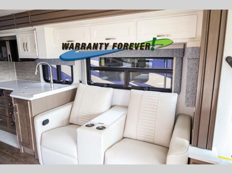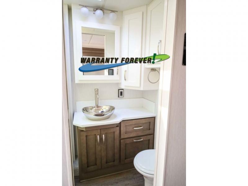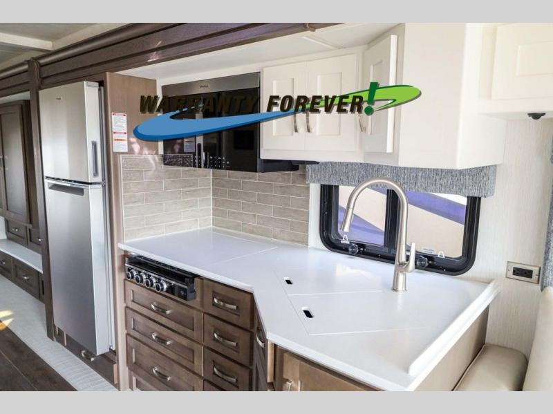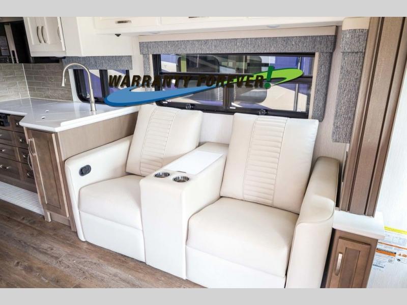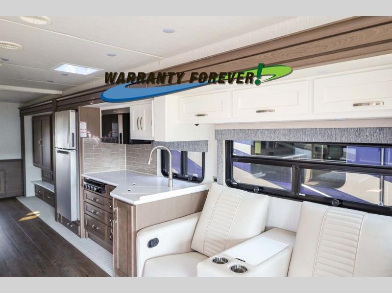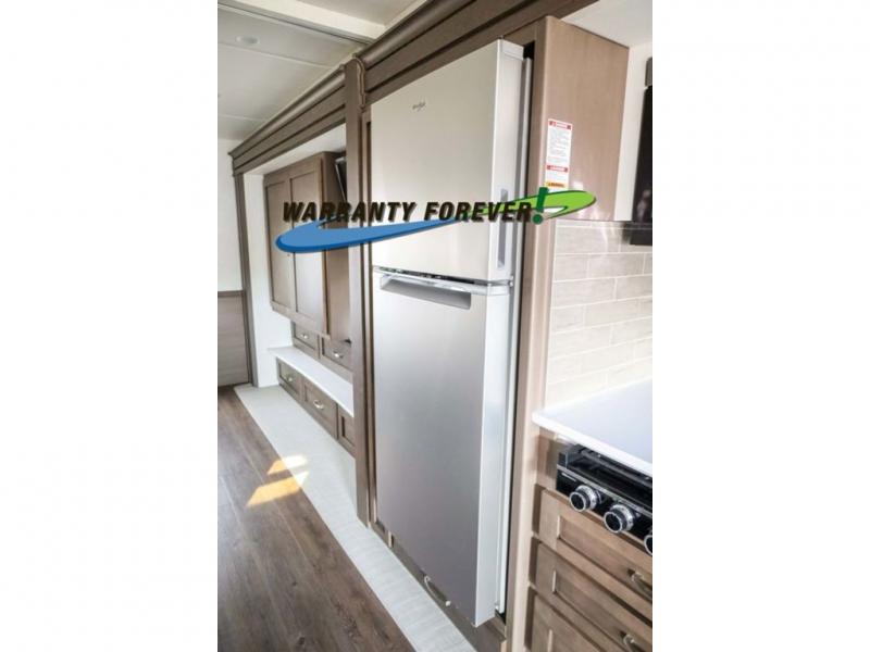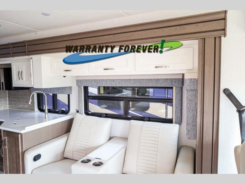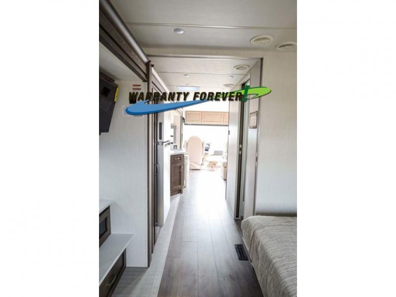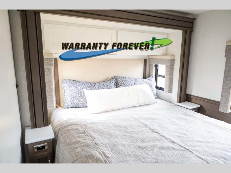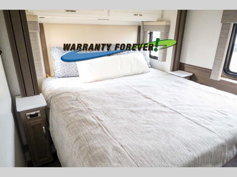 Make each trip luxurious in this spacious coach that can sleep five to six people each night. If you're needing additional sleeping space, just choose the optional drop-down bunk above the cockpit. You will wake up feeling refreshed after sleeping on the king bed slide out, and your guests can put away their bedding after sleeping on the sofa comfort lounge and booth dinette. Breakfast can be made on the three burner cooktop or in the 30" convection microwave. You will appreciate the pantry and a Norcold 10 cu. ft. refrigerator for your food. This model also includes a shirt wardrobe in the bedroom, along with a dresser so you can bring along your favorite outfits. And you'll never go bored with Samsung LED TV's in the bedroom and living area!