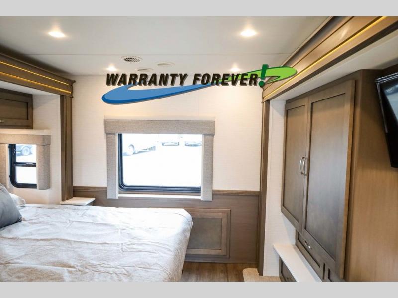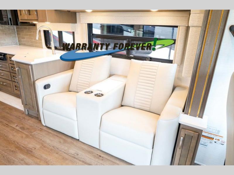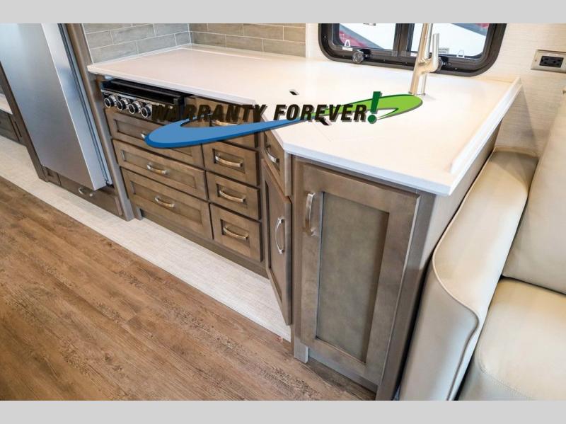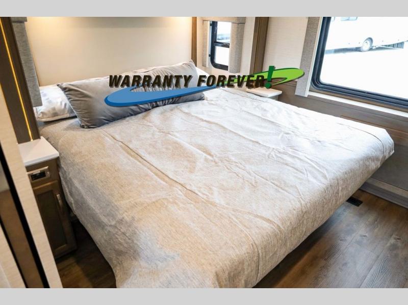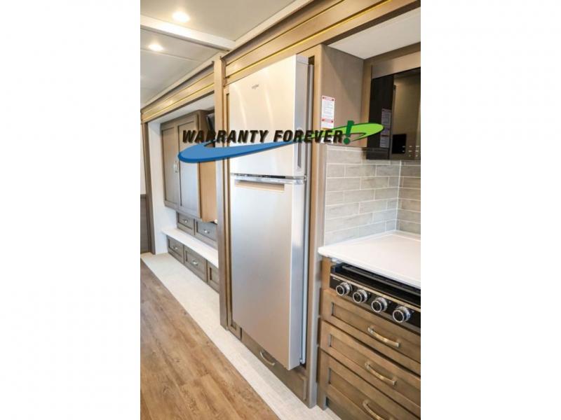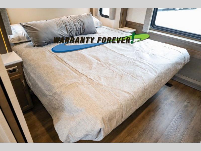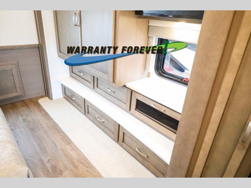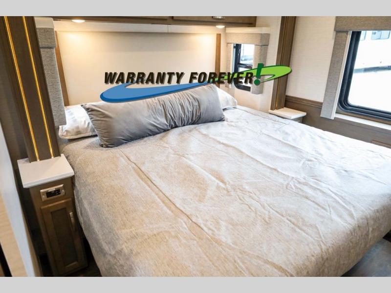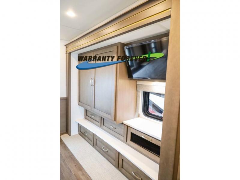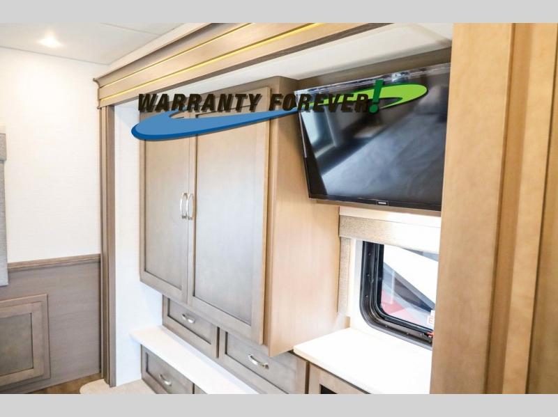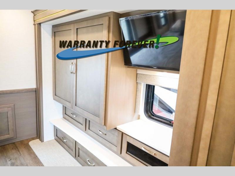 Make each trip luxurious in this spacious coach that can sleep five to six people each night. If you're needing additional sleeping space, just choose the optional drop-down bunk above the cockpit. You will wake up feeling refreshed after sleeping on the king bed slide out, and your guests can put away their bedding after sleeping on the sofa comfort lounge and booth dinette. Breakfast can be made on the three burner cooktop or in the 30" convection microwave. You will appreciate the pantry and a Norcold 10 cu. ft. refrigerator for your food. This model also includes a shirt wardrobe in the bedroom, along with a dresser so you can bring along your favorite outfits. And you'll never go bored with Samsung LED TV's in the bedroom and living area!