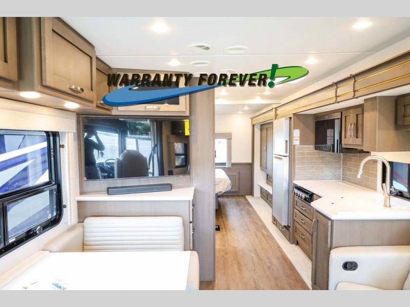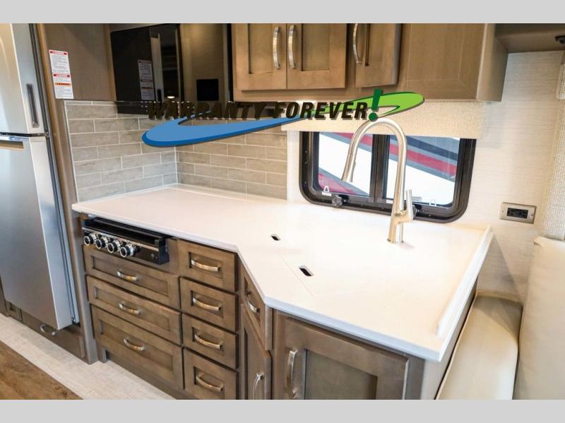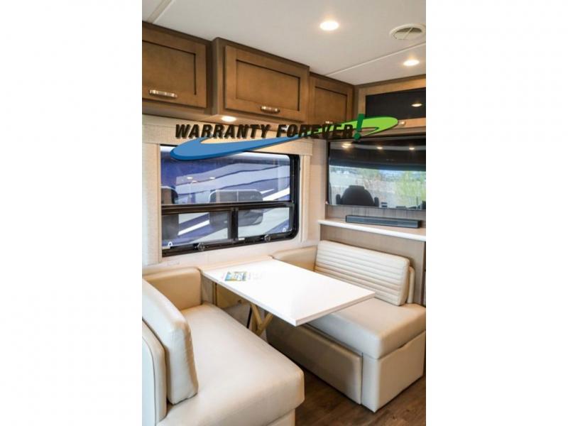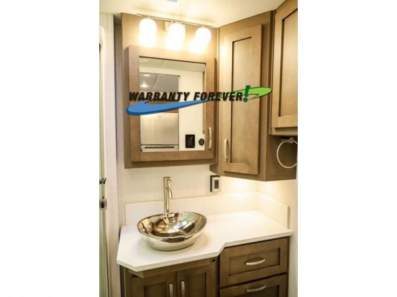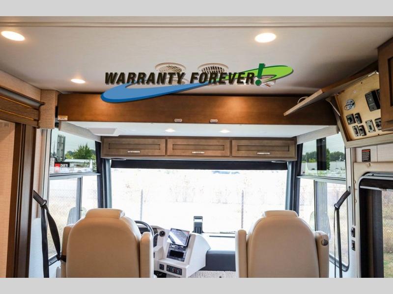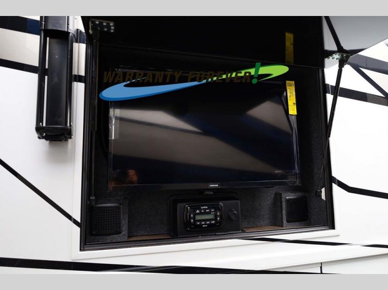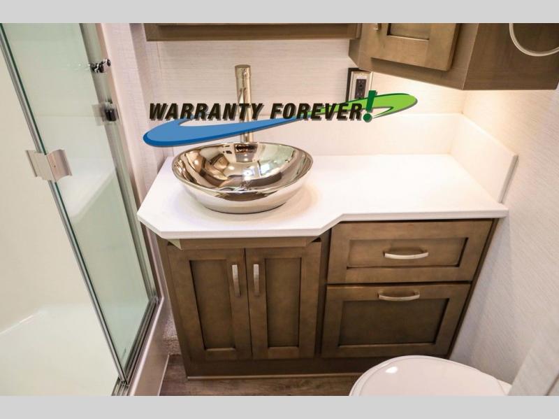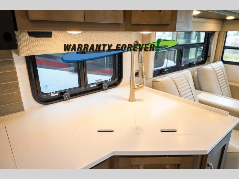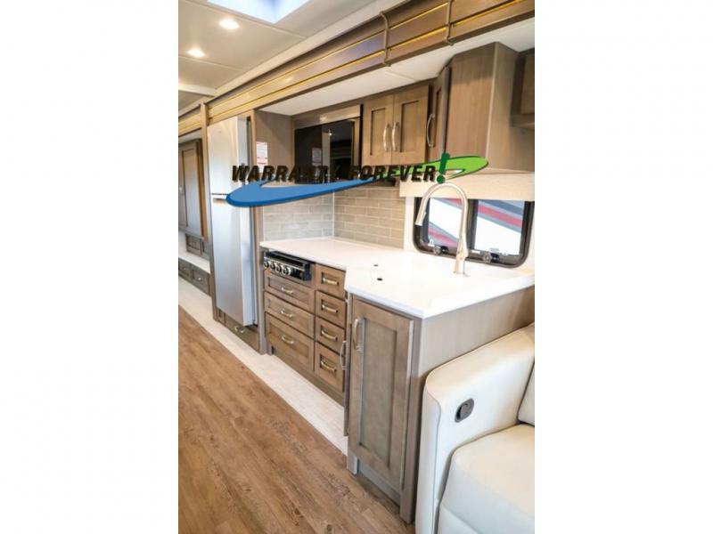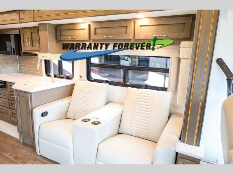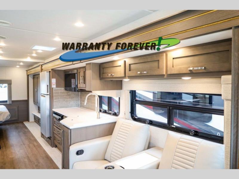 Make each trip luxurious in this spacious coach that can sleep five to six people each night. If you're needing additional sleeping space, just choose the optional drop-down bunk above the cockpit. You will wake up feeling refreshed after sleeping on the king bed slide out, and your guests can put away their bedding after sleeping on the sofa comfort lounge and booth dinette. Breakfast can be made on the three burner cooktop or in the 30" convection microwave. You will appreciate the pantry and a Norcold 10 cu. ft. refrigerator for your food. This model also includes a shirt wardrobe in the bedroom, along with a dresser so you can bring along your favorite outfits. And you'll never go bored with Samsung LED TV's in the bedroom and living area!