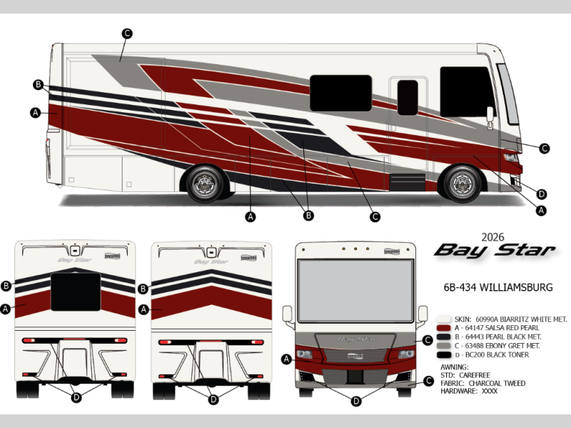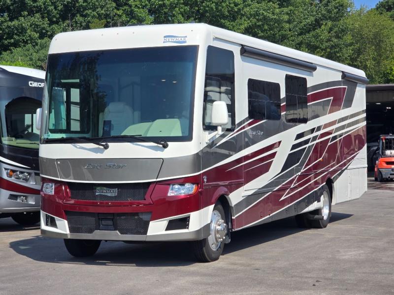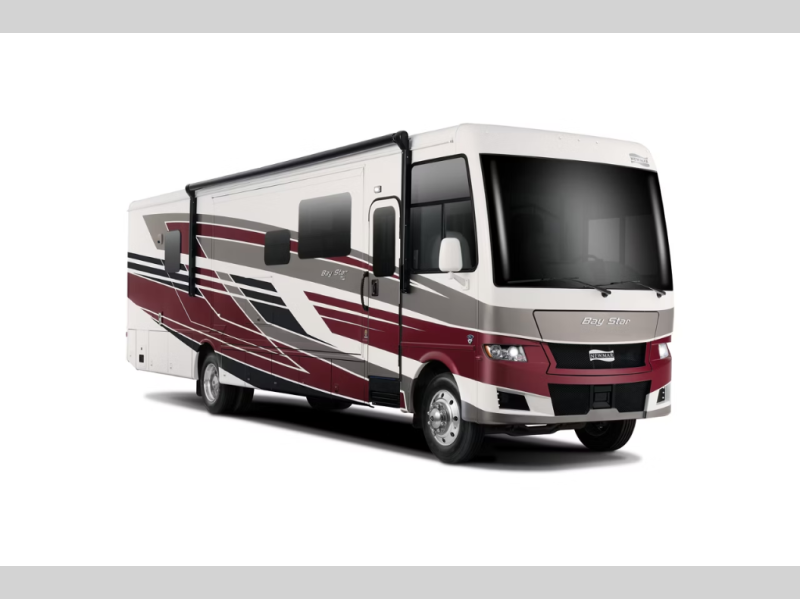 Each Bay Star Class A gas motorhome by Newmar delivers a smooth ride thanks to the standard electronic stability control, along with the 7.3-liter V8 engine with 335 HP and 468 lb./ft. of torque. The exterior is sure to turn heads with its full-paint Masterpiece Finish and new graphics packages, plus you'll have three interior decor choices and three wood choices to truly make the coach your own. Each model includes Williamsburg furniture, woven material in the slide outs, luxurious vinyl plank flooring, polished solid surface countertops in the kitchen, plus many more comforts. Head outside to find lights in the storage compartments, a 5.5kW Cummins Onan generator with remote switch, and hydraulic leveling jacks with a Bluetooth compatible touch pad for set up easy as 1-2-3! You can further customize your coach with the many options that are offered!