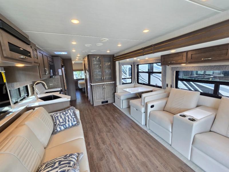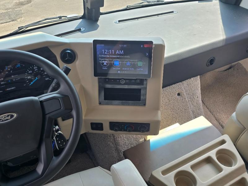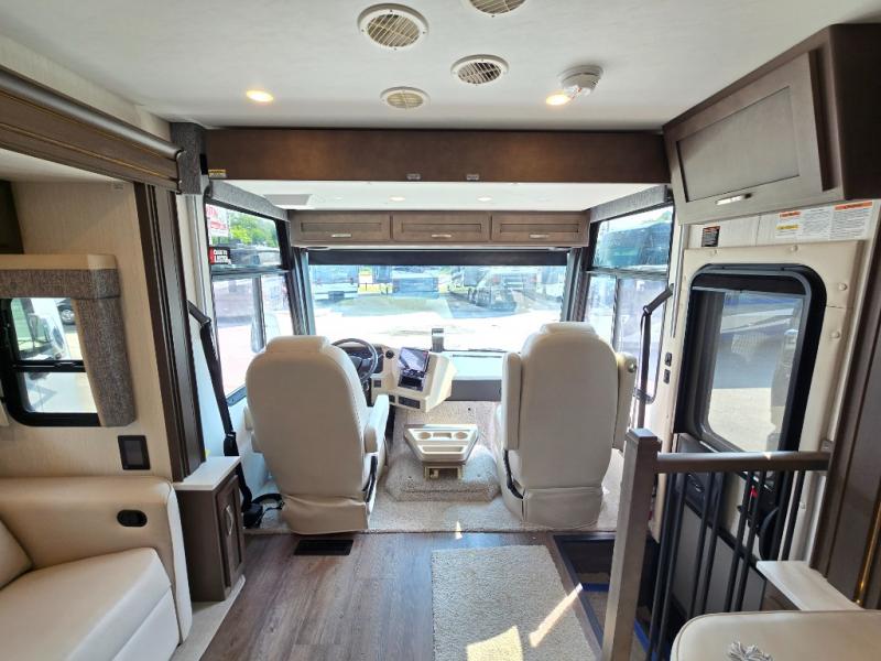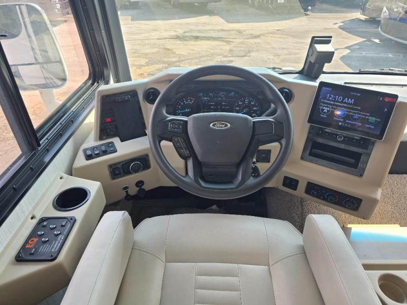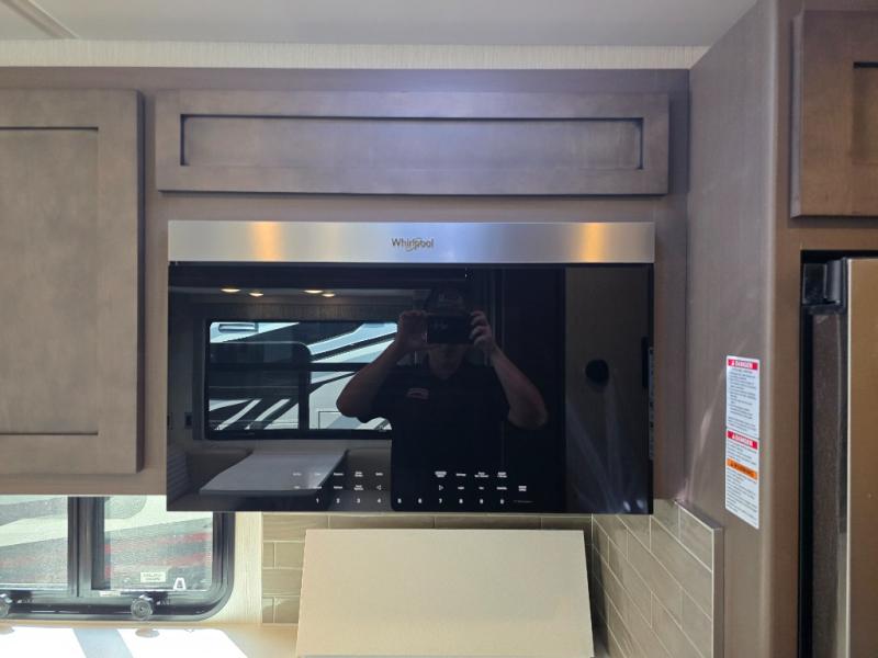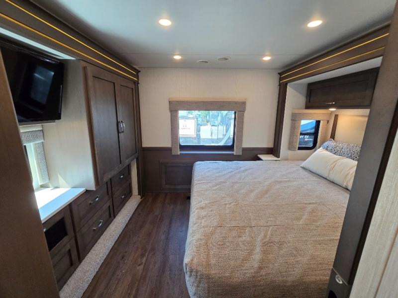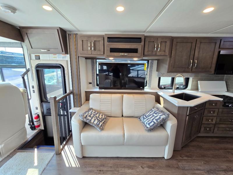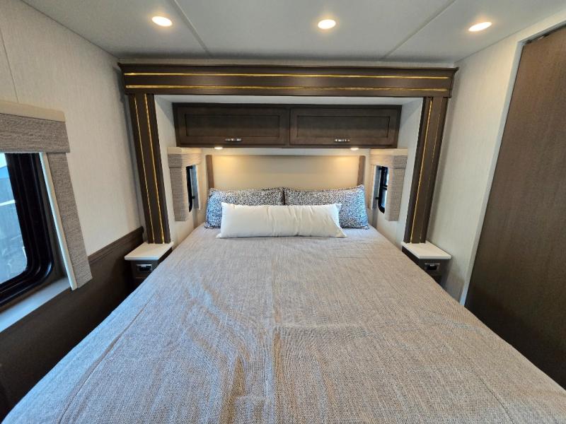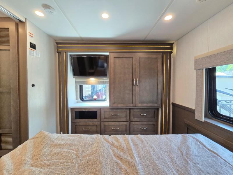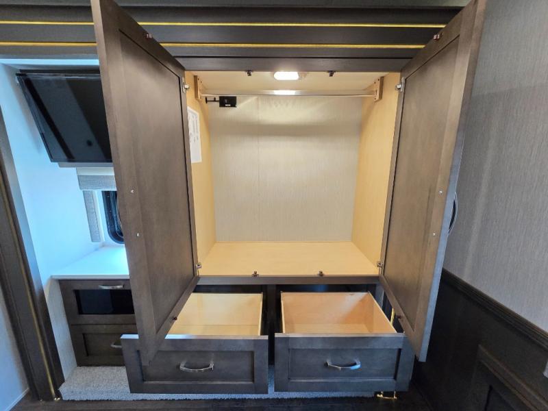 Four slide outs make this motorhome both spacious and comfortable for all your excursions! The USB charger at the passenger area will be a big plus if you need to telecommute on the way to the campground, and your guests can stay comfortable on the two comfort lounge sofas or the booth dinette. This model includes a wardrobe right across from the full bath that can be optioned out for an optional Splendide stacked washer and dryer, and the rear private bedroom will feel just like home with its king bed and shirt wardrobe. There is even a bedroom LED TV, along with the living room LED TV on power lift!