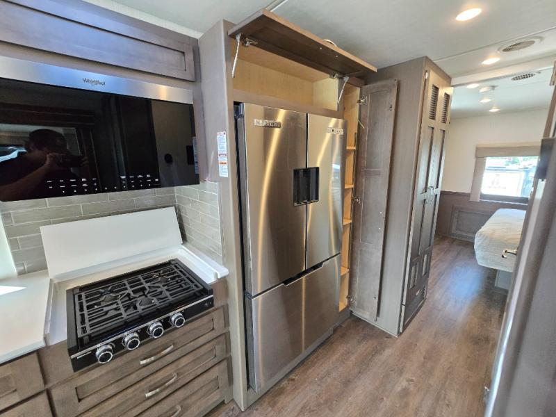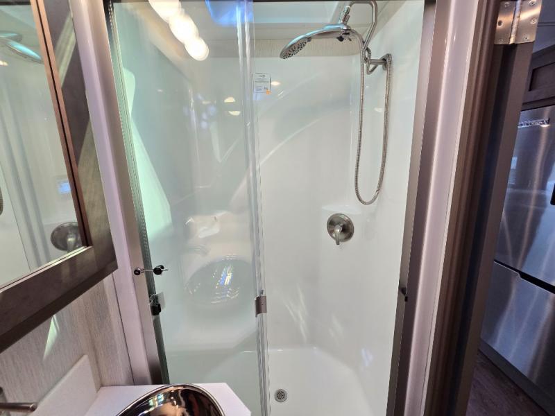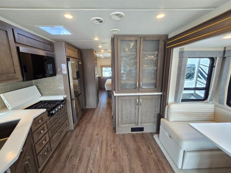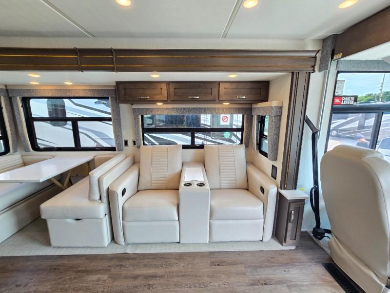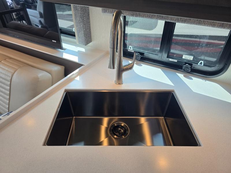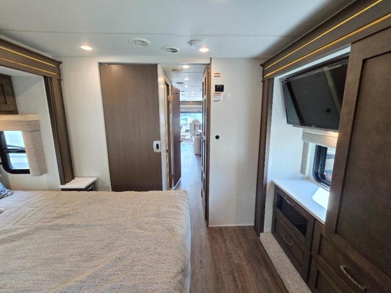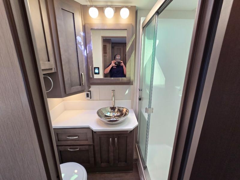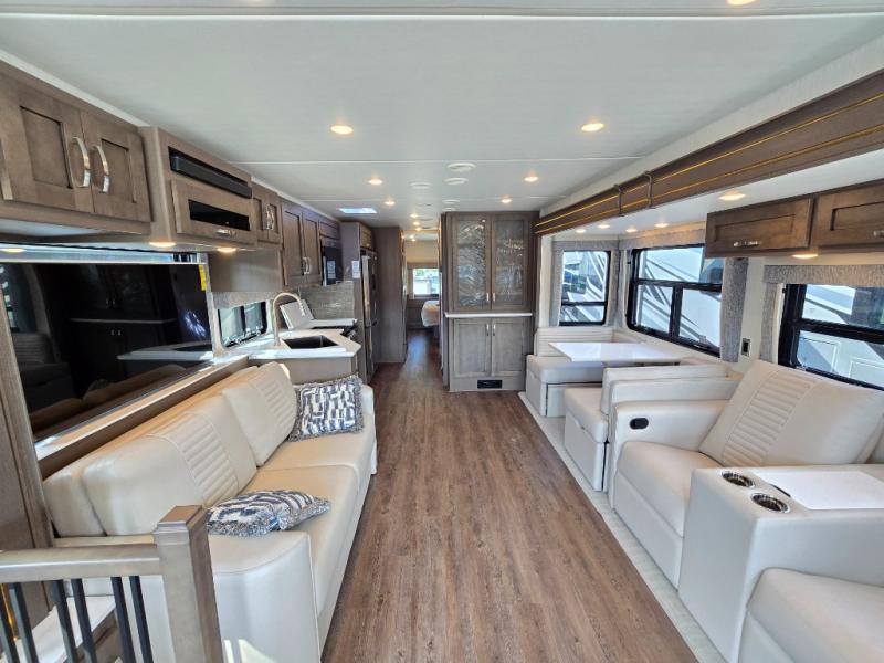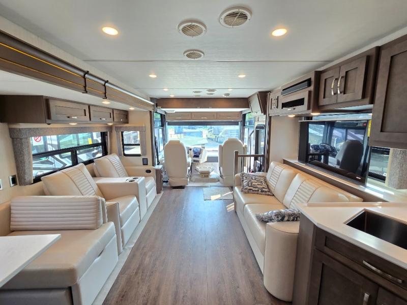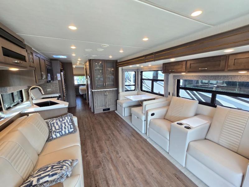 Four slide outs make this motorhome both spacious and comfortable for all your excursions! The USB charger at the passenger area will be a big plus if you need to telecommute on the way to the campground, and your guests can stay comfortable on the two comfort lounge sofas or the booth dinette. This model includes a wardrobe right across from the full bath that can be optioned out for an optional Splendide stacked washer and dryer, and the rear private bedroom will feel just like home with its king bed and shirt wardrobe. There is even a bedroom LED TV, along with the living room LED TV on power lift!