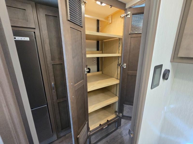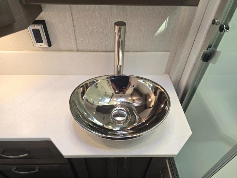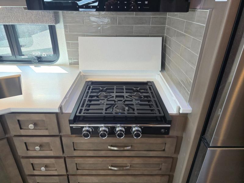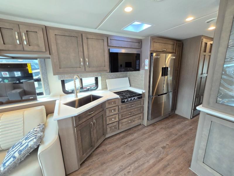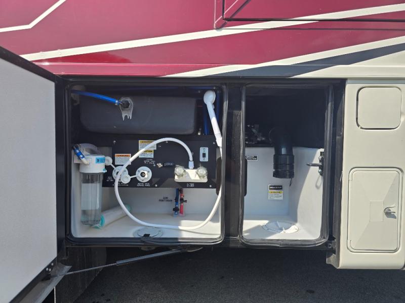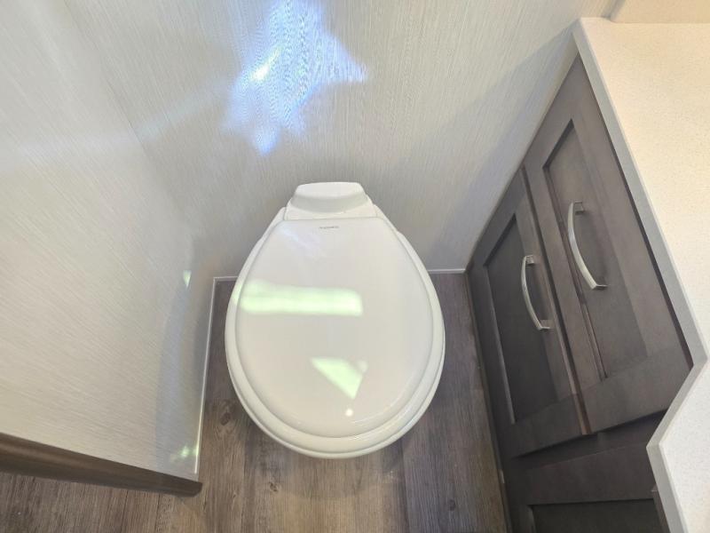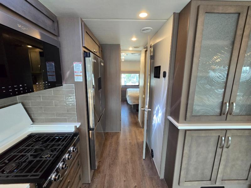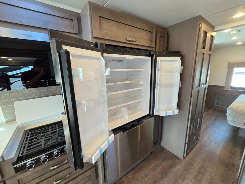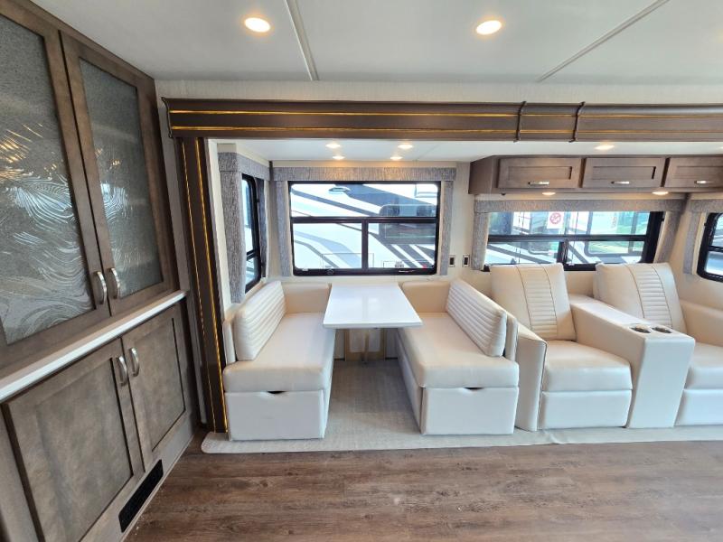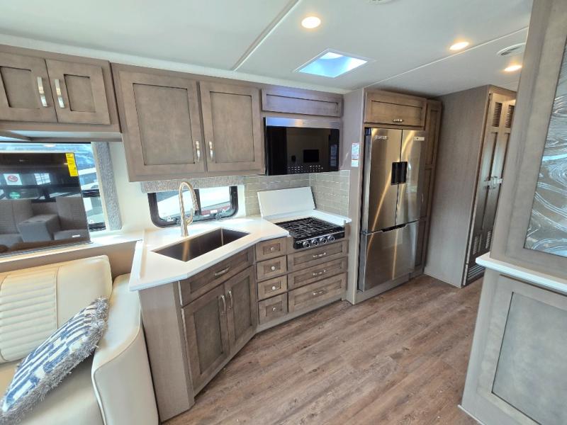 Four slide outs make this motorhome both spacious and comfortable for all your excursions! The USB charger at the passenger area will be a big plus if you need to telecommute on the way to the campground, and your guests can stay comfortable on the two comfort lounge sofas or the booth dinette. This model includes a wardrobe right across from the full bath that can be optioned out for an optional Splendide stacked washer and dryer, and the rear private bedroom will feel just like home with its king bed and shirt wardrobe. There is even a bedroom LED TV, along with the living room LED TV on power lift!