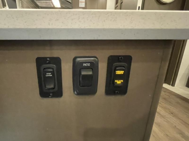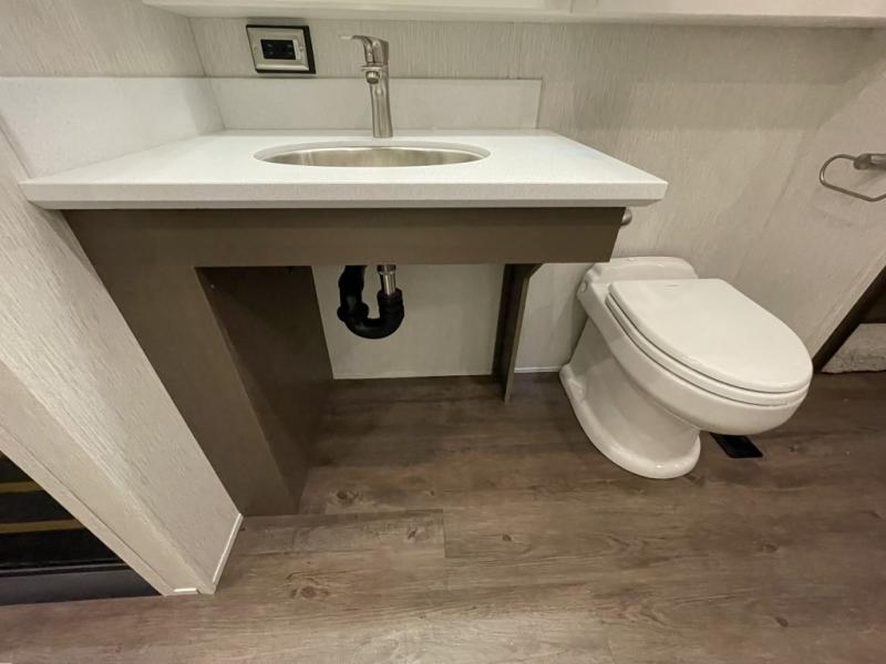 Inside, the kitchen is equipped with a convection microwave below the cooktop and a 10 cubic foot refrigerator. The booth dinette is designed with room for a wheelchair, and the comfort lounge sofa offers a relaxing place to unwind. The rear bedroom features a queen bed slide out, Samsung LED TV, and a dresser for storage. A roll in shower and roll under sink make daily routines convenient and barrier free.