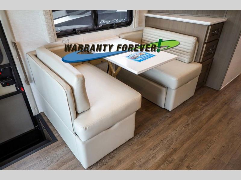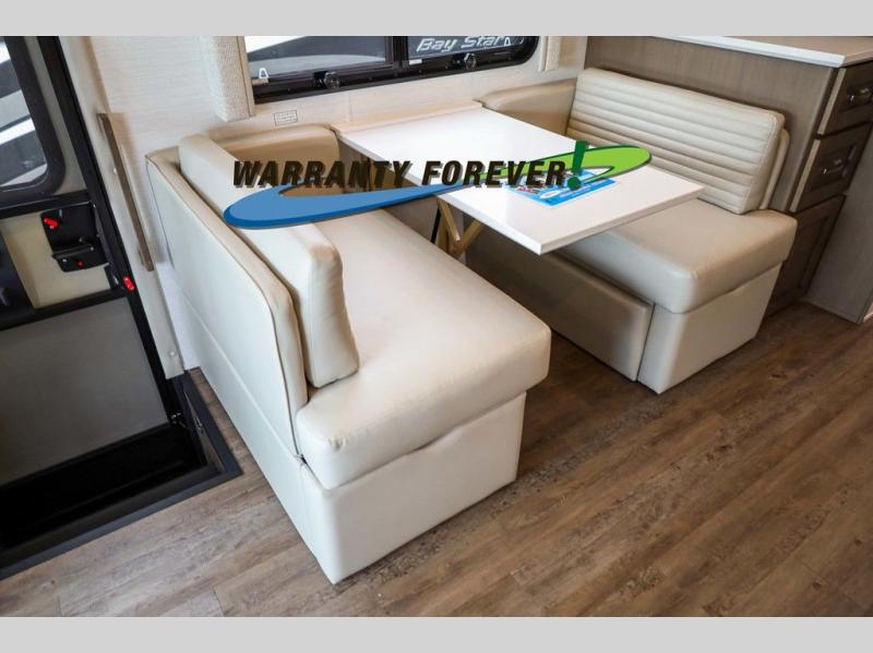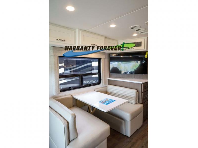 This Bay Star Sport is beaming with features from top to bottom. You will find plenty of storage space for all your items, including front overhead storage, a kitchen pantry, plus a dresser and a shirt wardrobe in the rear private bedroom. The queen bed slide out is sure to provide a great night's rest, and the full-wall slide will open up the whole coach to make it feel more like home. After a day outdoors, your group can watch a movie on the Samsung LED TV in the living area while relaxing on the sofa comfort lounge, or you might just want to play a game at the booth dinette that doubles as sleeping space!