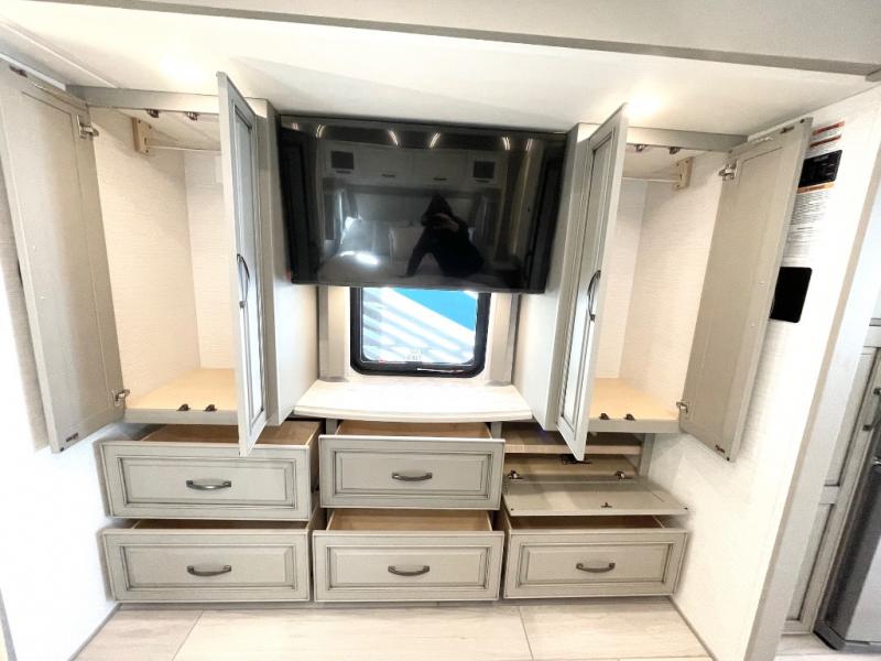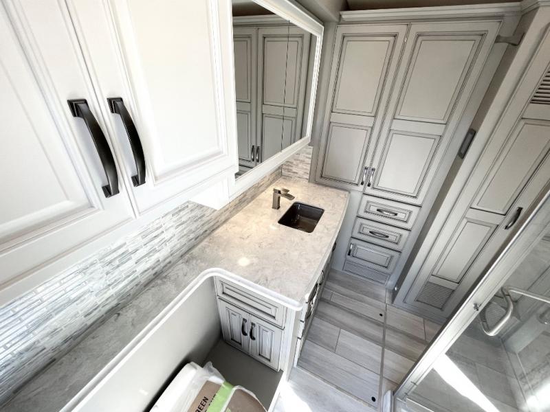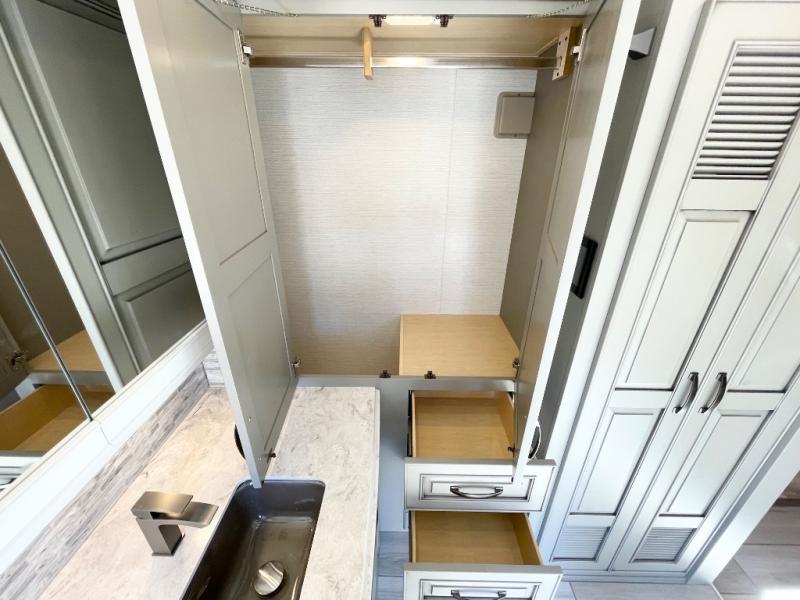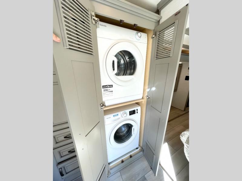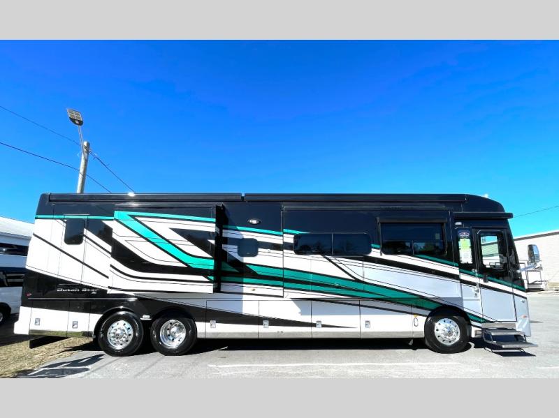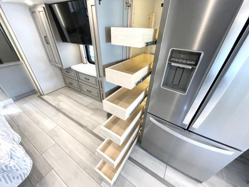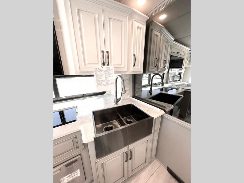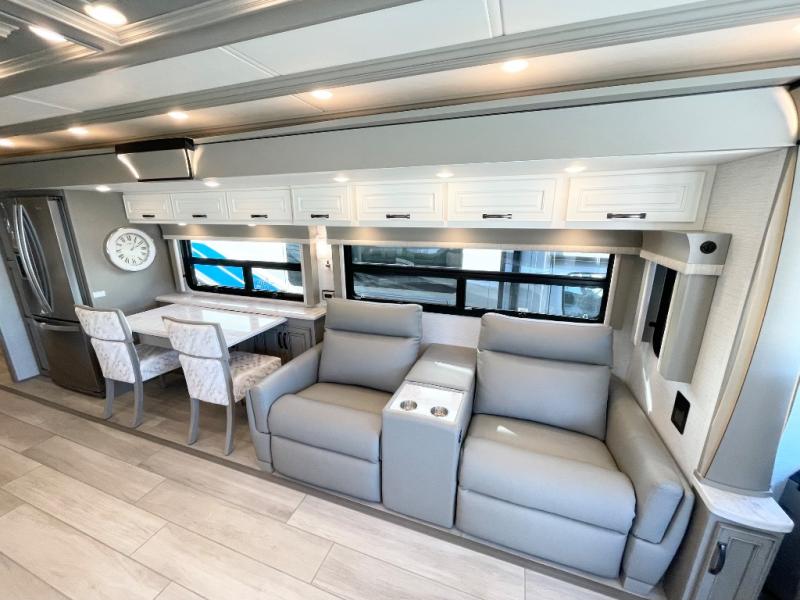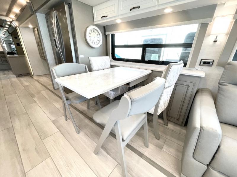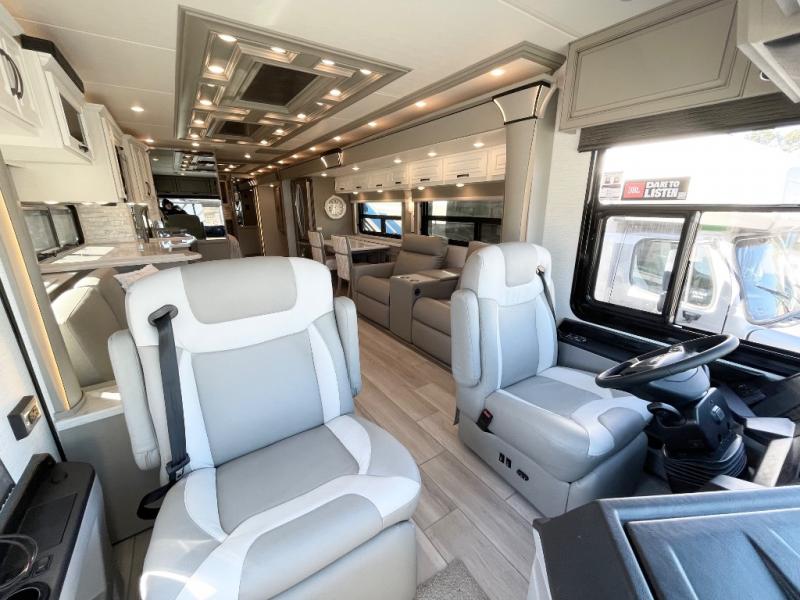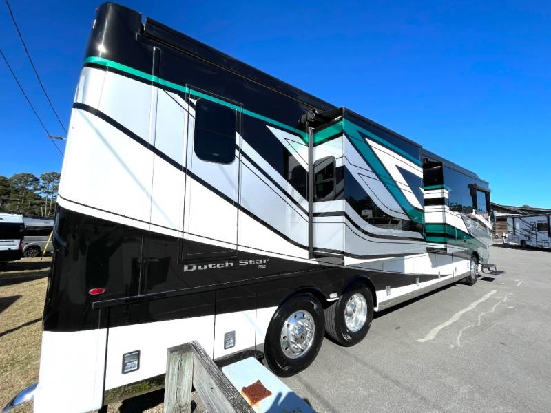 Are you looking to upgrade your motorhome to a more luxurious unit? Look no further than this Dutch Star Class A diesel motorhome. You will love the space provided by the full-wall slide and two additional slides, plus the rear bath cathedral ceiling will add extra height. Take a rest on the pillowtop king bed or relax on the hide-a-bed sofa. There is a passenger workstation and a hide-a-leaf dinette if you're needing to get some work done while on vacation, and the power awning outside will provide shade if you're wanting to work in fresh air. Don't worry about stopping for food because this model includes a Whirlpool 19.7-cu. ft. refrigerator that will allow you to stock up for the week, and you can cook with the all-electric induction cooktop or stainless steel convection microwave with an air fryer feature! Specifications shown are with the standard Freightliner tag axle chassis. See dealer for details if optional Spartan K2 tag axle chassis is selected.