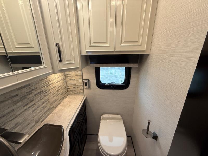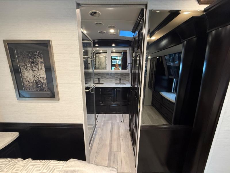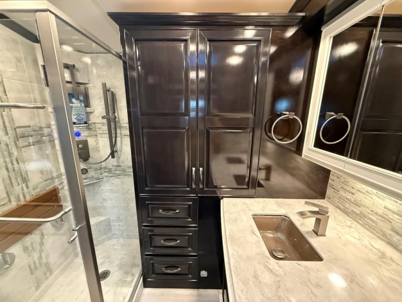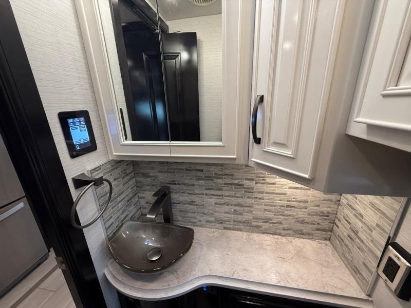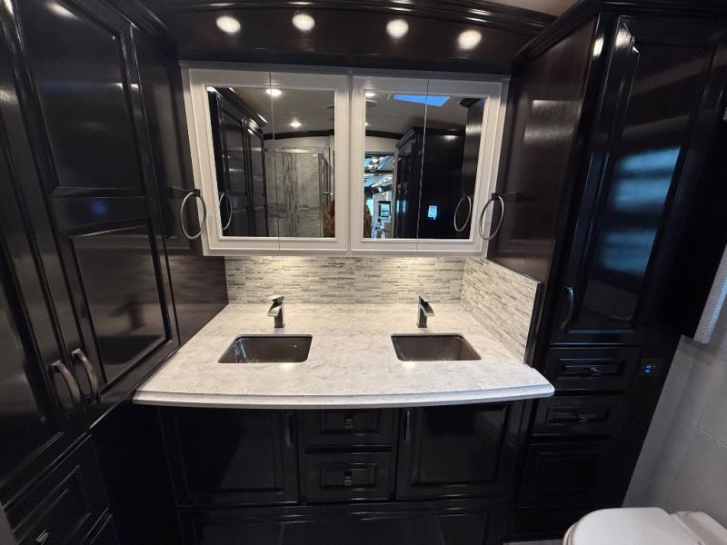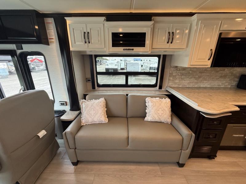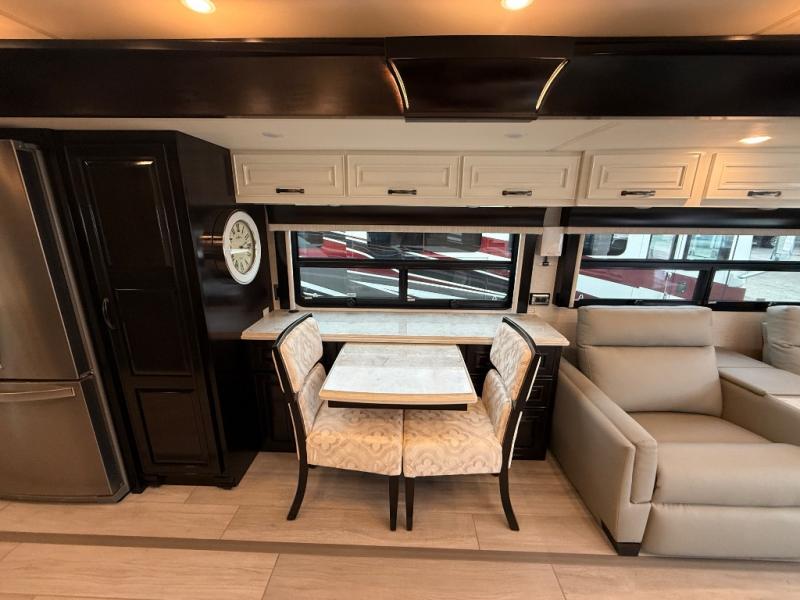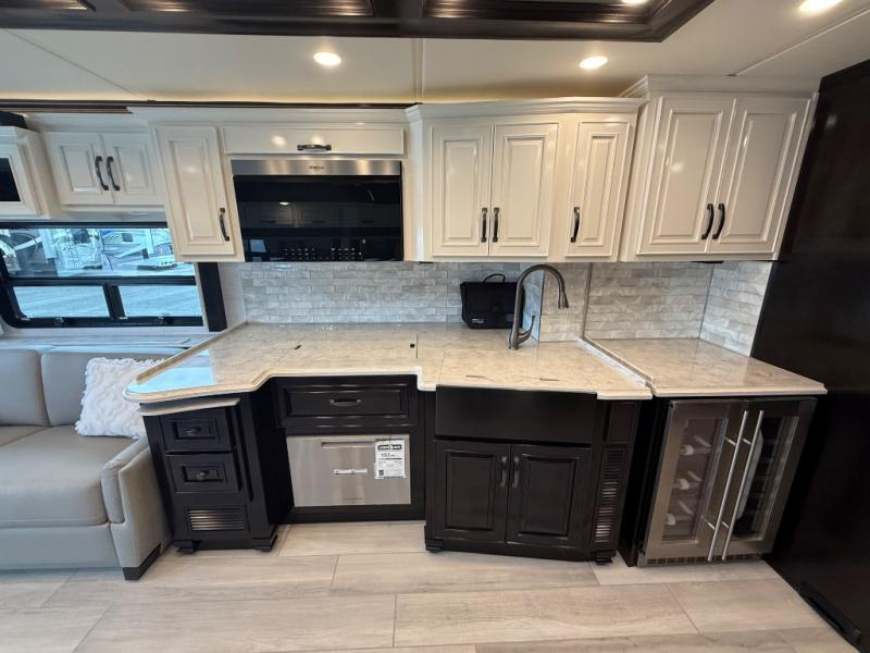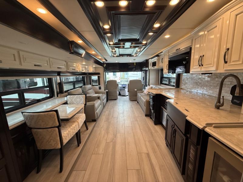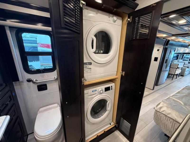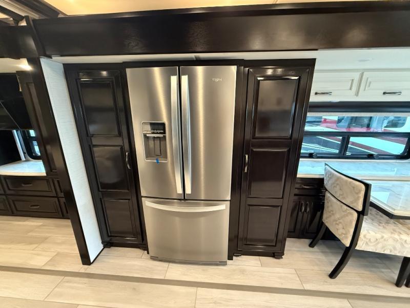 Entertain all year round in this luxurious Dutch Star Class A diesel motorhome! The spacious living room with two sofas leads into a well-equipped kitchen with a Whirlpool refrigerator, all-electric flush mount induction cooktop, and convection microwave with an air fryer feature. A pull-out cabinet beneath the counter offers extra space. All this interior space is possible due to the full-wall slide and two additional slides. At the rear, you'll find a private suite with a king bed, full bath with shower, wardrobes, dual sinks, and space for an optional washer and dryer. An additional half bath means you won't have to share with guests. Specifications shown are with the standard Freightliner tag axle chassis. See dealer for details if optional Spartan K2 tag axke chassis is selected.