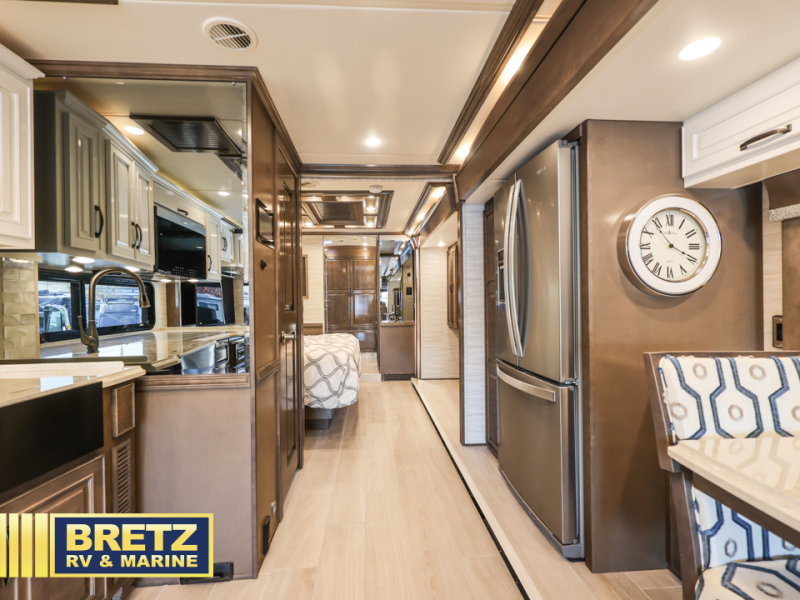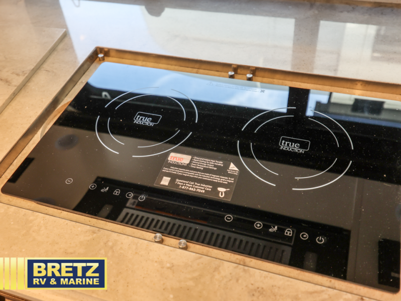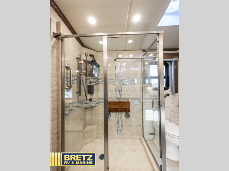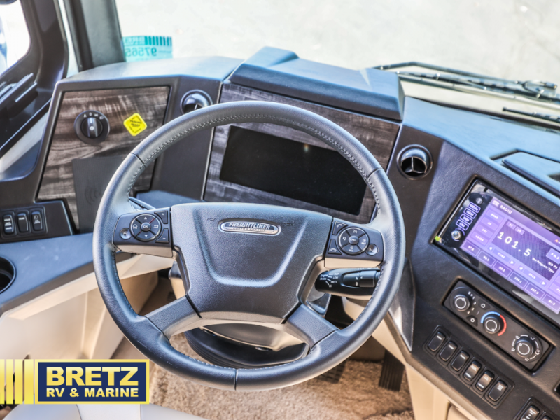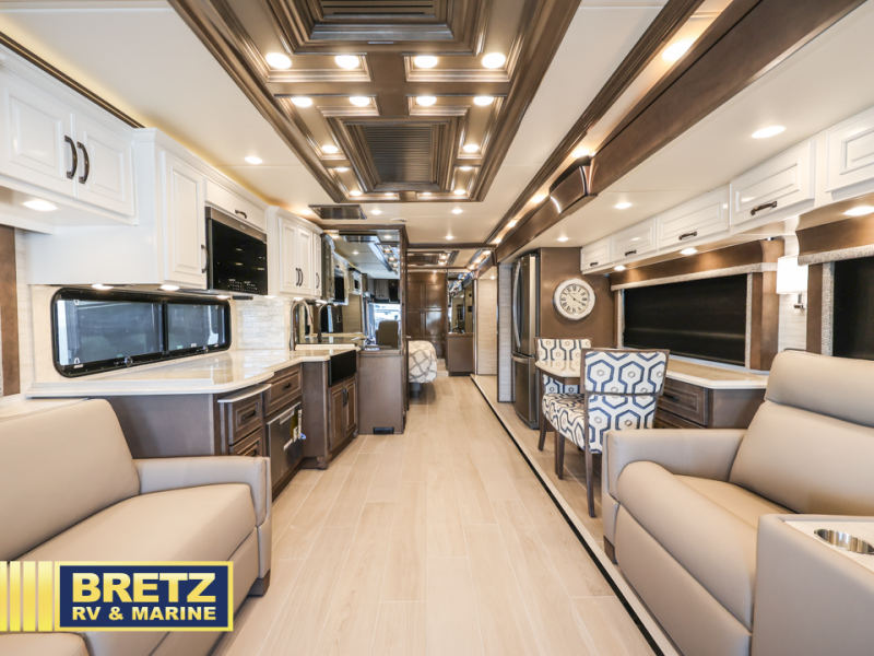 Luxury is waiting for you in this spacious Dutch Star Class A diesel motorhome that can comfortably sleep six each night. The full-wall slide plus two additional slides will open up the whole unit for a more at-home feel. Relax on the hide-a-bed sofa or read a book on the jackknife sofa. The hide-a-leaf dinette will be the perfect place to catch up on some work while you're away from home. Easily prepare breakfast, lunch, and dinner on the all-electric induction cooktop, or use the convenient stainless steel convection microwave with an air fryer feature. This model features a master suite with a pillowtop king bed, dual wardrobes and a dresser, plus an LED TV. You will love the rear bath cathedral ceiling that will add additional height, plus there is plenty of storage space and two bath sinks so that you and your spouse can freshen up at once! Specifications shown are with the standard Freightliner tag axle chassis. See dealer for details if optional Spartan K2 tag axle chassis is selected.