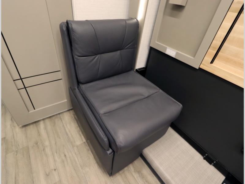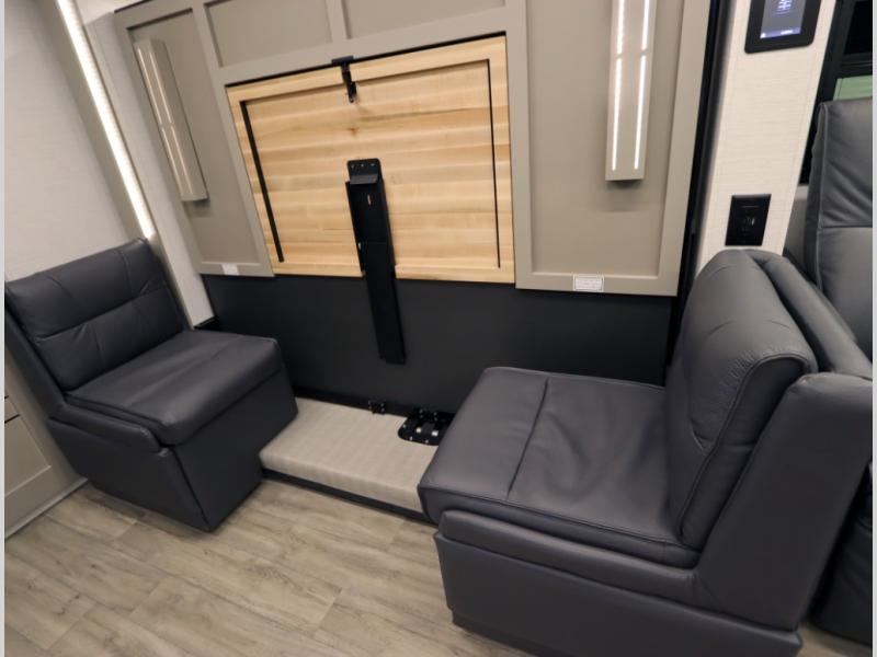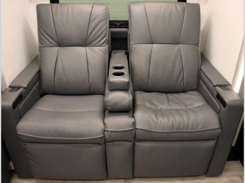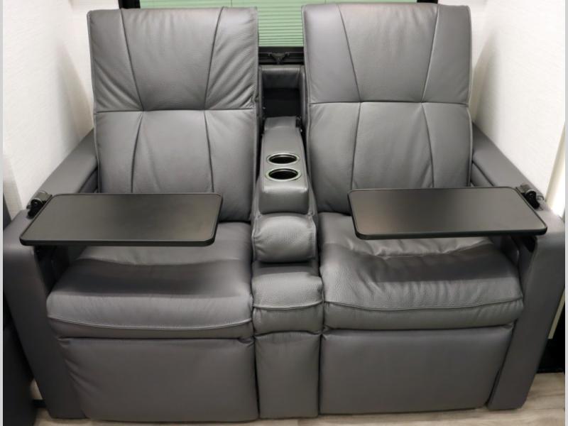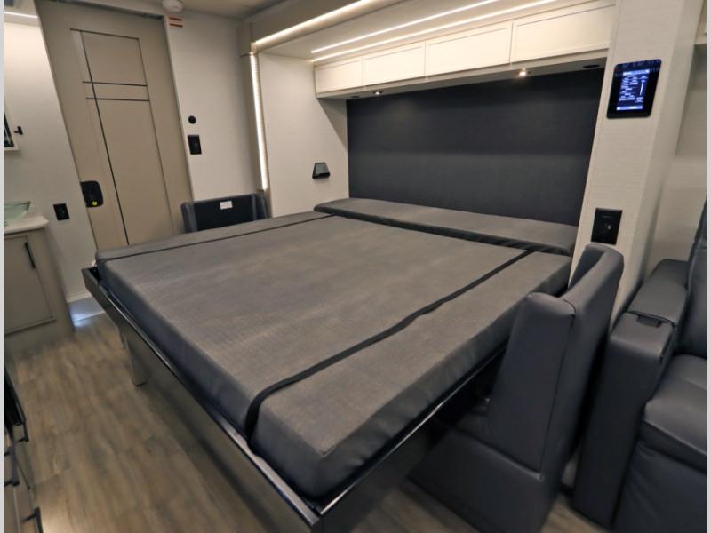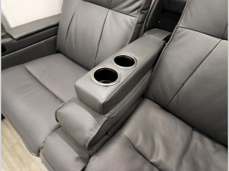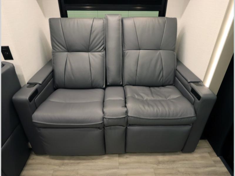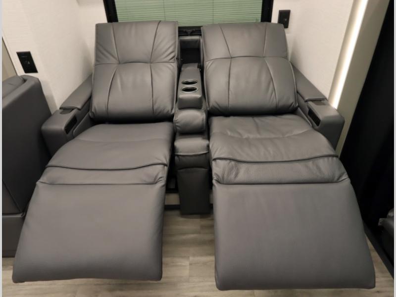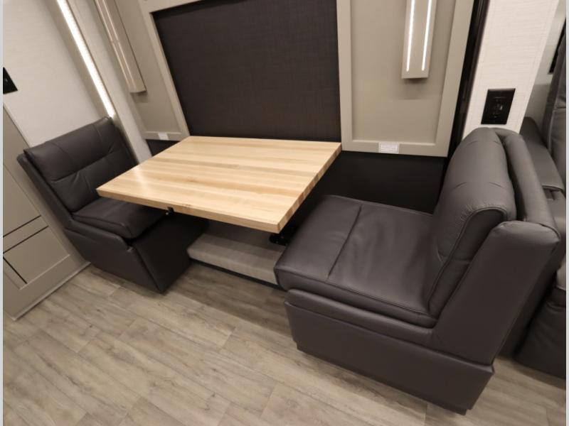 4. Optional interior floorplan upgrade with Powered Villa Italian leather theater seating, 63 in, that includes powered recline and powered headrests. This then upgrades sleeping with a powered King Murphy Bed with integrated dinette and folding table