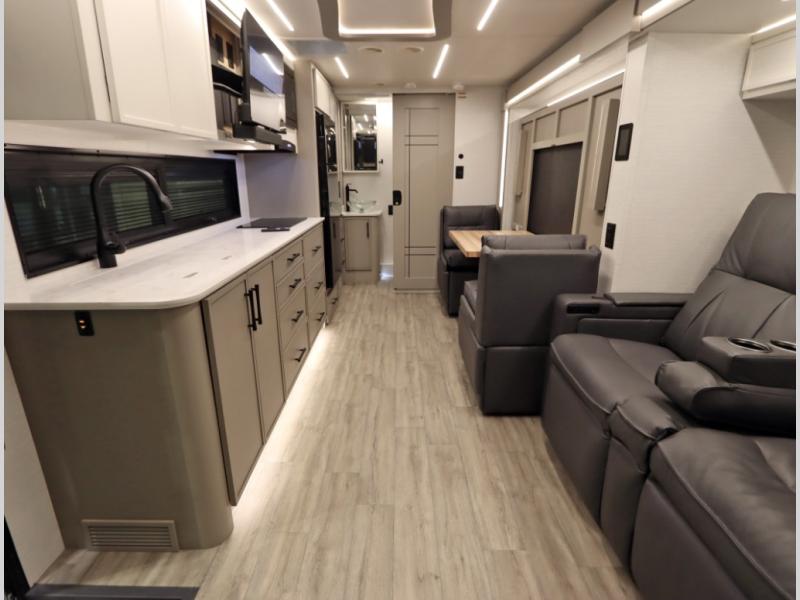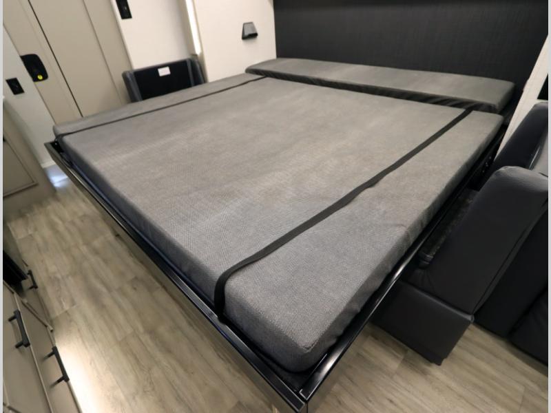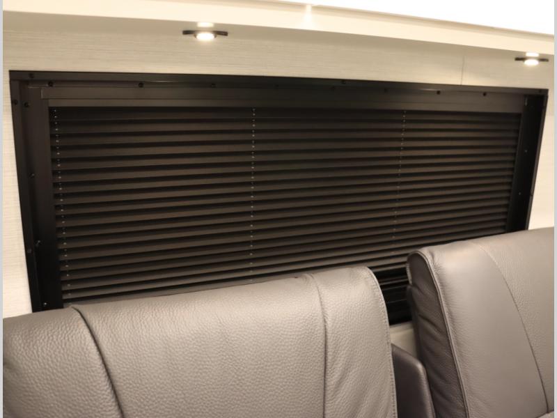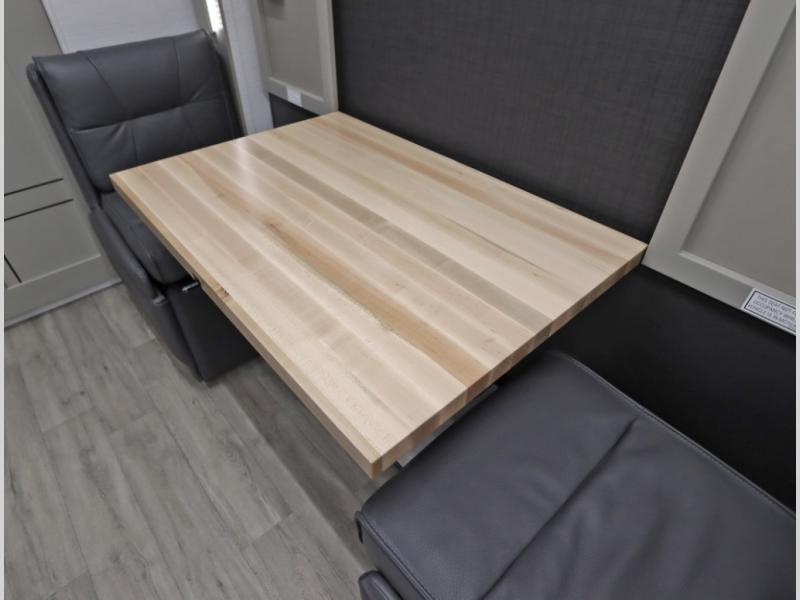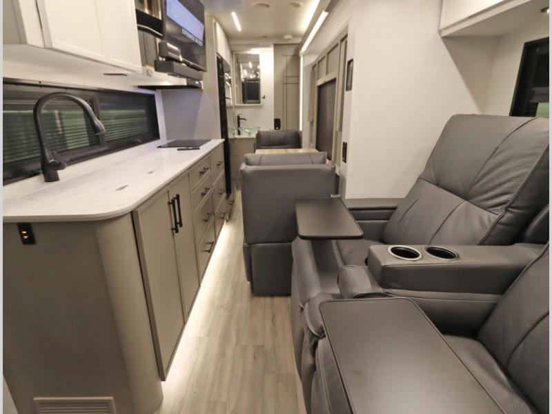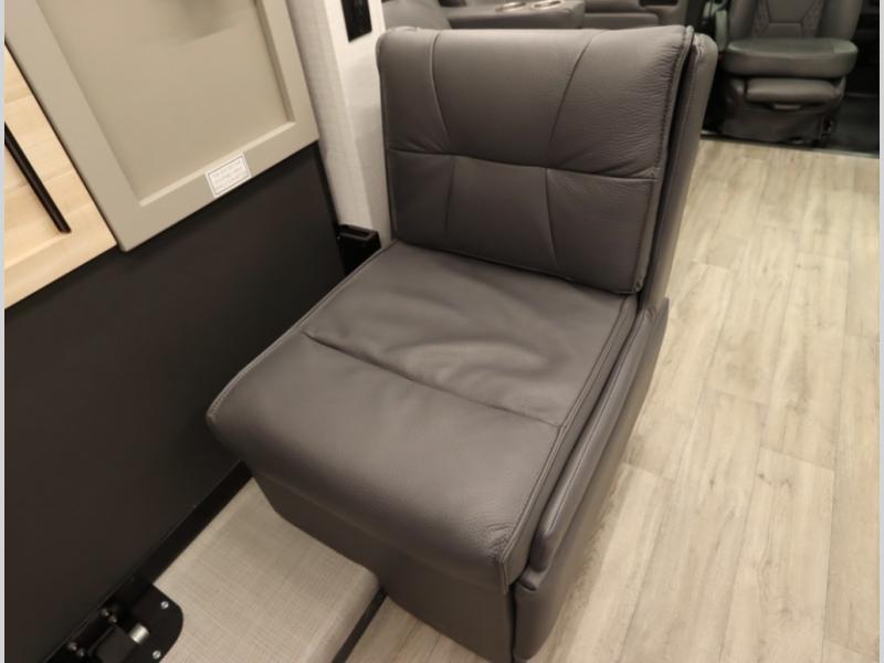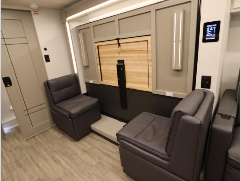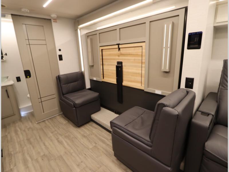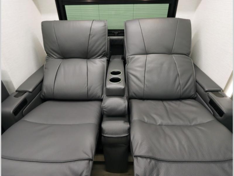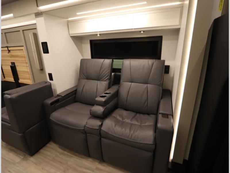 4. Optional interior floorplan upgrade with Powered Villa Italian leather theater seating, 63 in, that includes powered recline and powered headrests. This then upgrades sleeping with a powered King Murphy Bed with integrated dinette and folding table