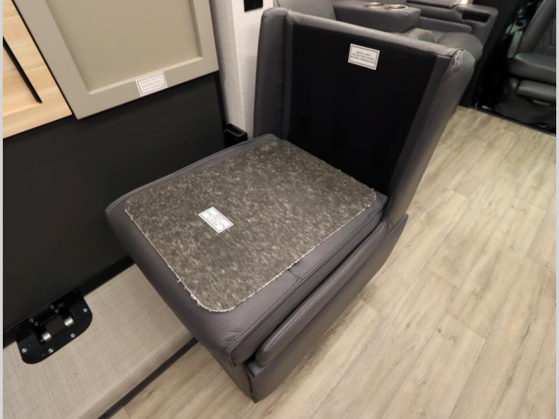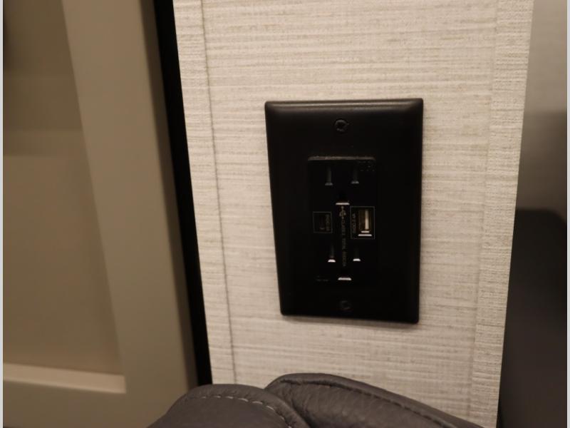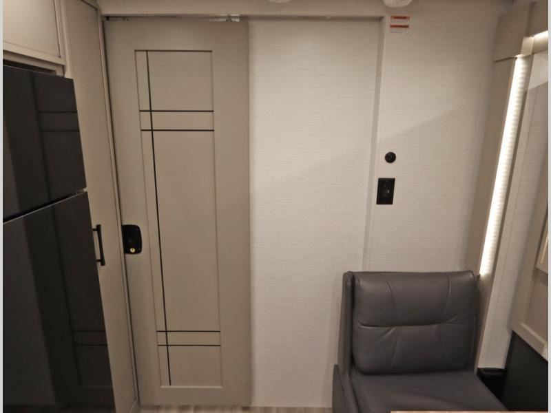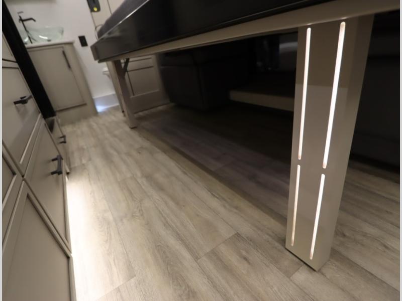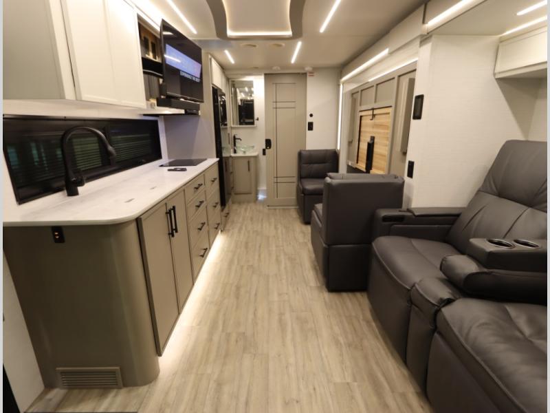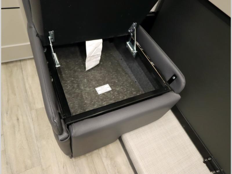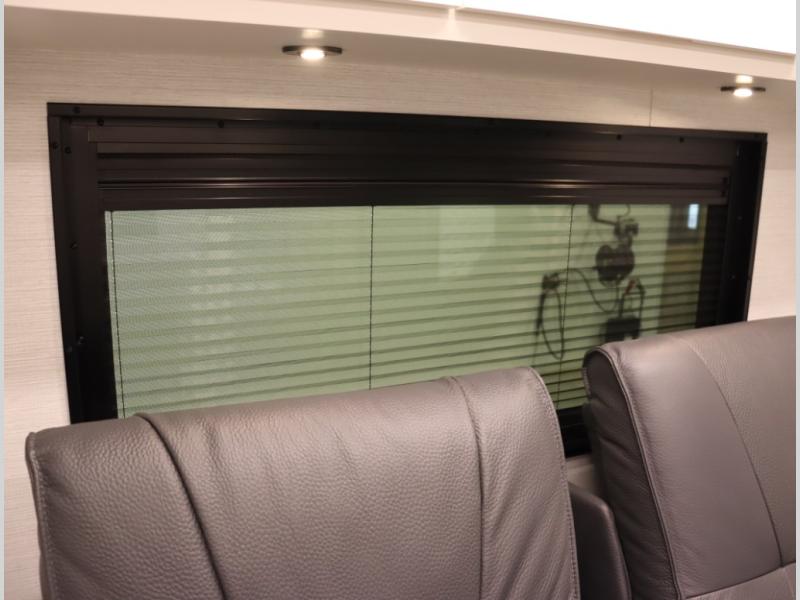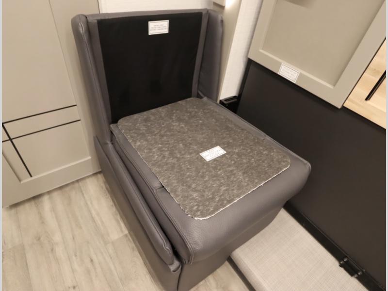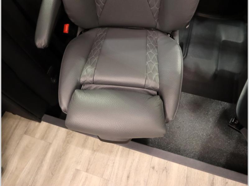 4. Optional interior floorplan upgrade with Powered Villa Italian leather theater seating, 63 in, that includes powered recline and powered headrests. This then upgrades sleeping with a powered King Murphy Bed with integrated dinette and folding table