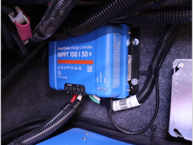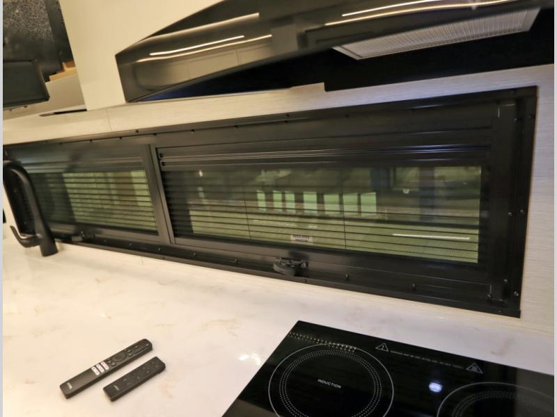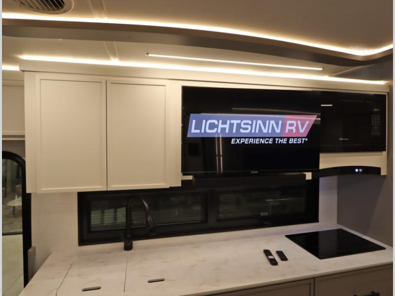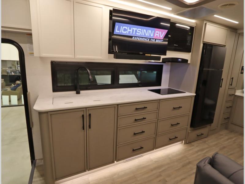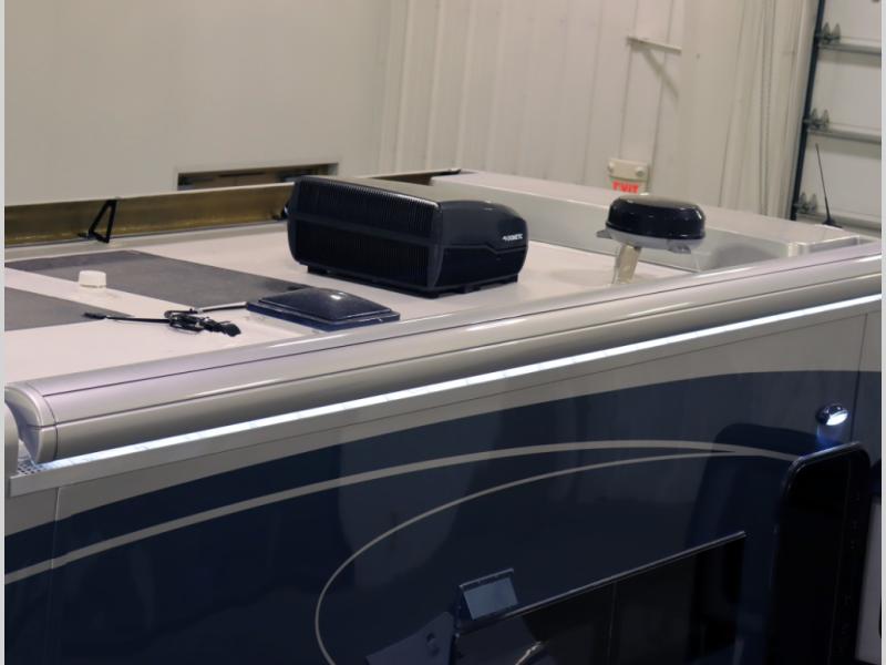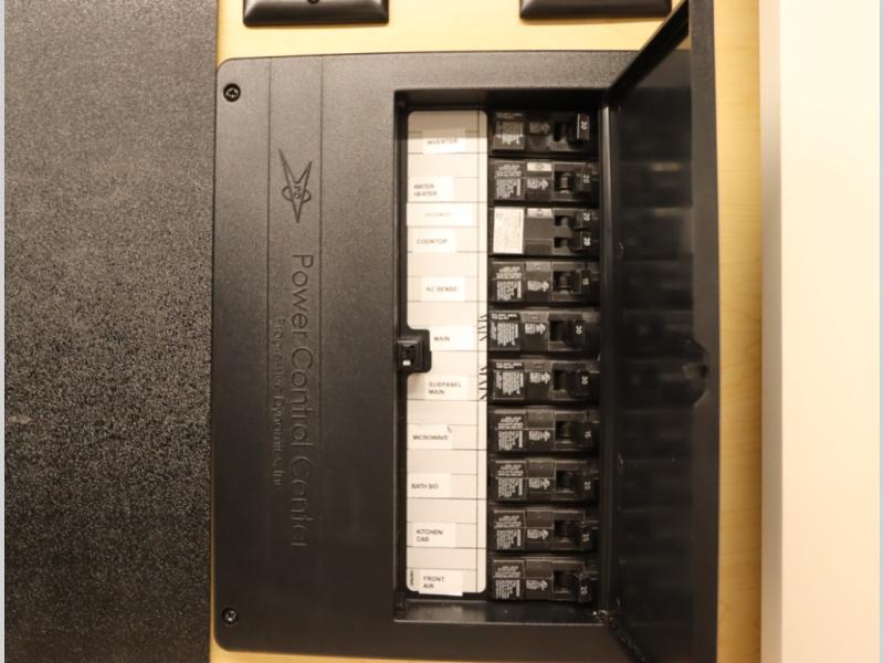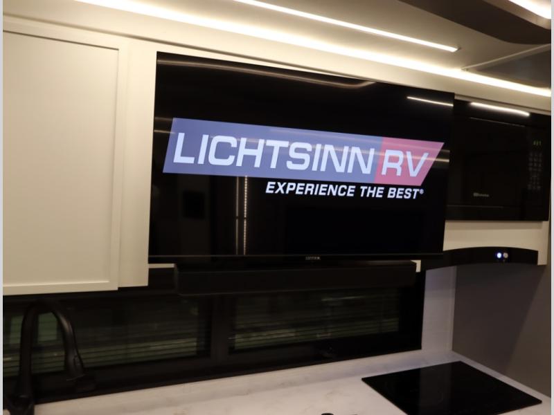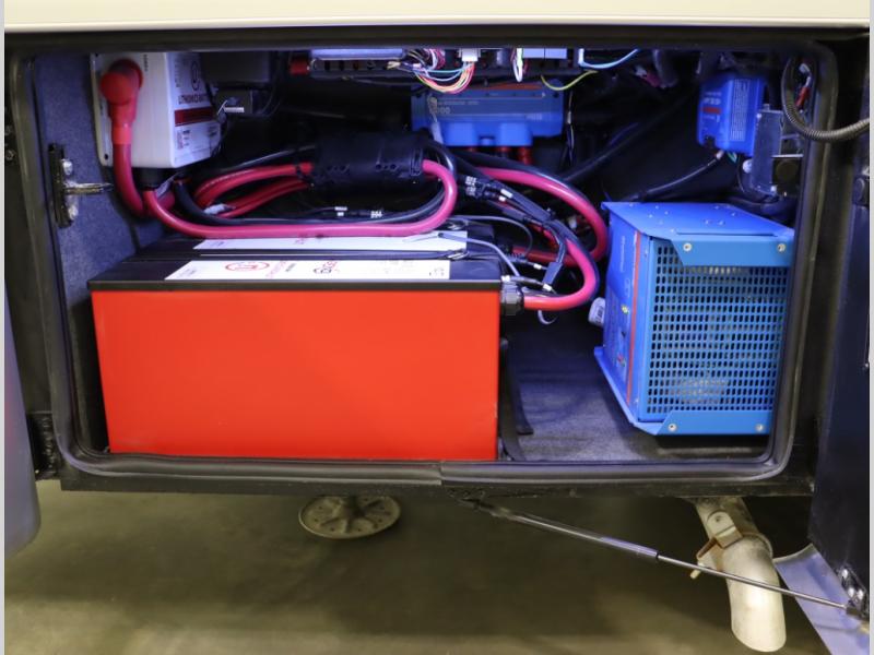 5. An all electric coach, with no LP on board, powered by Lithionics Lithium Ion batteries featuring NeverDie reserve technology, UL1973 certified for safety, with 12,399 watt hours, 960 ah, paired with a Victron 3,000 watt pure sine wave inverter, powering electrical components including the AC, Timberline hydronic heat and hot water delivery, and induction cooktop. Also includes a second under the hood alternator to quickly recharge Lithionics batteries, in addition to charging when using shoreline electricity and thru 2 flexible 120 watt solar panels on roof, with an MPPT solar charge controller, expandable rooftop or thru driver side ground level quick port.