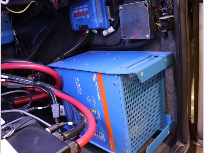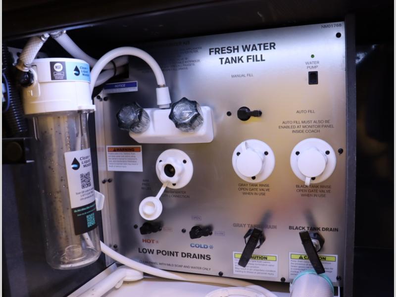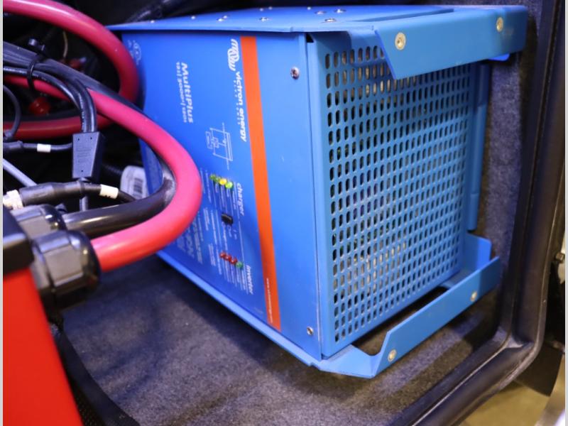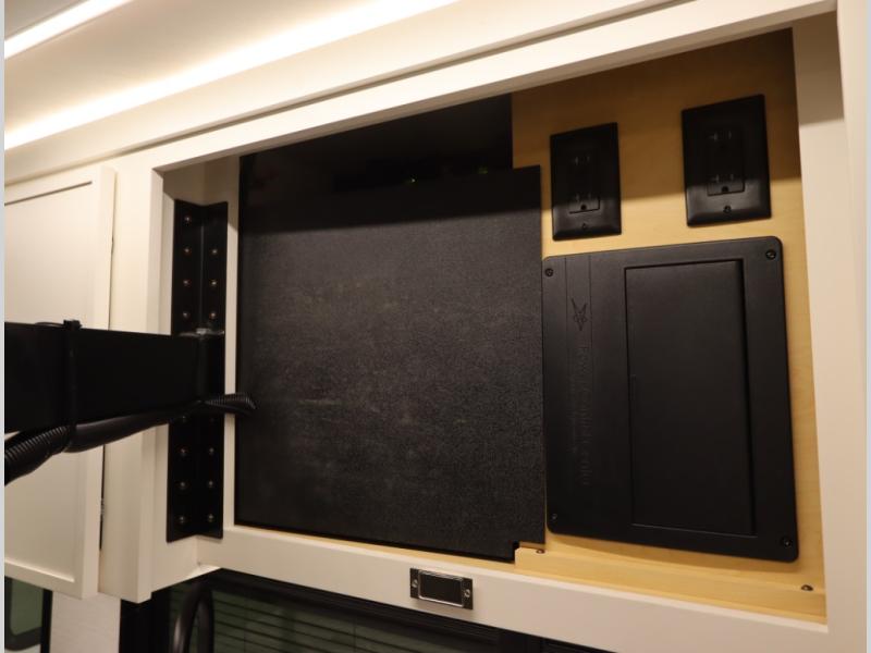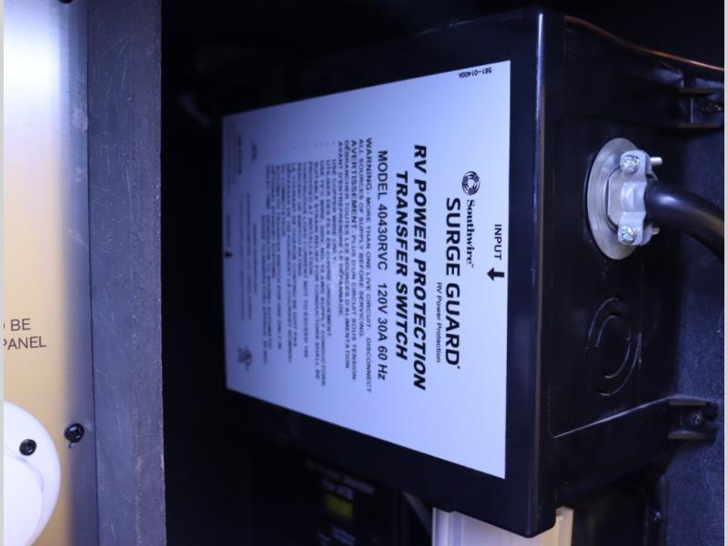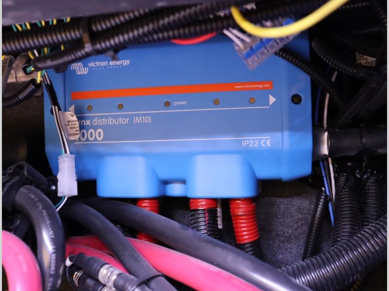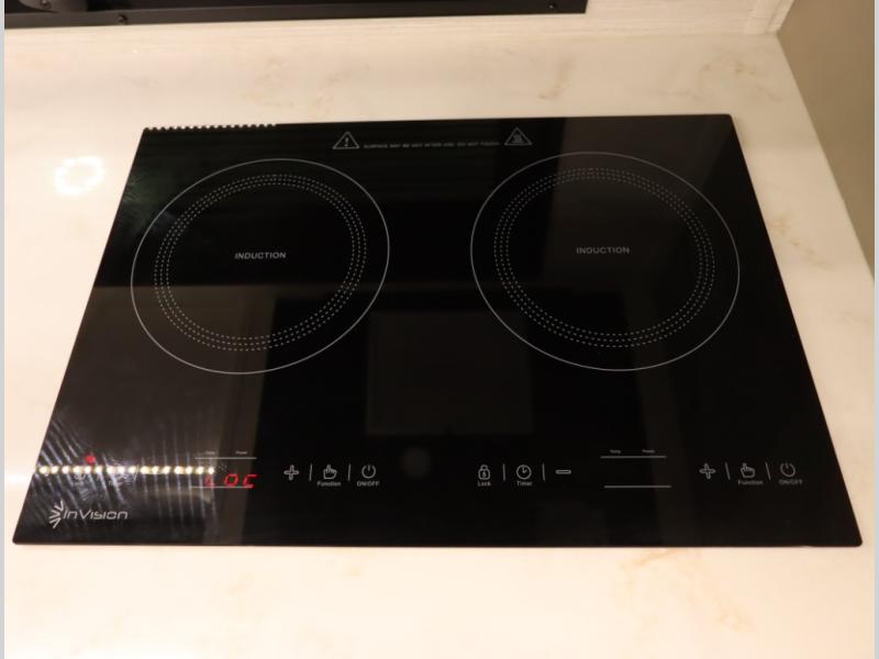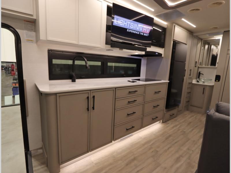 5. An all electric coach, with no LP on board, powered by Lithionics Lithium Ion batteries featuring NeverDie reserve technology, UL1973 certified for safety, with 12,399 watt hours, 960 ah, paired with a Victron 3,000 watt pure sine wave inverter, powering electrical components including the AC, Timberline hydronic heat and hot water delivery, and induction cooktop. Also includes a second under the hood alternator to quickly recharge Lithionics batteries, in addition to charging when using shoreline electricity and thru 2 flexible 120 watt solar panels on roof, with an MPPT solar charge controller, expandable rooftop or thru driver side ground level quick port.