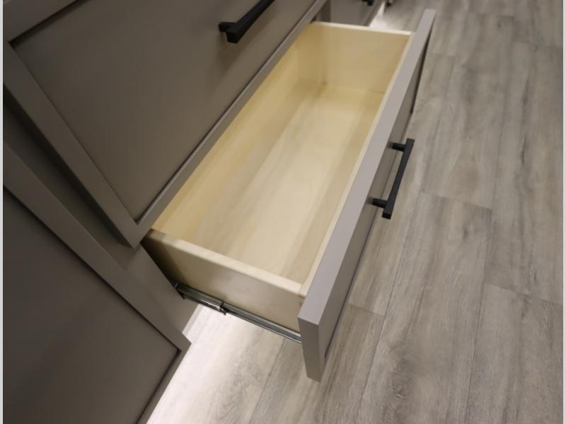 3. Rizo Softwoods paired with Hardwood cabinetry with dovetail construction, Summit White Matte Uppers with soft close hinges, with lower Morel Maple hardwood cabinetry with soft close hinges, alongside Basecamp flooring