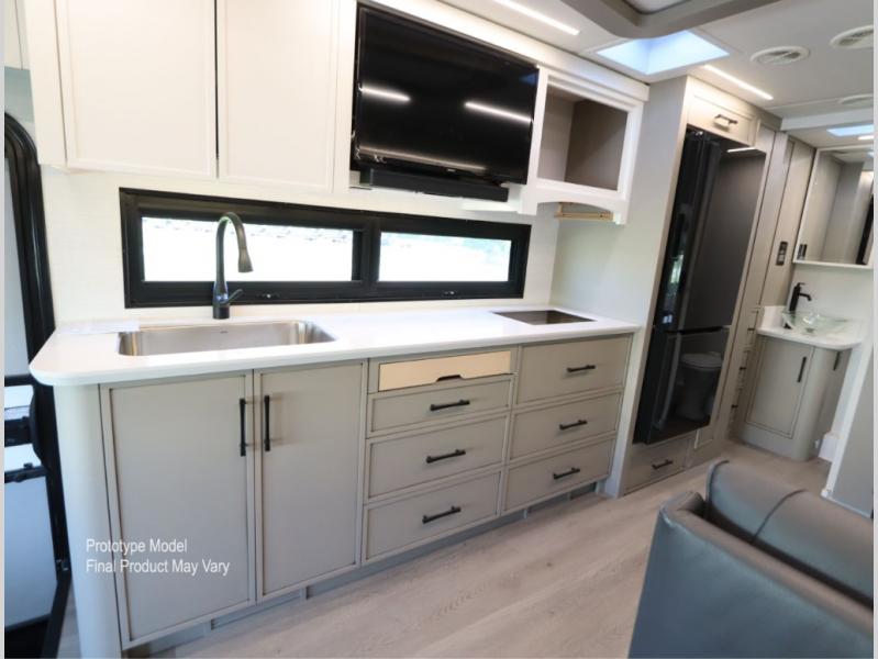 5. An all electric coach, with no LP on board, powered by Lithionics Lithium Ion batteries featuring NeverDie reserve technology, UL1973 certified for safety, with 12,399 watt hours, 960 ah, paired with a Victron 3,000 watt pure sine waver inverter, powering electrical components including the AC, Timberline hydronic heat and hot water delivery, and induction cooktop. Also includes a second under the hood alternator to quickly recharge Lithionics batteries, in addition to charging from solar or when using shoreline electricity.