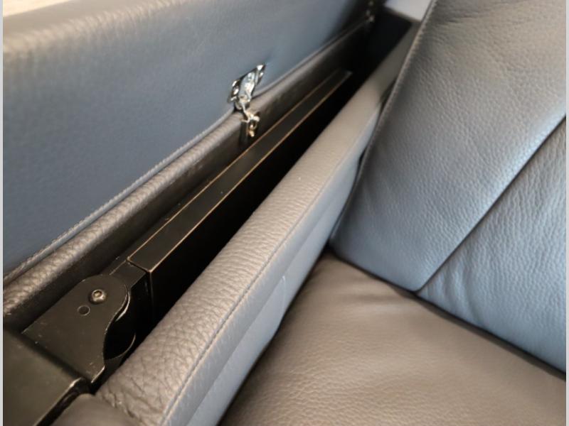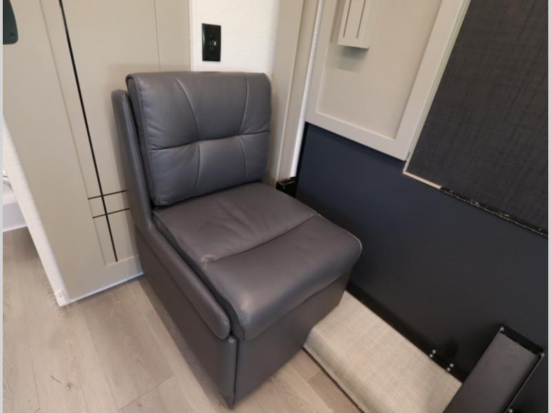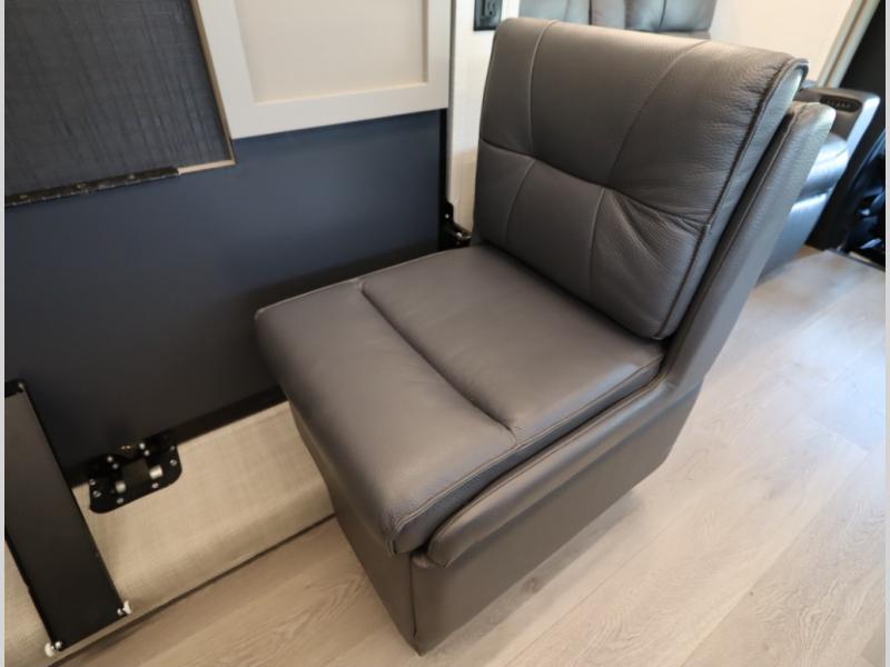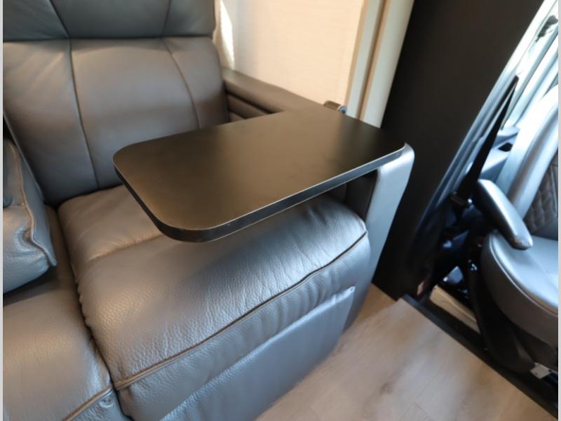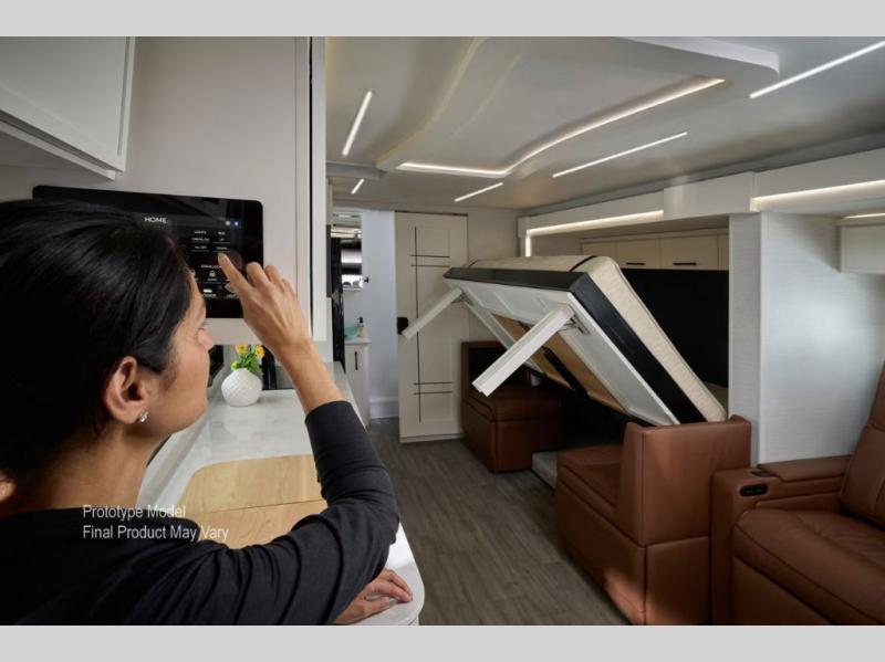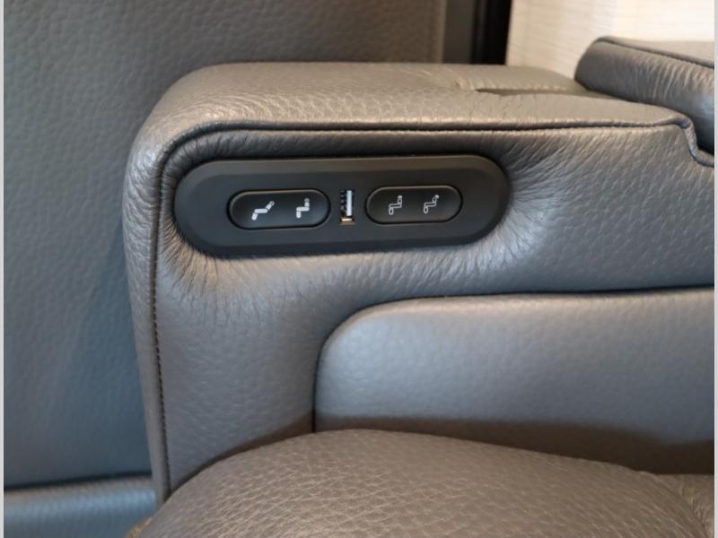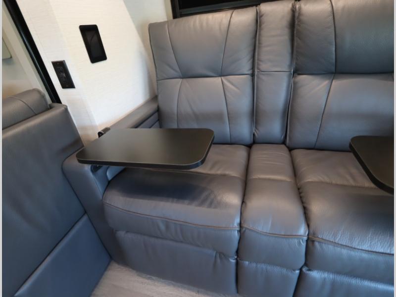 4. Optional interior floorplan upgrade with Powered Villa Italian leather theater seating, 63 in, that includes powered recline and powered headrests. This then upgrades sleeping with a powered King Murphy Bed with integrated dinette and folding table