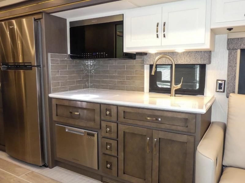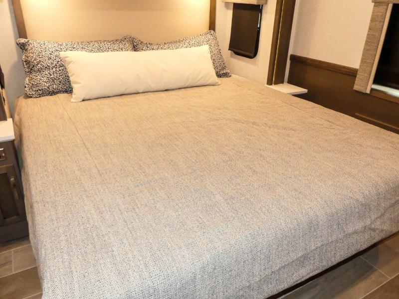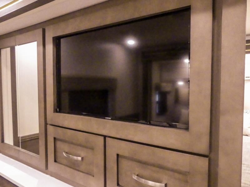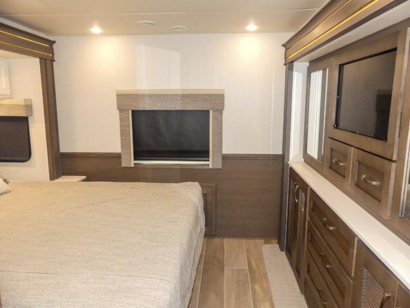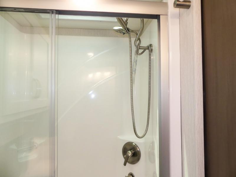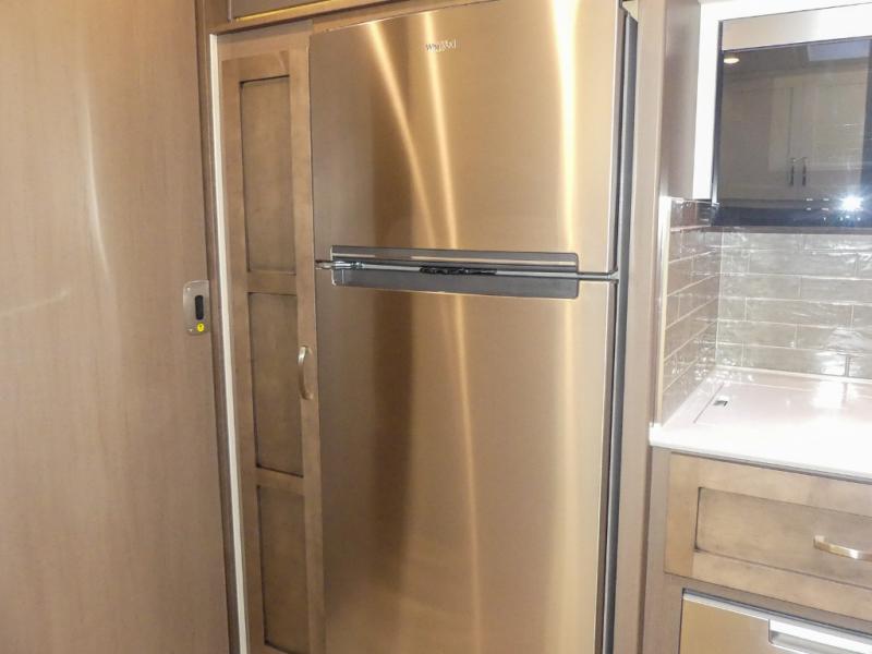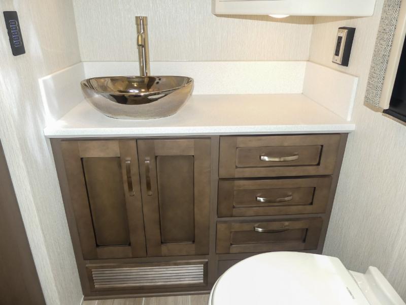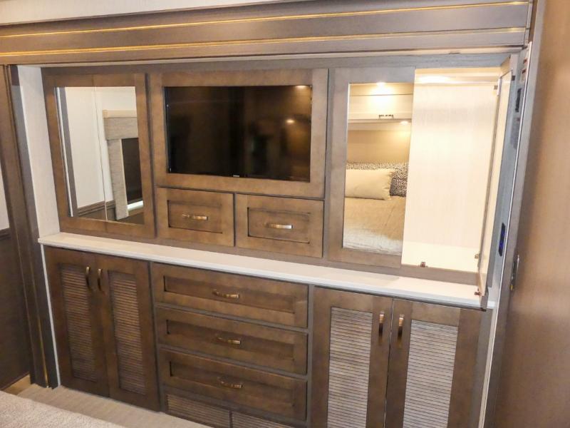 At the end of the day, a king-size bed with pillow top mattress welcomes you to wind down with a little late night TV. Pack for extended stays with dual shirt wardrobes, built-in dresser drawers, and a Splendide washer and dryer! The mid-ship bath offers a generous 40" x 30" shower and a lovely vessel sink with storage above and below.