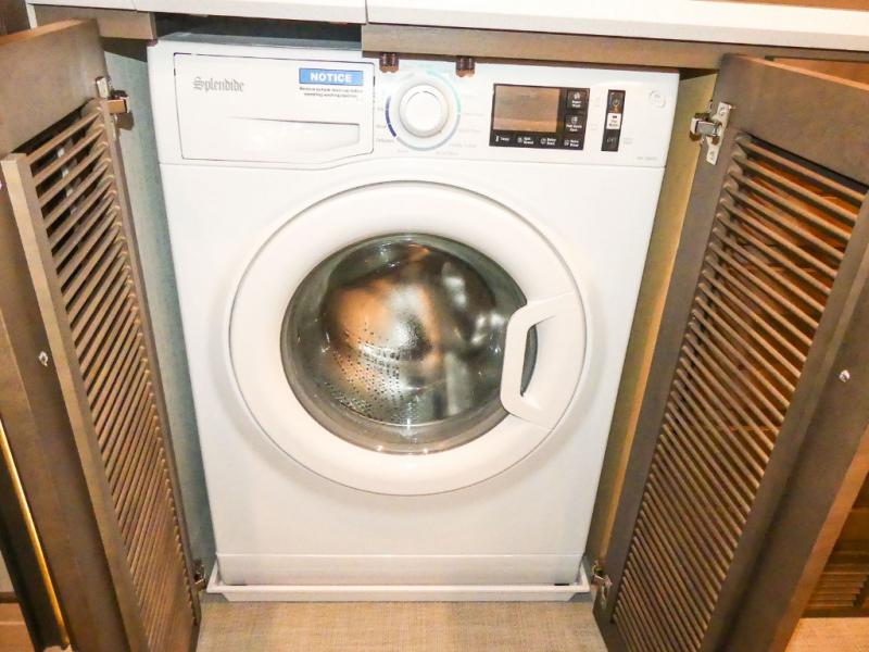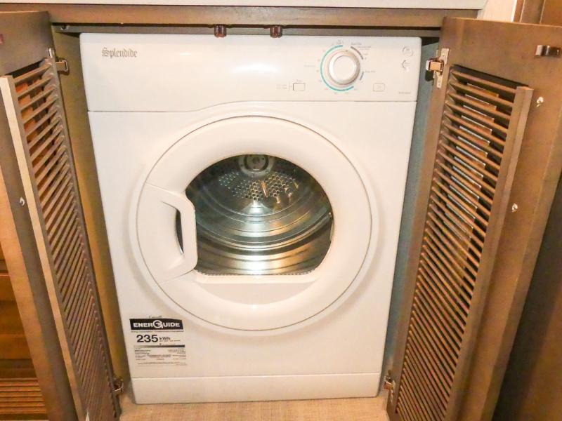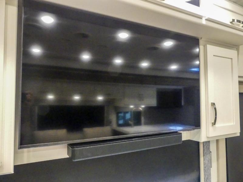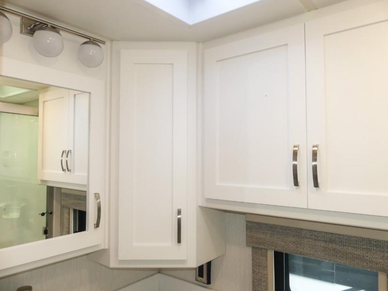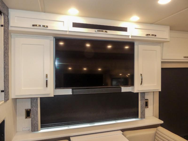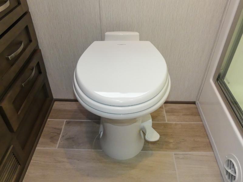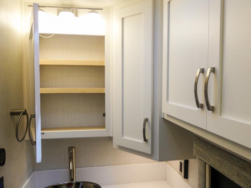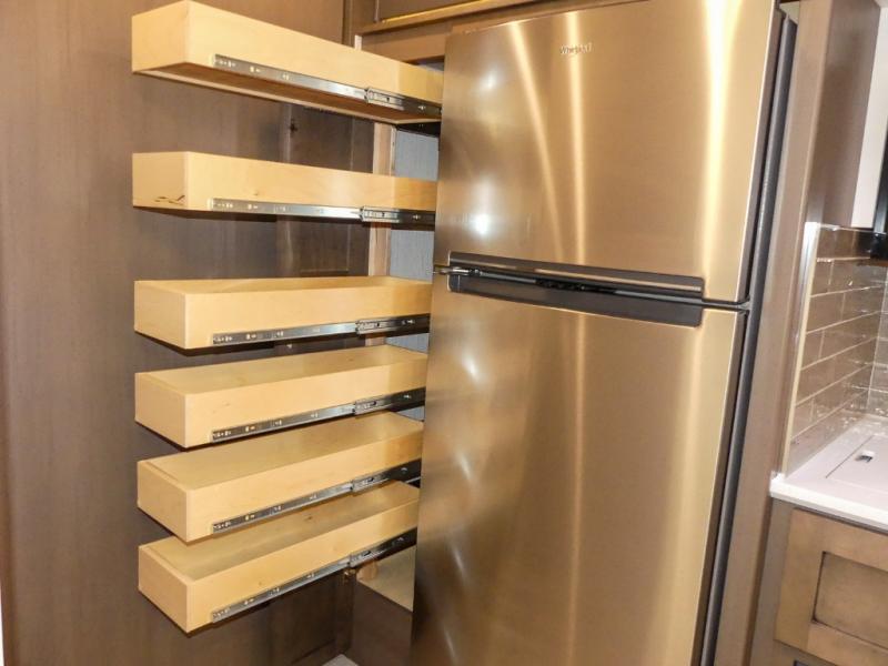 At the end of the day, a king-size bed with pillow top mattress welcomes you to wind down with a little late night TV. Pack for extended stays with dual shirt wardrobes, built-in dresser drawers, and a Splendide washer and dryer! The mid-ship bath offers a generous 40" x 30" shower and a lovely vessel sink with storage above and below.