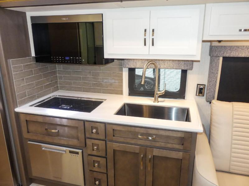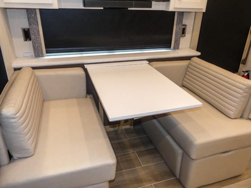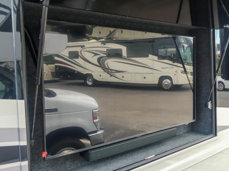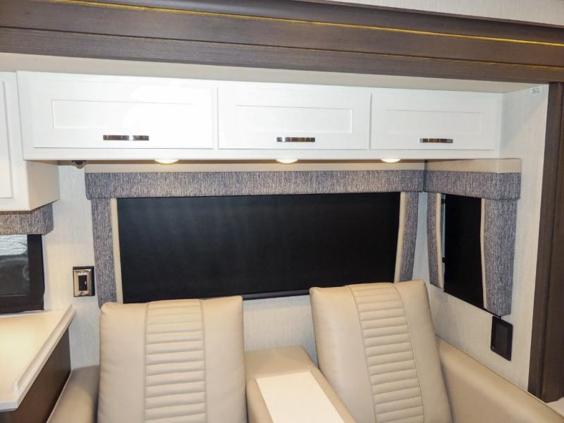Go where you've always wanted in this easy to maneuver Newmar Grand Star Super C motorhome. This diesel pusher is shorter in length but sacrifices nothing in comfort. The 68" theater seating provides optimum viewing of the Samsung LED TV with a Bose Soundbar for peak audio. Stretch out on the bunk over the cab while the chef prepares dinner in the beautiful galley surrounded in super polished solid surfaces, tile backsplash, and an undermount sink for easy clean-up. Enjoy top-of-line appliances including an 18 cu. ft. Whirlpool refrigerator, induction cooktop, 30" stainless steel convection microwave oven with air fryer feature, plus a large pantry with pull-out drawers. Serve up meals at the Williamsburg Sleeper Booth Dinette, or dine outdoors under the power awning while the sidewall TV and Bose Soundbar entertain.
