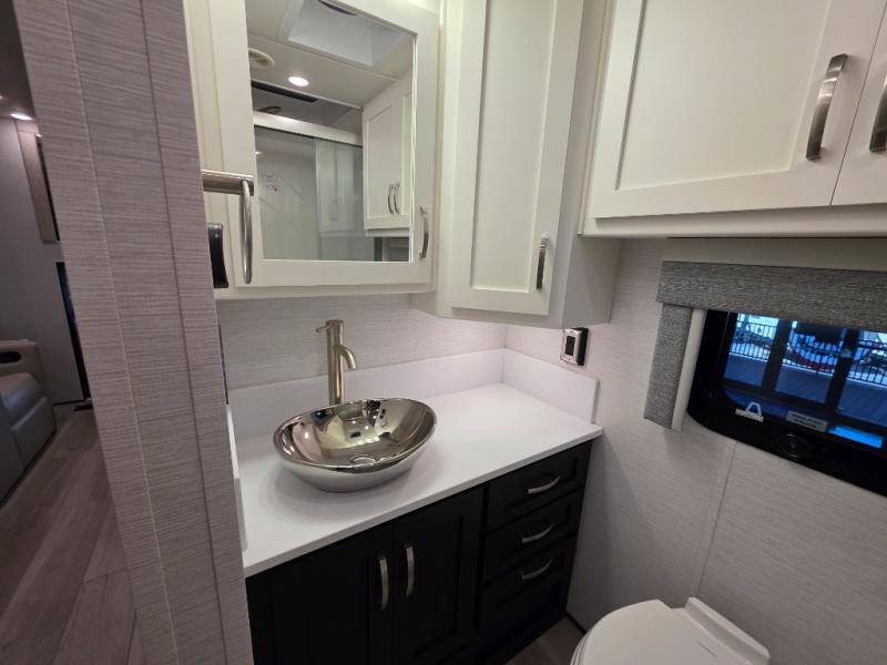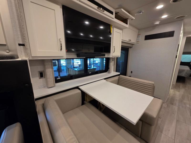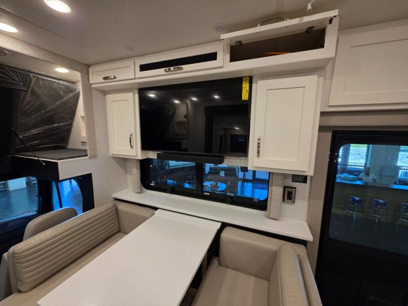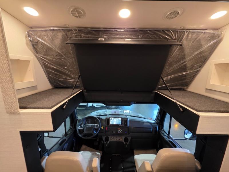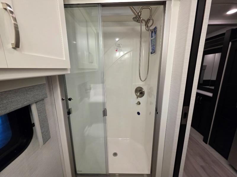 This motorhome is perfect for first time RVers who are looking for a smaller floorplan! The rear private bedroom has a retracting king bed slide across from shirt wardrobes and dresser with an optional washer and dryer below it. If you need more sleeping space then you can utilize the bunk over cab, transform the booth dinette, or lay on the 68" sofa comfort lounge. The chef can prepare their best home cooked meals with the microwave convection oven with air fryer and 18 cu. ft. residential refrigerator, plus you could add the optional induction cooktop or optional dishwasher for easy cleanup. After a long day of traveling, you can easily freshen up in the full bathroom with the 40" x 30" shower and store any necessary toiletries in the overhead cabinets!