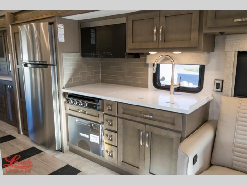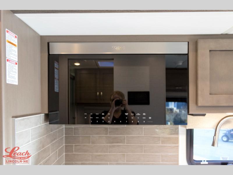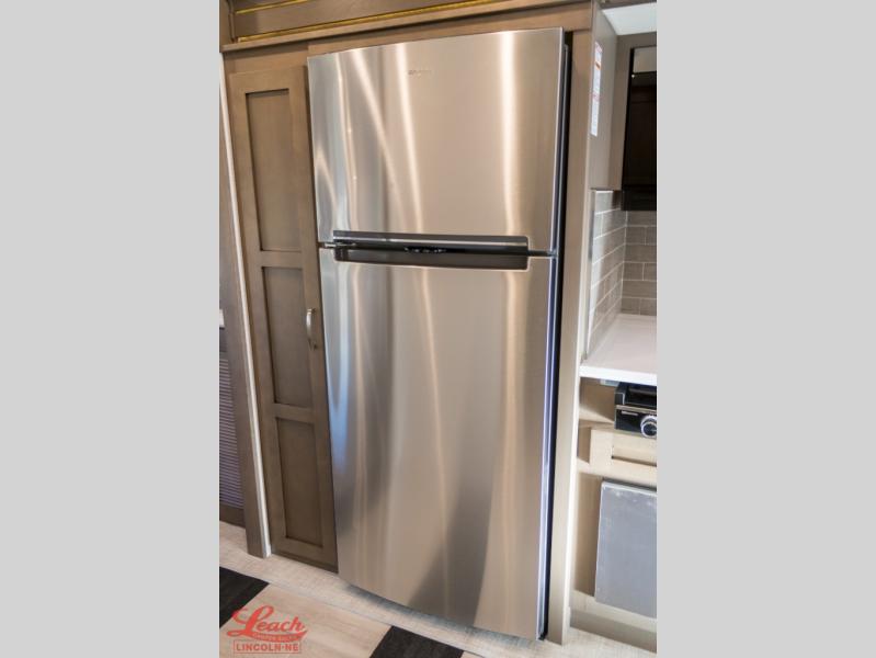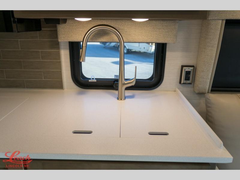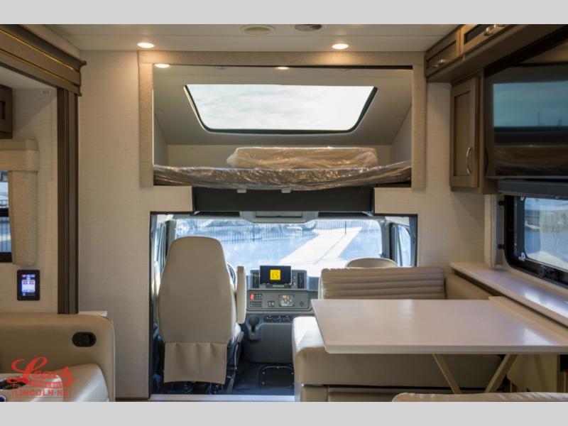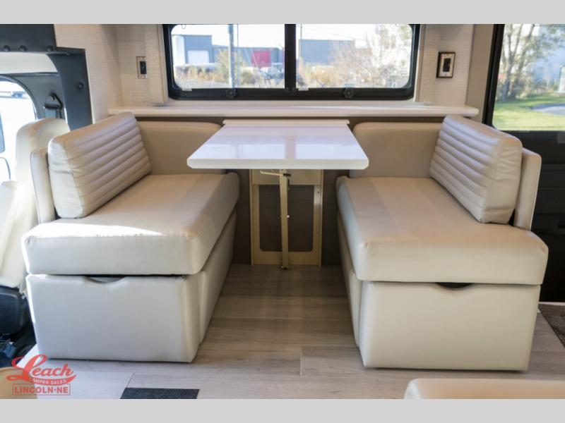 This motorhome is perfect for first time RVers who are looking for a smaller floorplan! The rear private bedroom has a retracting king bed slide across from shirt wardrobes and dresser with an optional washer and dryer below it. If you need more sleeping space then you can utilize the bunk over cab, transform the booth dinette, or lay on the 68" sofa comfort lounge. The chef can prepare their best home cooked meals with the microwave convection oven with air fryer and 18 cu. ft. residential refrigerator, plus you could add the optional induction cooktop or optional dishwasher for easy cleanup. After a long day of traveling, you can easily freshen up in the full bathroom with the 40" x 30" shower and store any necessary toiletries in the overhead cabinets!