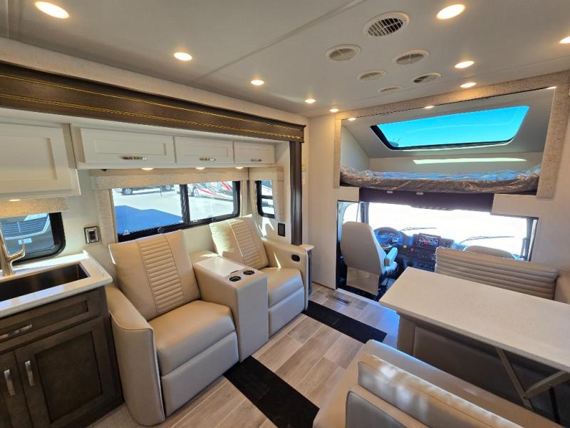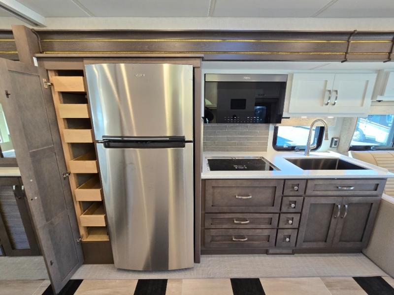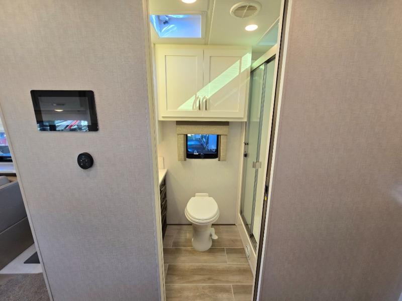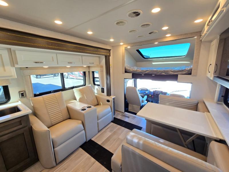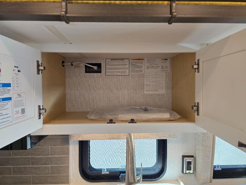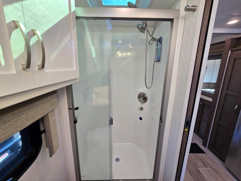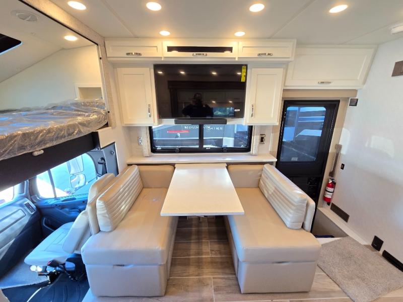 This motorhome is perfect for first time RVers who are looking for a smaller floorplan! The rear private bedroom has a retracting king bed slide across from shirt wardrobes and dresser with an optional washer and dryer below it. If you need more sleeping space then you can utilize the bunk over cab, transform the booth dinette, or lay on the 68" sofa comfort lounge. The chef can prepare their best home cooked meals with the microwave convection oven with air fryer and 18 cu. ft. residential refrigerator, plus you could add the optional induction cooktop or optional dishwasher for easy cleanup. After a long day of traveling, you can easily freshen up in the full bathroom with the 40" x 30" shower and store any necessary toiletries in the overhead cabinets!