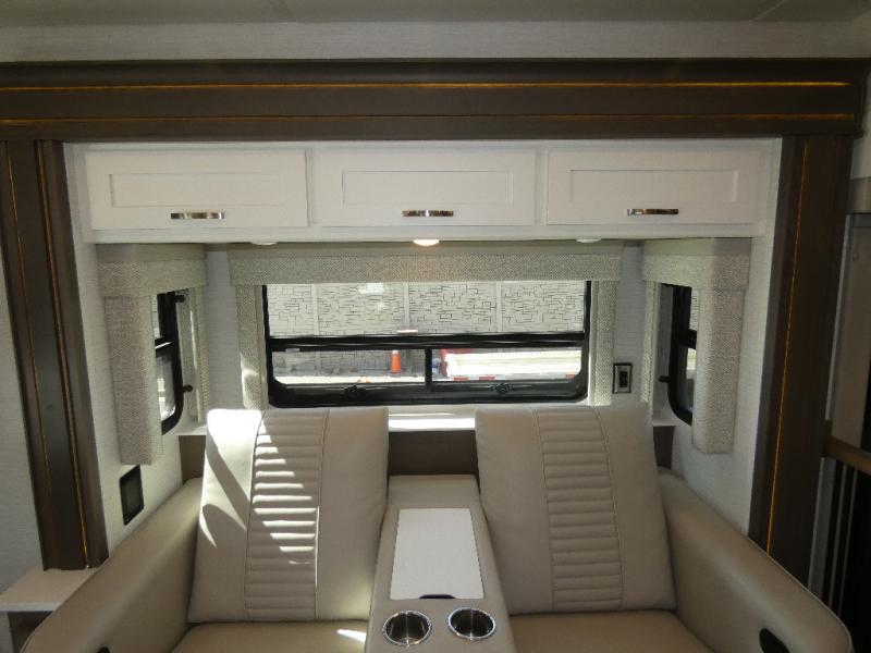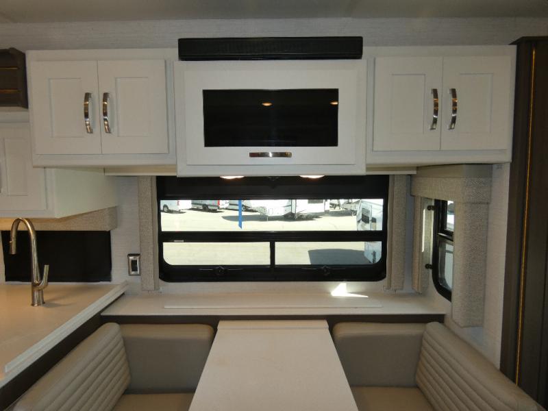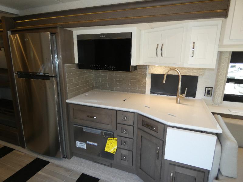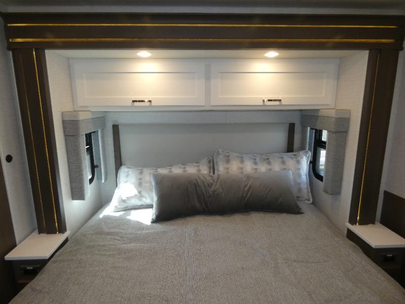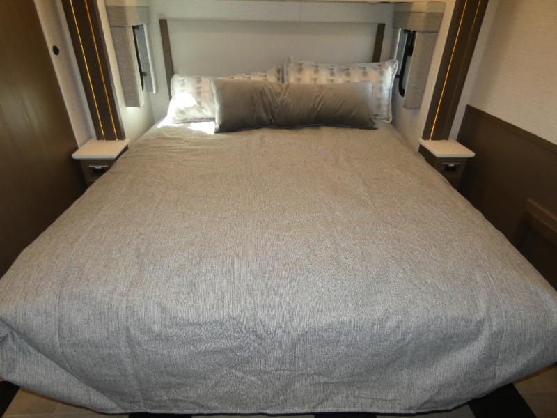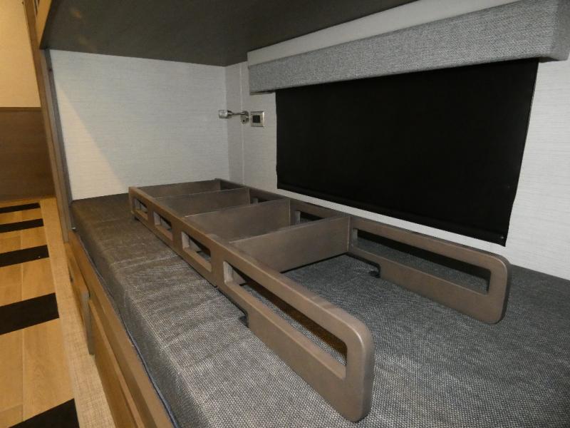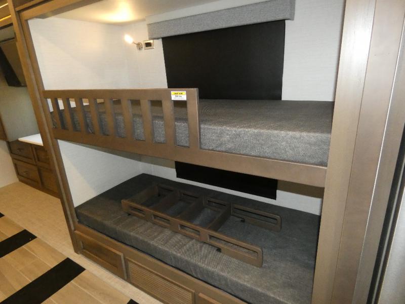 This motorhome is great for families with kids! The rear private bedroom has a retracting king bed slide across from shirt wardrobes and a dresser with a TV. If you need more sleeping space then you can utilize the set of 30" x 72" bunk beds with drawers below, the bunk over cab, or lay on the theater seats. The chef can prepare their best home cooked meals with the countertop extension, the microwave convection oven with air fryer and 18 cu. ft. residential refrigerator, and you can comfortably enjoy all of your meals at the booth dinette (non-sleeper). After a long day of traveling, you can easily freshen up in the full bathroom with the 40" x 30" shower and store any necessary toiletries in the overhead cabinets!