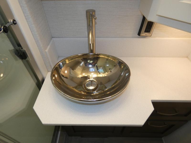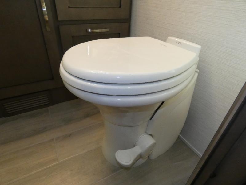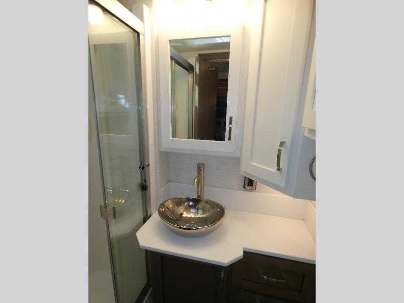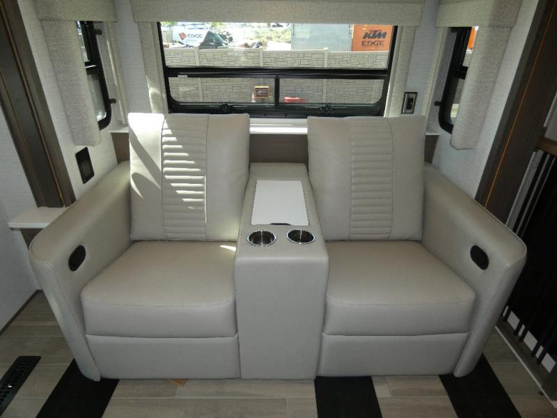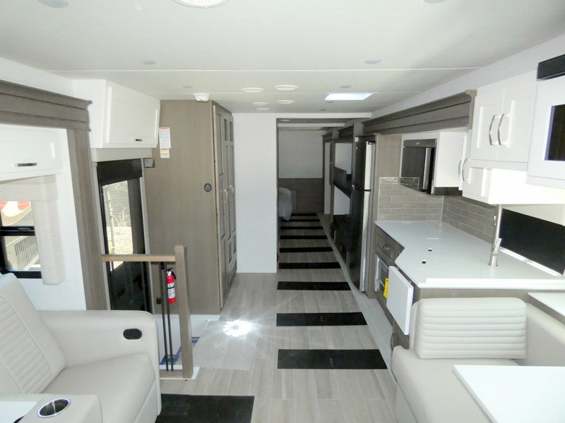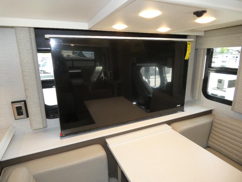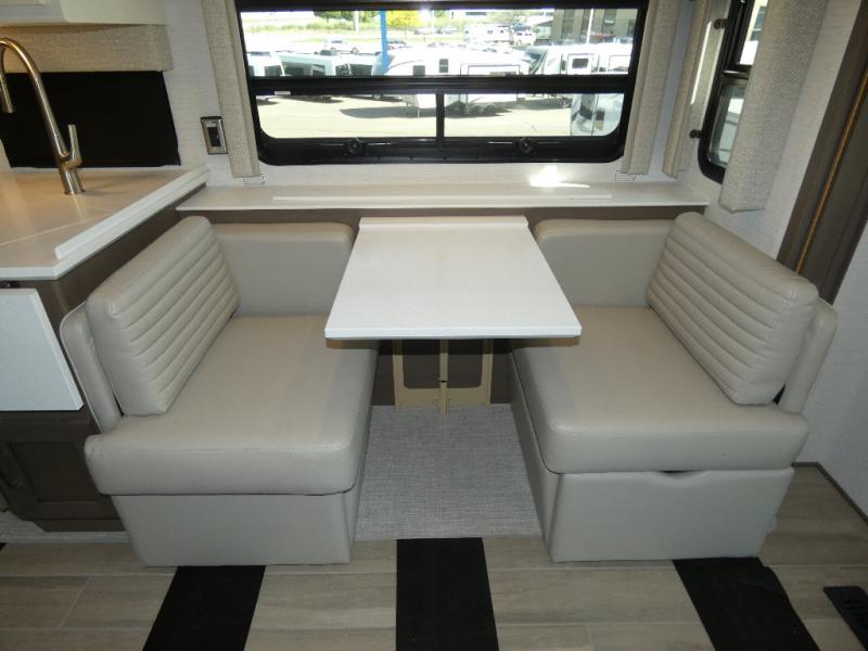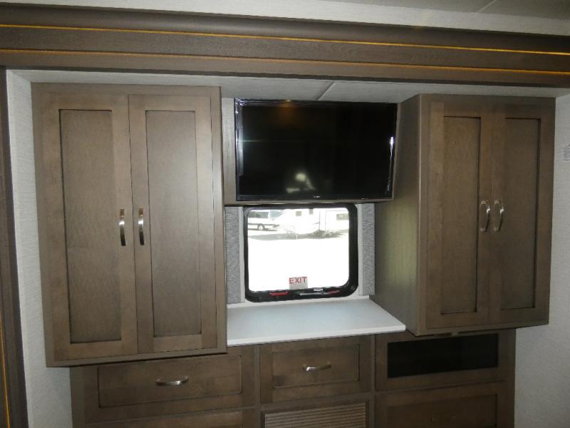 This motorhome is great for families with kids! The rear private bedroom has a retracting king bed slide across from shirt wardrobes and a dresser with a TV. If you need more sleeping space then you can utilize the set of 30" x 72" bunk beds with drawers below, the bunk over cab, or lay on the theater seats. The chef can prepare their best home cooked meals with the countertop extension, the microwave convection oven with air fryer and 18 cu. ft. residential refrigerator, and you can comfortably enjoy all of your meals at the booth dinette (non-sleeper). After a long day of traveling, you can easily freshen up in the full bathroom with the 40" x 30" shower and store any necessary toiletries in the overhead cabinets!