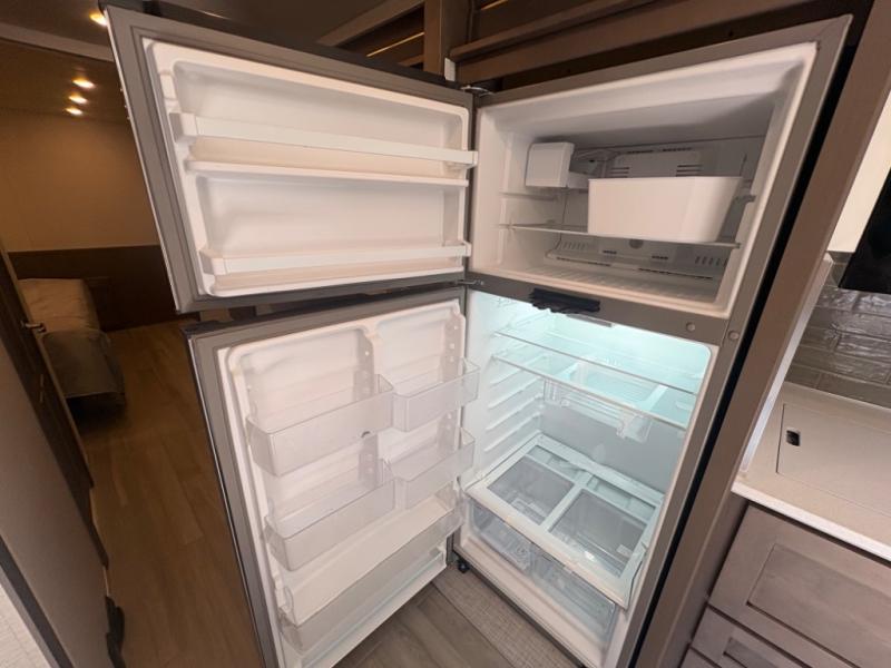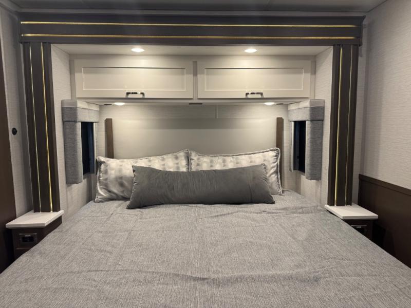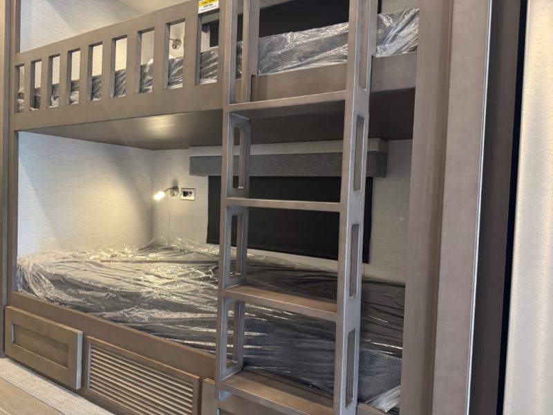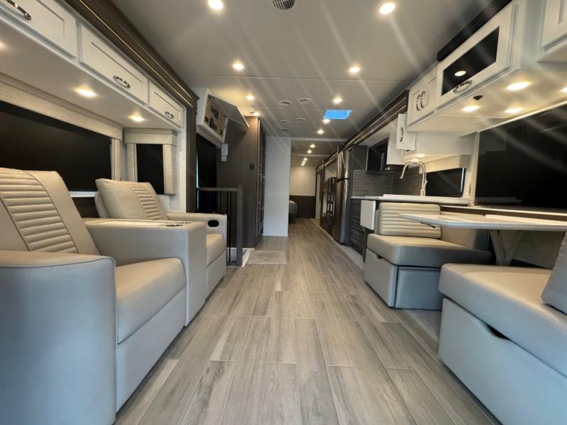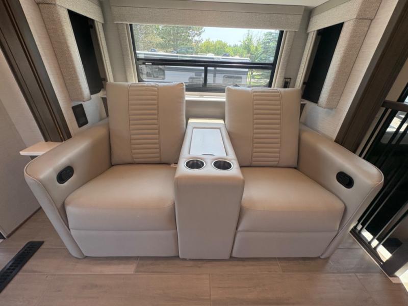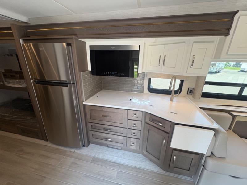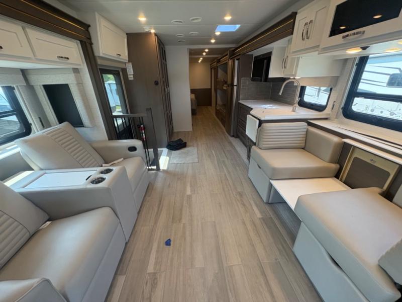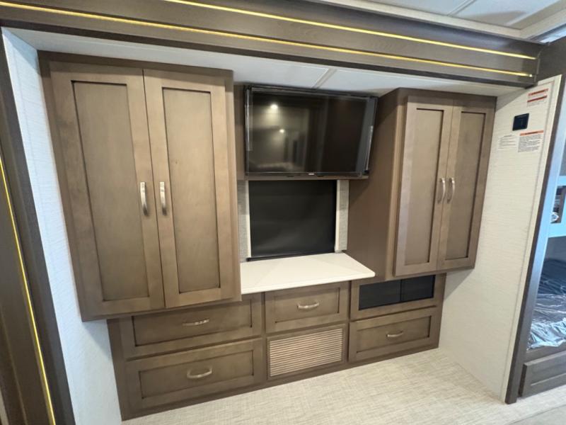 Inside, the Grand Star 3940 exudes elegance and practicality. The spacious living area features high-end furnishings, a large entertainment center, and comfortable seating, creating a welcoming environment for relaxing or entertaining guests. The gourmet kitchen is equipped with modern appliances, ample counter space, and plenty of storage, making meal preparation effortless, whether you’re cooking for two or hosting family and friends.