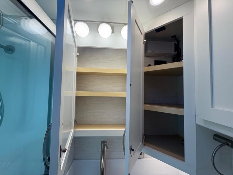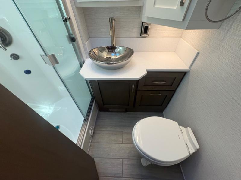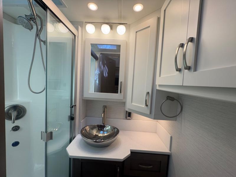 The master suite offers a private retreat, complete with a luxurious bed, expansive wardrobe, and a full bathroom with a premium shower, vanity, and fixtures. Thoughtful design ensures that every inch of the Grand Star 3940 maximizes comfort, convenience, and functionality. Additional sleeping areas provide versatility, making this motorhome ideal for multi-generational travel or extended trips.