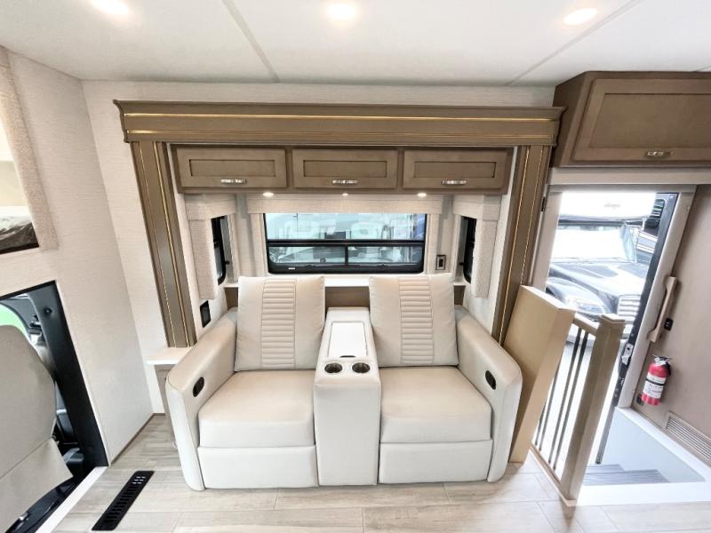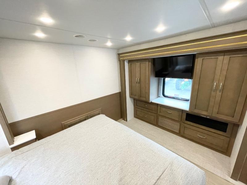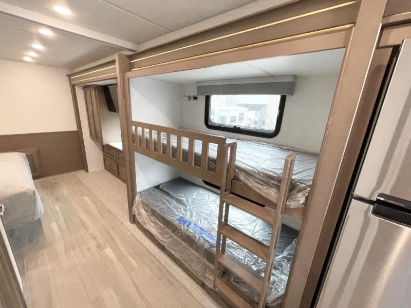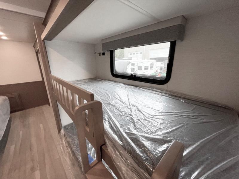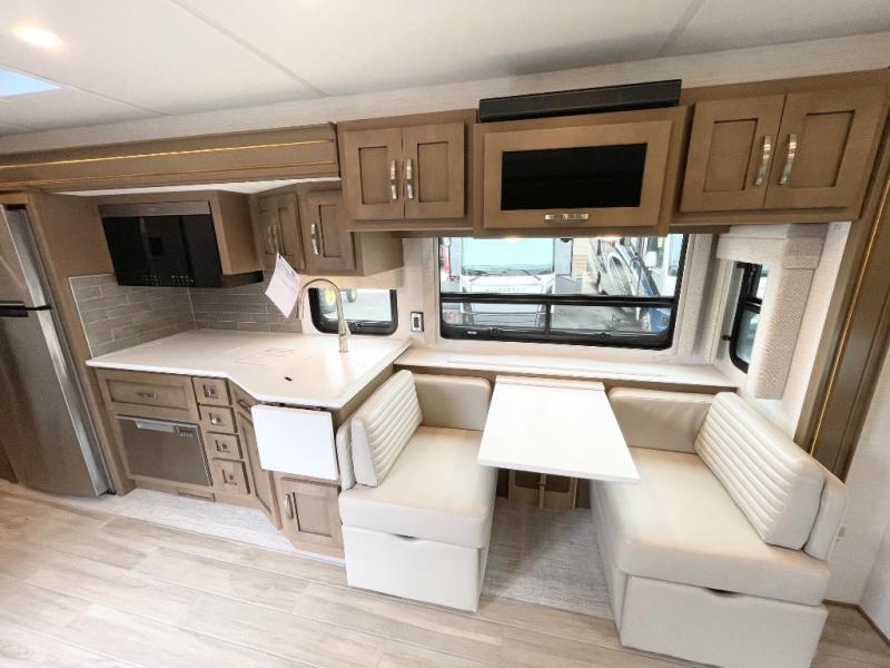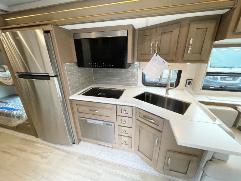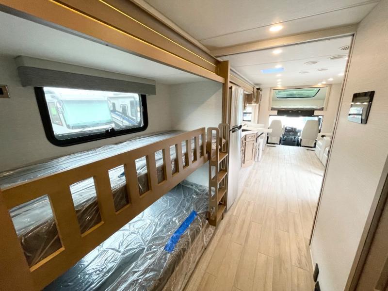This motorhome is great for families with kids! The rear private bedroom has a retracting king bed slide across from shirt wardrobes and a dresser with a TV. If you need more sleeping space then you can utilize the set of 30" x 72" bunk beds with drawers below, the bunk over cab, or lay on the 74" sofa comfort lounge. The chef can prepare their best home cooked meals with the countertop extension, the microwave convection oven with air fryer and 18 cu. ft. residential refrigerator, plus you could add the optional induction cooktop or optional dishwasher for easy cleanup, and you can comfortably enjoy all of your meals at the booth dinette (non-sleeper). After a long day of traveling, you can easily freshen up in the full bathroom with the 40" x 30" shower and store any necessary toiletries in the overhead cabinets!