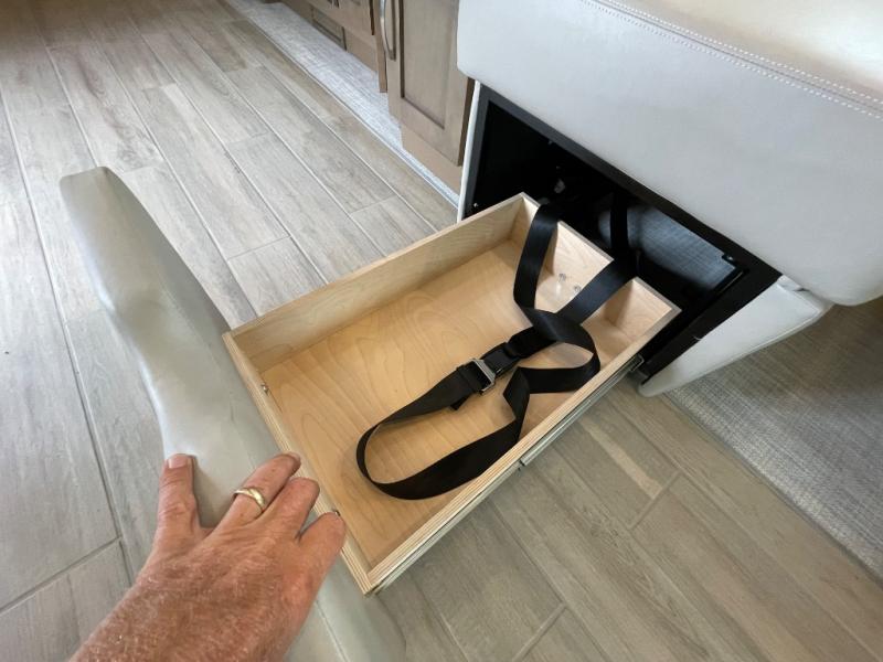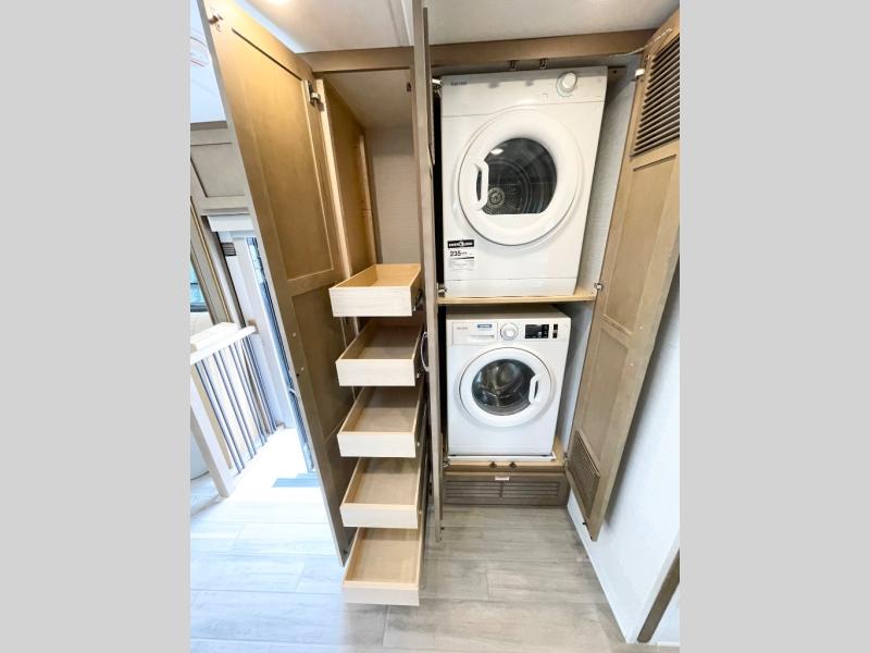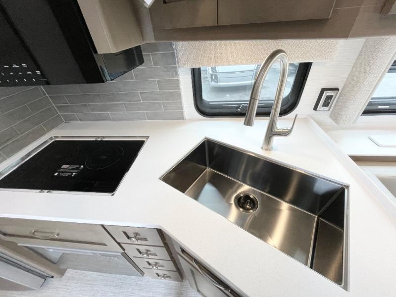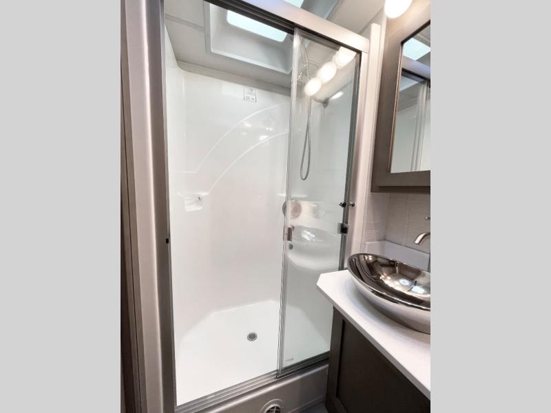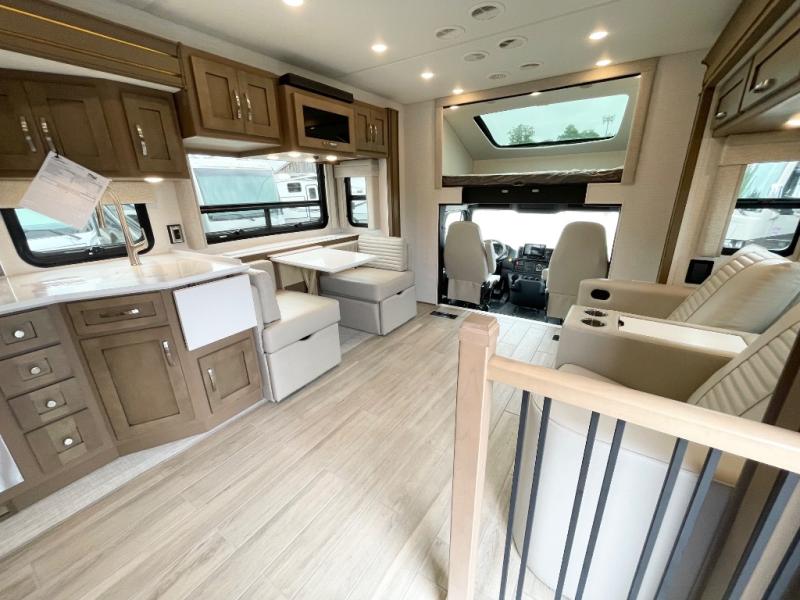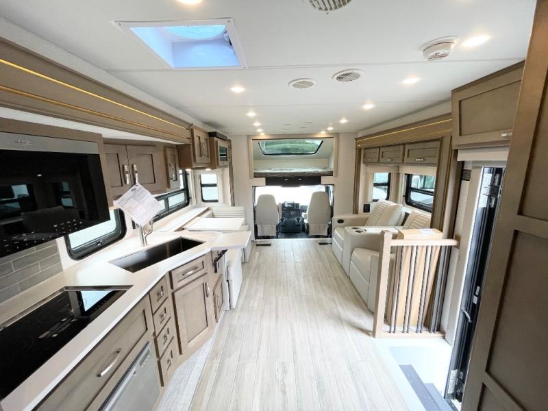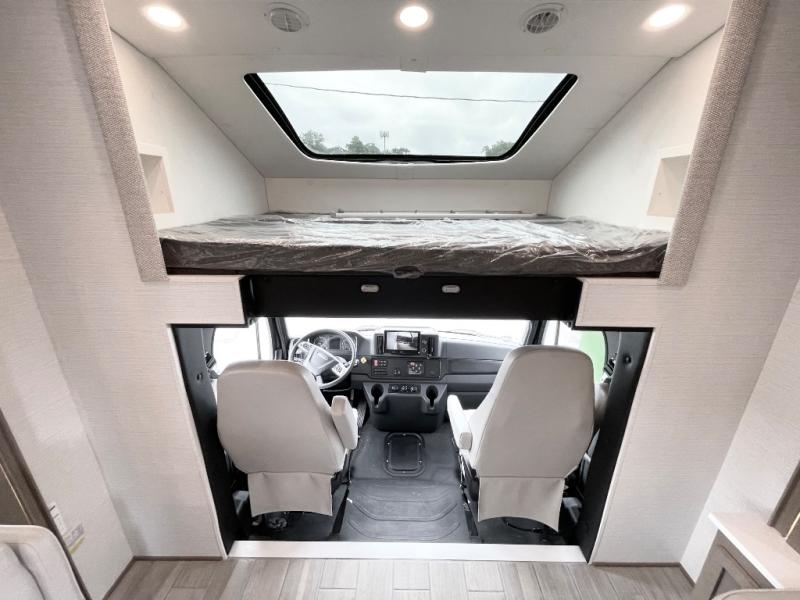 This motorhome is great for families with kids! The rear private bedroom has a retracting king bed slide across from shirt wardrobes and a dresser with a TV. If you need more sleeping space then you can utilize the set of 30" x 72" bunk beds with drawers below, the bunk over cab, or lay on the 74" sofa comfort lounge. The chef can prepare their best home cooked meals with the countertop extension, the microwave convection oven with air fryer and 18 cu. ft. residential refrigerator, plus you could add the optional induction cooktop or optional dishwasher for easy cleanup, and you can comfortably enjoy all of your meals at the booth dinette (non-sleeper). After a long day of traveling, you can easily freshen up in the full bathroom with the 40" x 30" shower and store any necessary toiletries in the overhead cabinets!