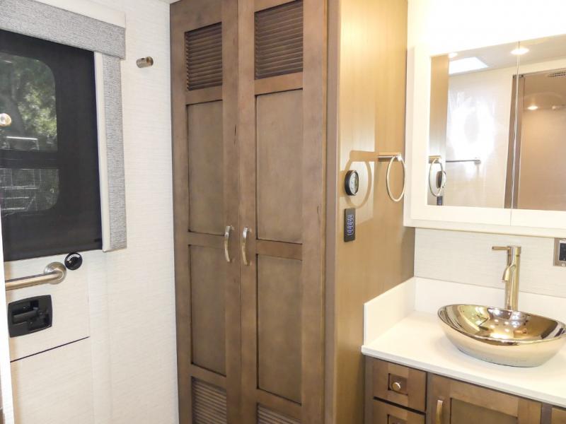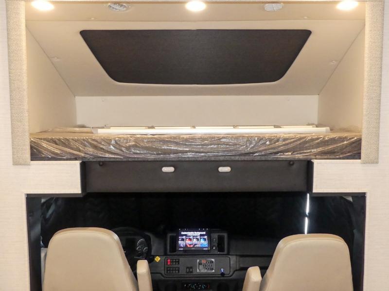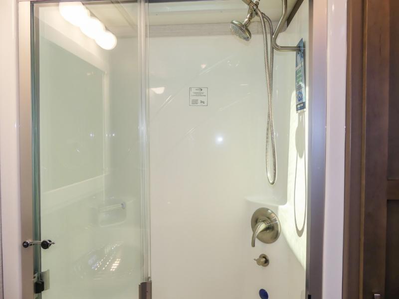 If you're looking for more space then this motorhome is for you! With a bath and a half, it's easy for everyone to use the restroom without having to use the camp's facilities. The full rear bathroom not only has a 40" x 30" shower, a wardrobe with shelves, and an area for washer and dryer, but also an emergency exit behind the toilet. The private bedroom has a retracting king bed slide across from shirt wardrobes and a dresser with a TV. If you need more sleeping space then you can utilize the bunk over cab or lay on the 74" sofa comfort lounge.