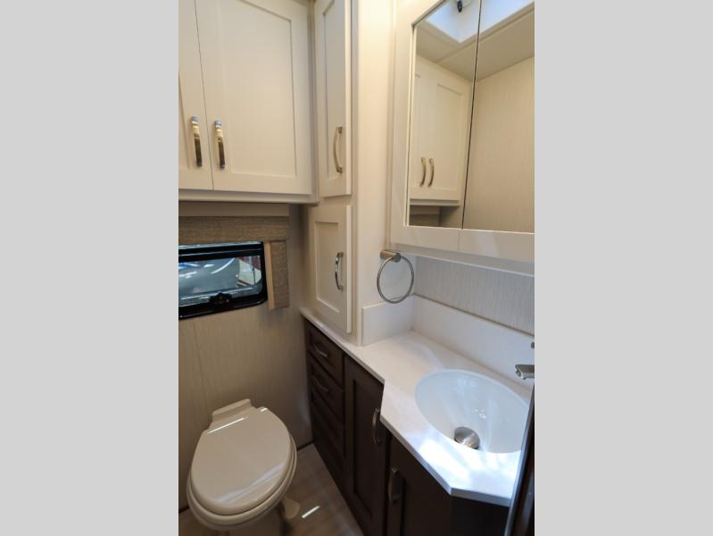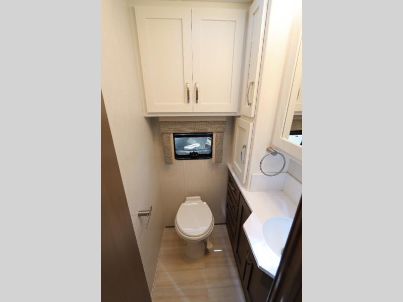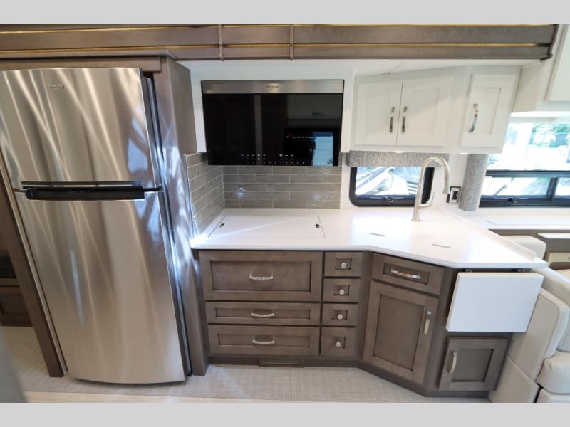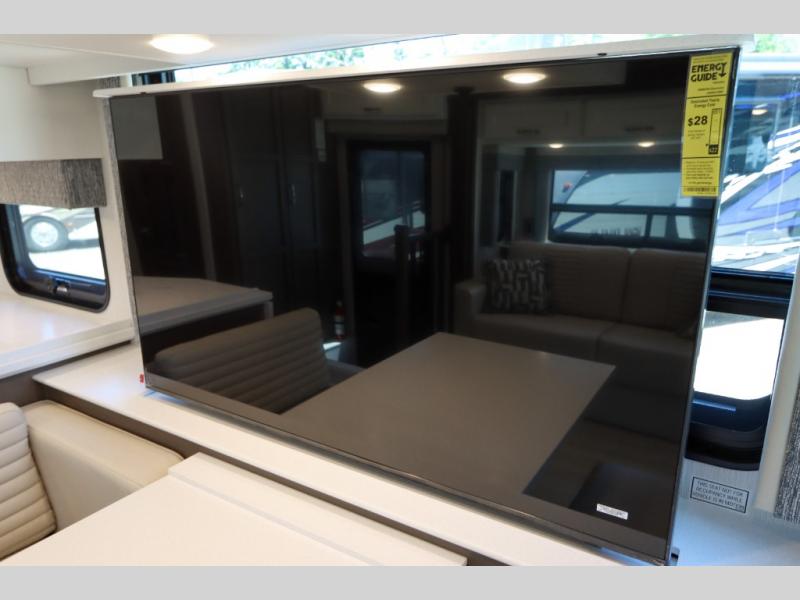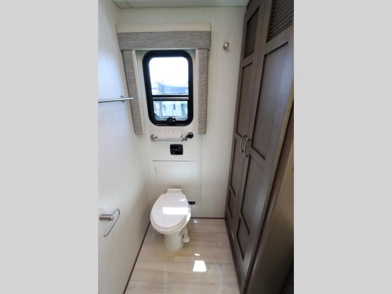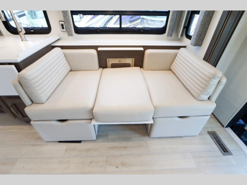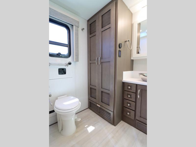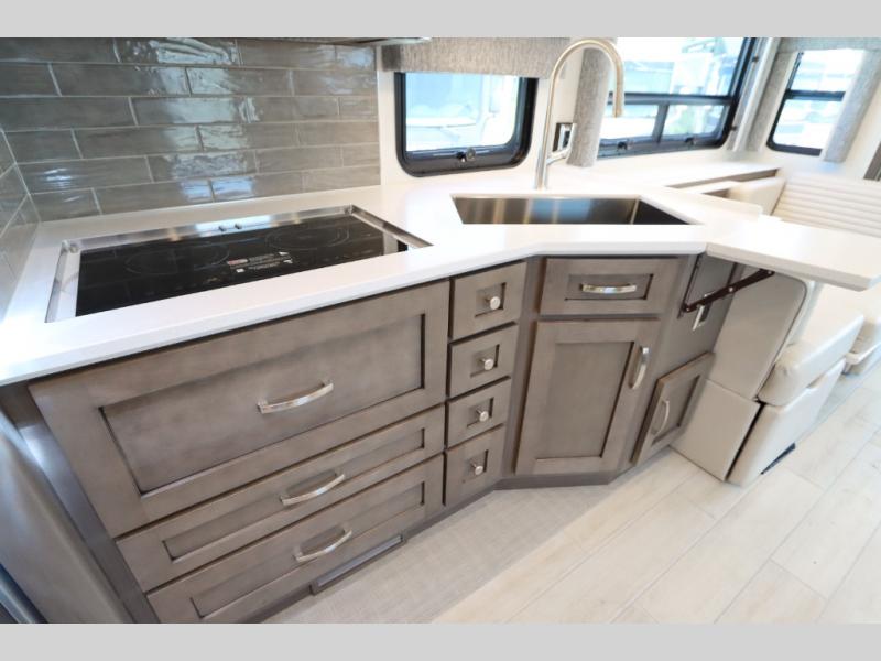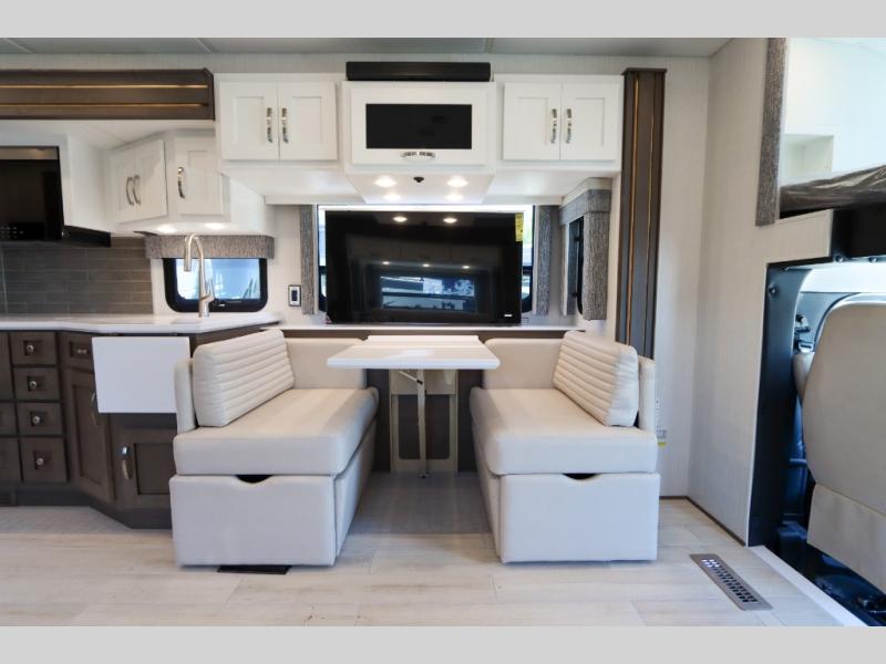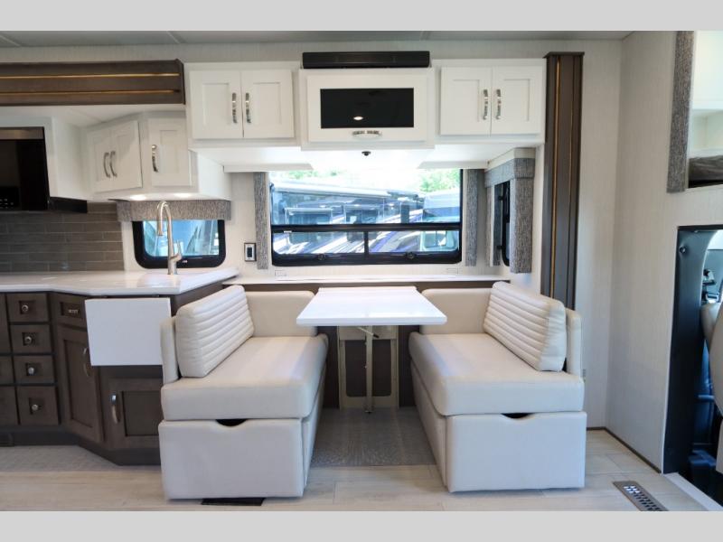If you're looking for more space then this motorhome is for you! With a bath and a half, it's easy for everyone to use the restroom without having to use the camp's facilities. The full rear bathroom not only has a 40" x 30" shower, a wardrobe with shelves, and an area for either a wardrobe or an optional washer and dryer, but also an emergency exit behind the toilet. The private bedroom has a retracting king bed slide across from shirt wardrobes and a dresser with a TV. If you need more sleeping space then you can utilize the bunk over cab or lay on the 74" sofa comfort lounge. The chef can prepare their best home cooked meals with the countertop extension, the microwave convection oven with air fryer and 18 cu. ft. residential refrigerator, plus you could add the optional induction cooktop or optional dishwasher for easy cleanup, and you can comfortably enjoy all of your meals at the booth dinette which can also transform into an extra sleeping space if needed!
