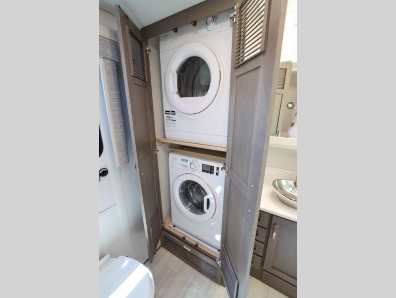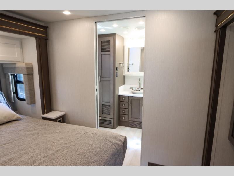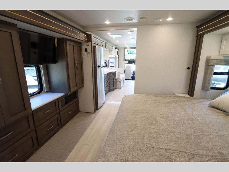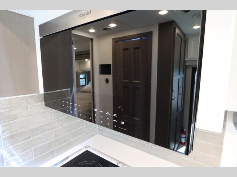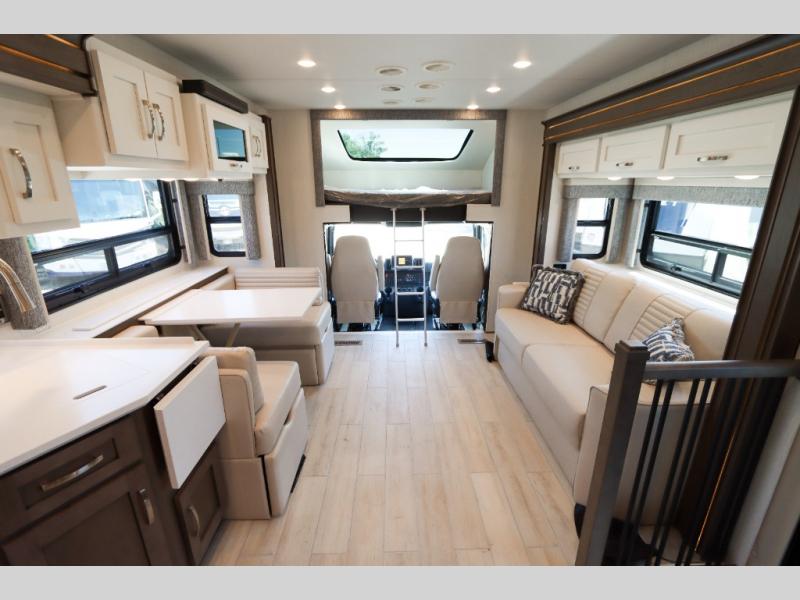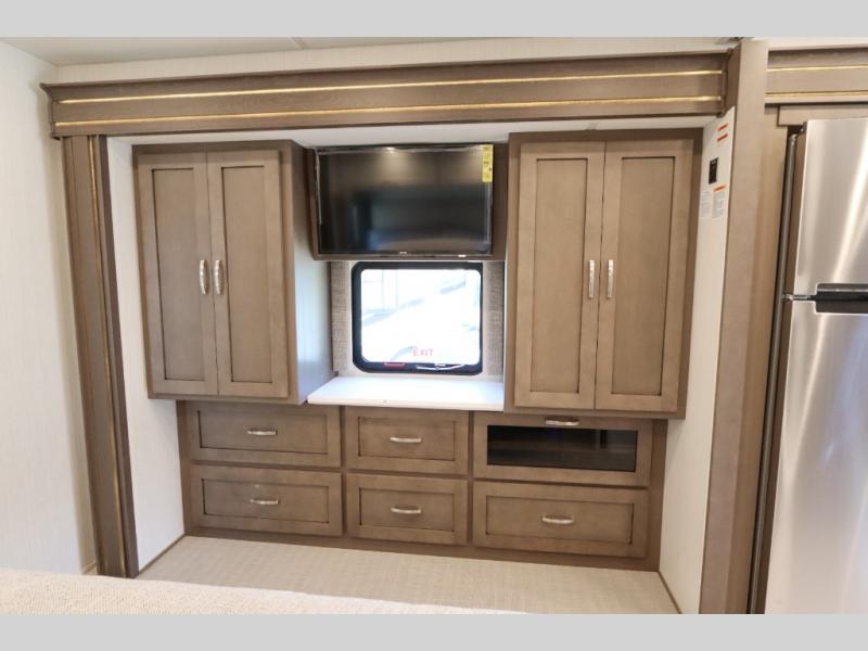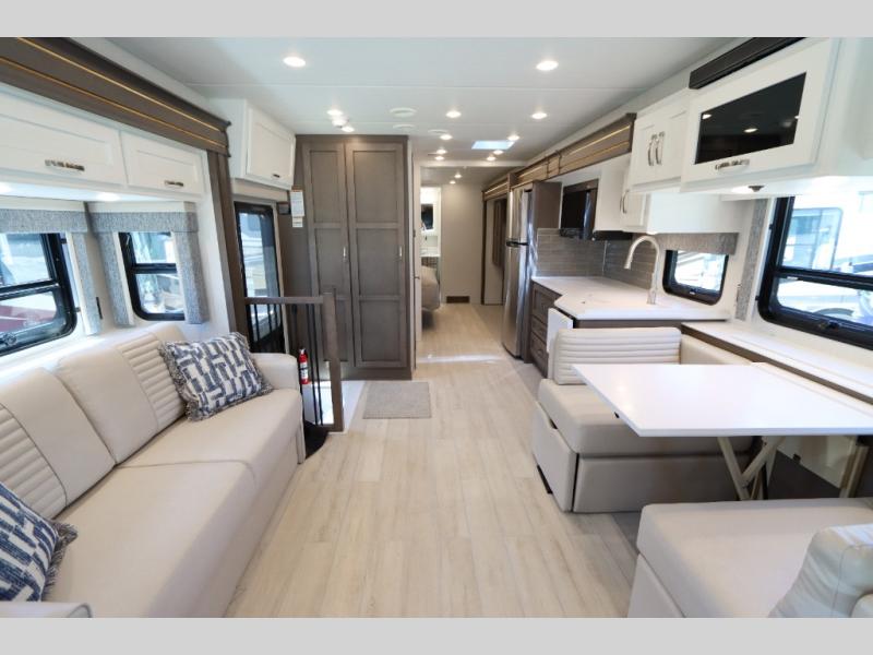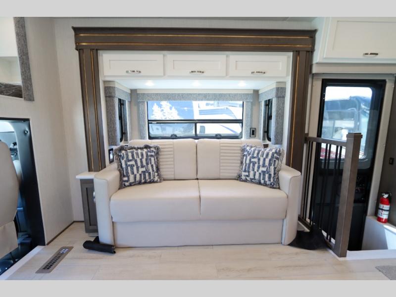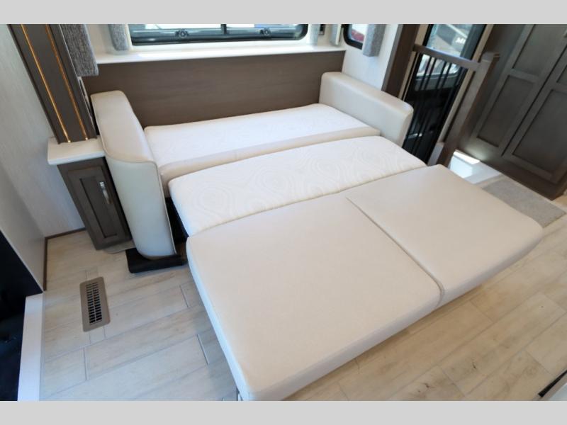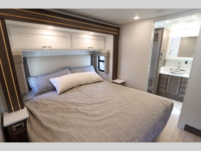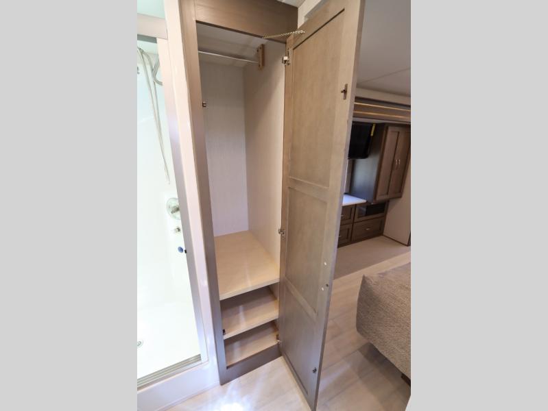 If you're looking for more space then this motorhome is for you! With a bath and a half, it's easy for everyone to use the restroom without having to use the camp's facilities. The full rear bathroom not only has a 40" x 30" shower, a wardrobe with shelves, and an area for either a wardrobe or an optional washer and dryer, but also an emergency exit behind the toilet. The private bedroom has a retracting king bed slide across from shirt wardrobes and a dresser with a TV. If you need more sleeping space then you can utilize the bunk over cab or lay on the 74" sofa comfort lounge. The chef can prepare their best home cooked meals with the countertop extension, the microwave convection oven with air fryer and 18 cu. ft. residential refrigerator, plus you could add the optional induction cooktop or optional dishwasher for easy cleanup, and you can comfortably enjoy all of your meals at the booth dinette which can also transform into an extra sleeping space if needed!