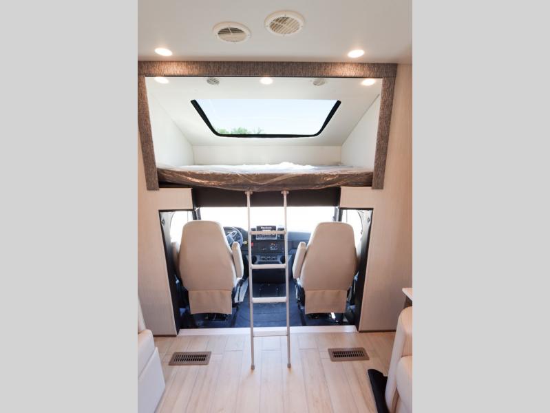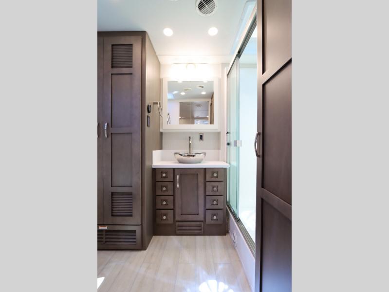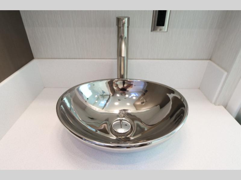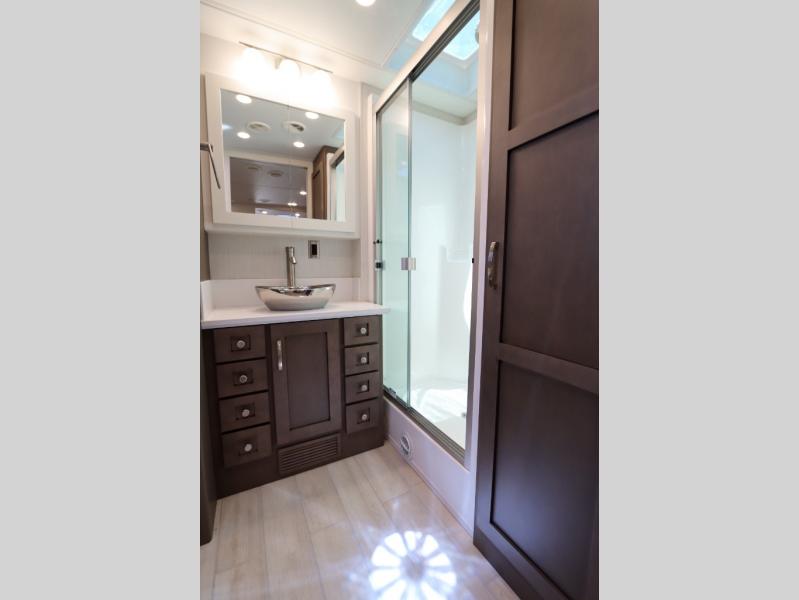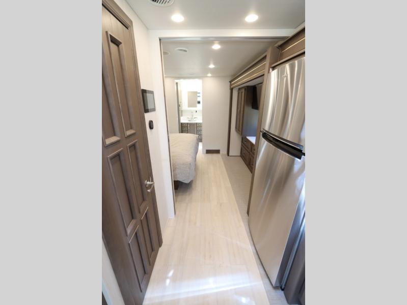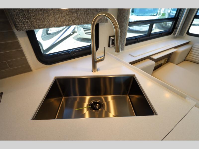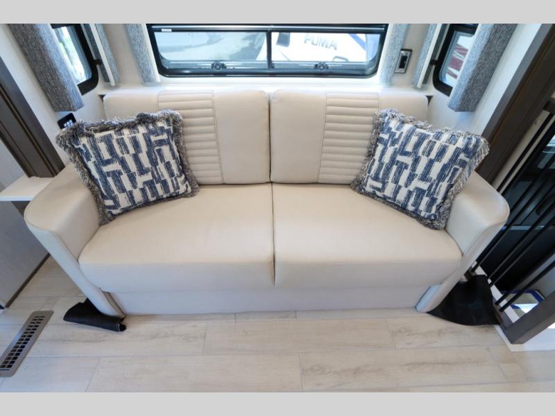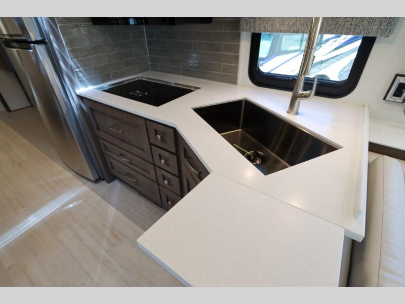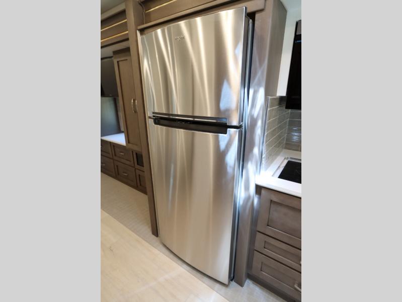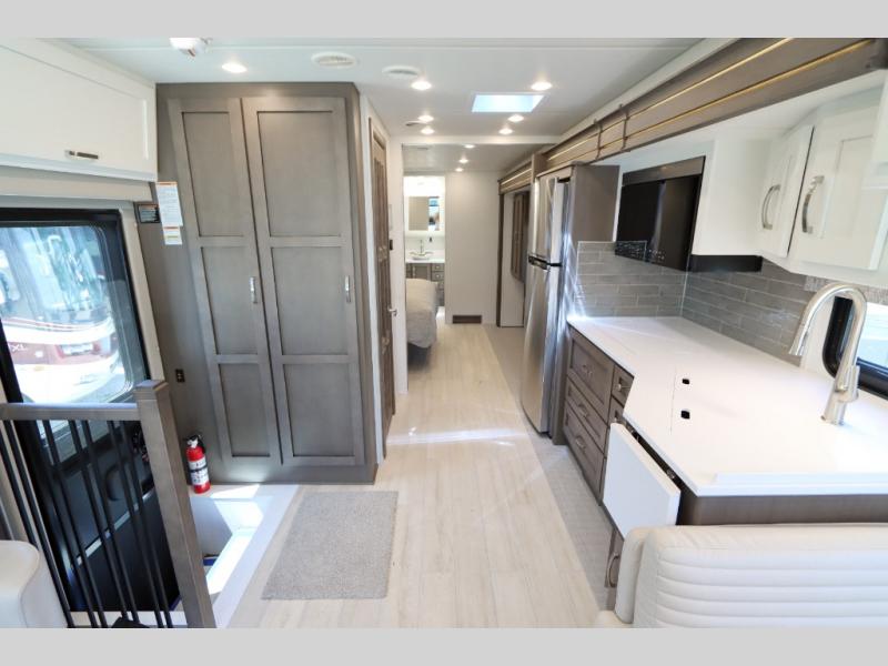 If you're looking for more space then this motorhome is for you! With a bath and a half, it's easy for everyone to use the restroom without having to use the camp's facilities. The full rear bathroom not only has a 40" x 30" shower, a wardrobe with shelves, and an area for either a wardrobe or an optional washer and dryer, but also an emergency exit behind the toilet. The private bedroom has a retracting king bed slide across from shirt wardrobes and a dresser with a TV. If you need more sleeping space then you can utilize the bunk over cab or lay on the 74" sofa comfort lounge. The chef can prepare their best home cooked meals with the countertop extension, the microwave convection oven with air fryer and 18 cu. ft. residential refrigerator, plus you could add the optional induction cooktop or optional dishwasher for easy cleanup, and you can comfortably enjoy all of your meals at the booth dinette which can also transform into an extra sleeping space if needed!