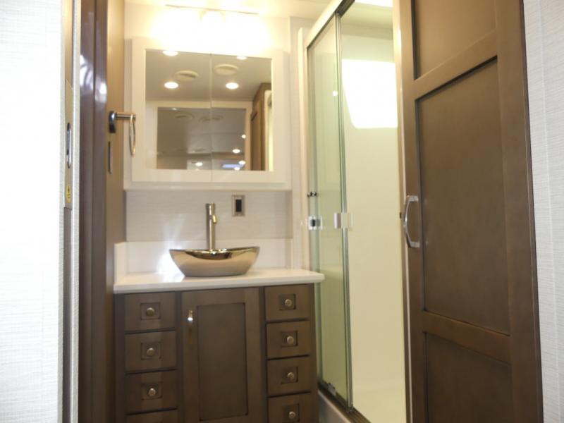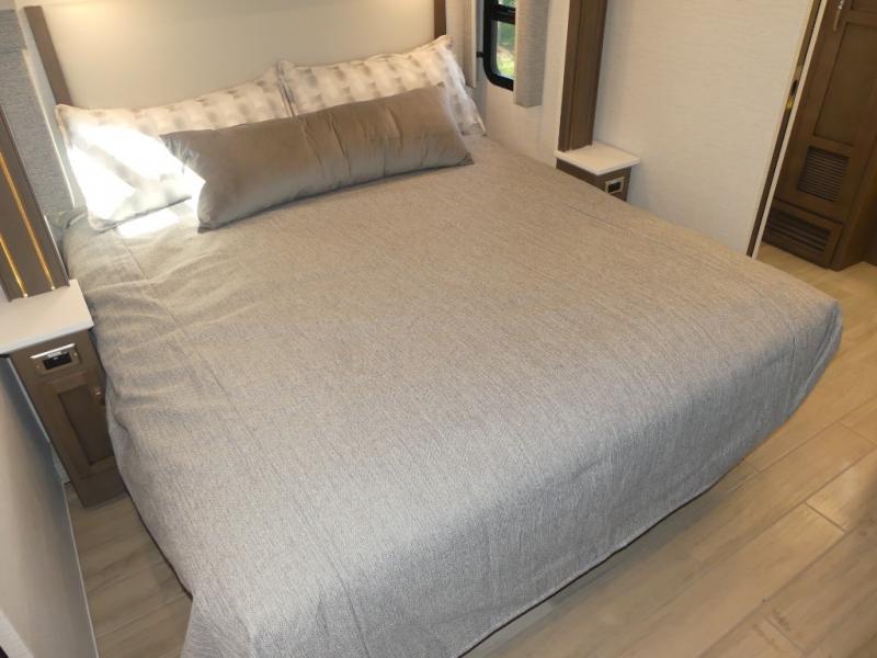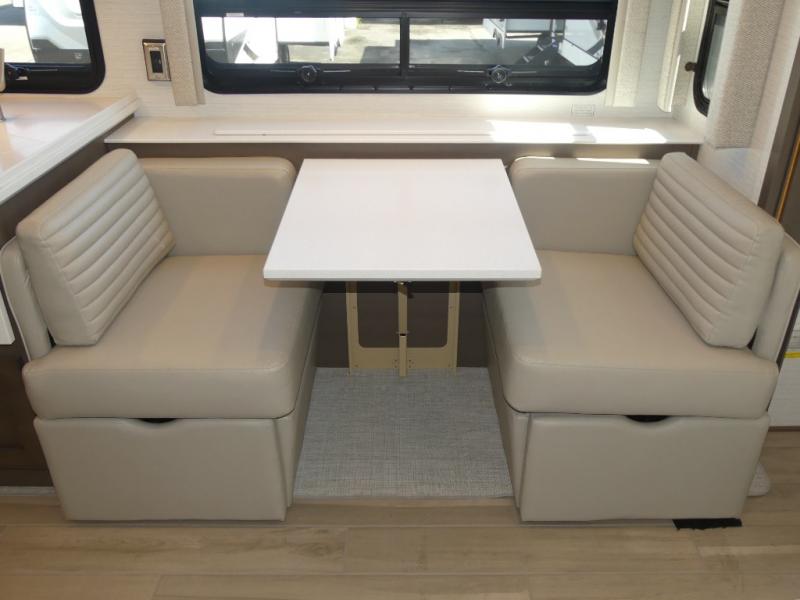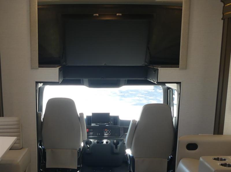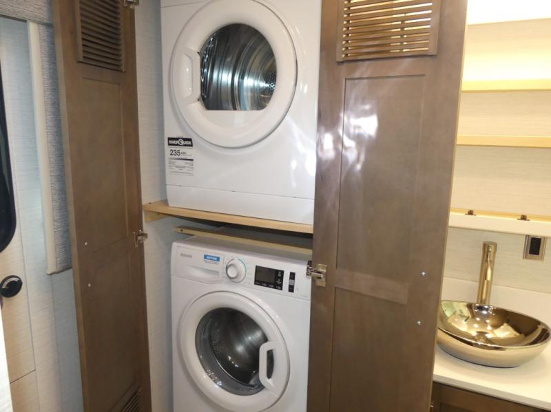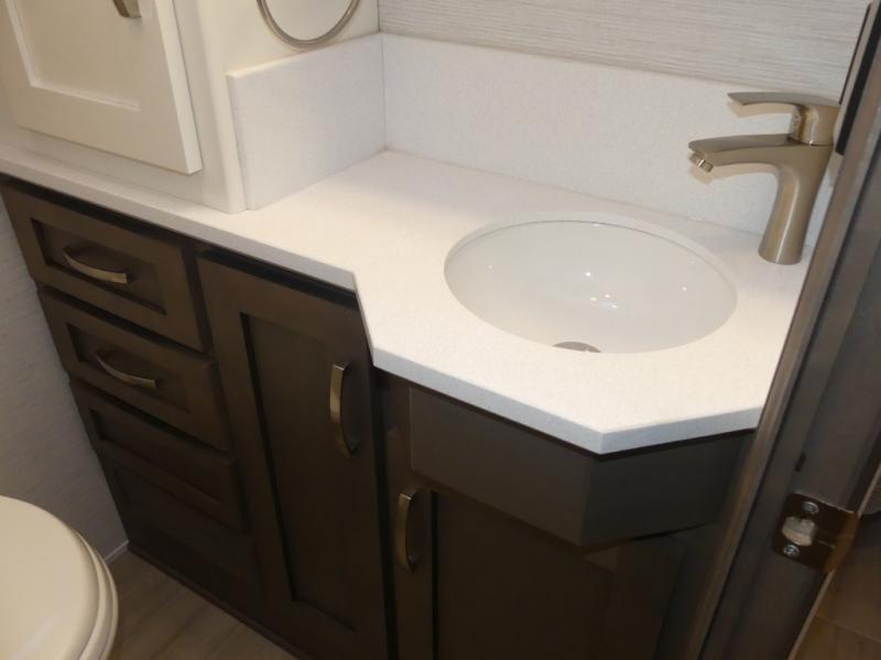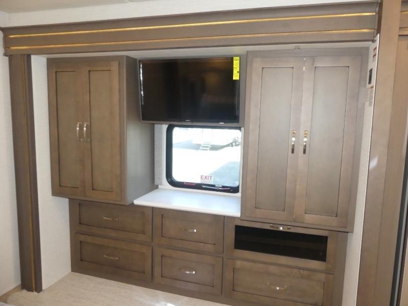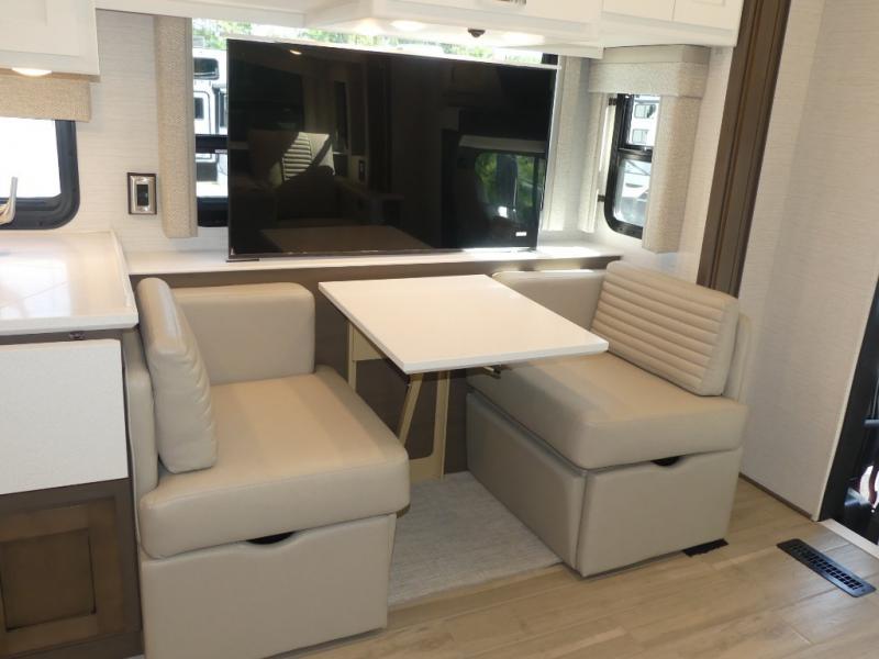 If you're looking for more space then this motorhome is for you! With a bath and a half, it's easy for everyone to use the restroom without having to use the camp's facilities. The full rear bathroom not only has a 40" x 30" shower, a wardrobe with shelves, and an area with a washer and dryer, but also an emergency exit behind the toilet. The private bedroom has a retracting king bed slide across from shirt wardrobes and a dresser with a TV. If you need more sleeping space then you can utilize the bunk over cab or lay on the 74" sofa comfort lounge. The chef can prepare their best home cooked meals with the countertop extension, the microwave convection oven with air fryer and 18 cu. ft. residential refrigerator, and you can comfortably enjoy all of your meals at the booth dinette which can also transform into an extra sleeping space if needed!
