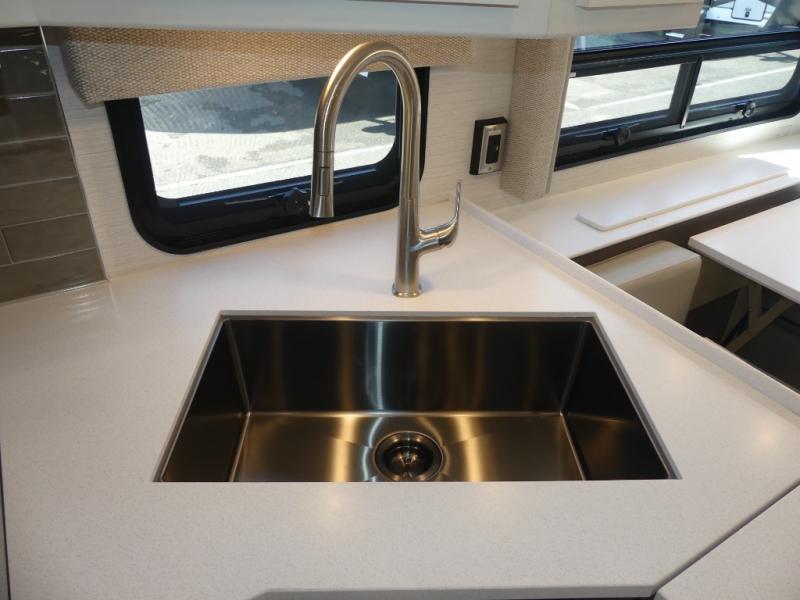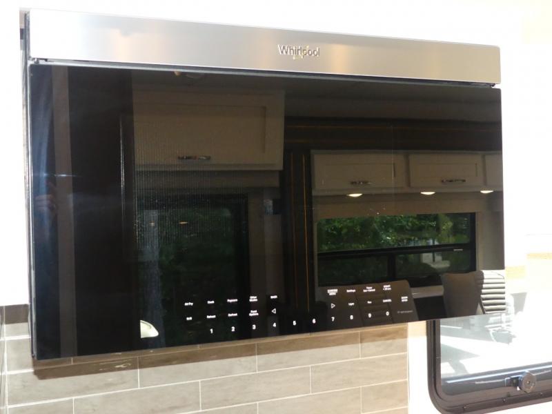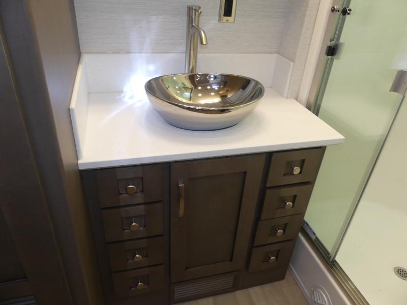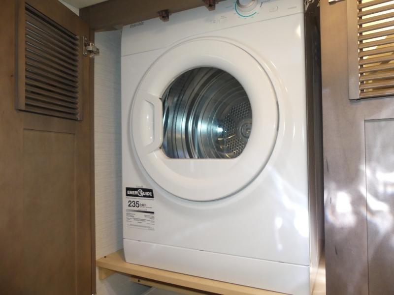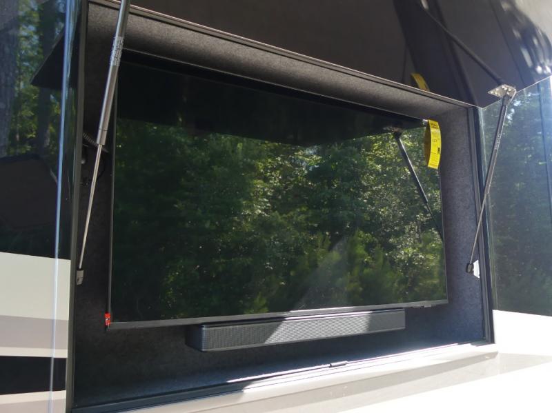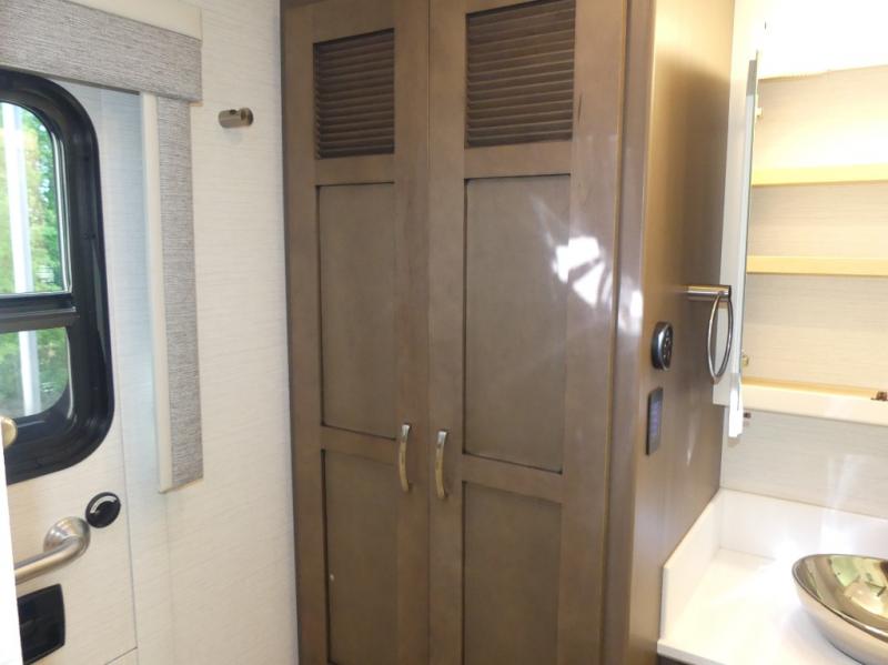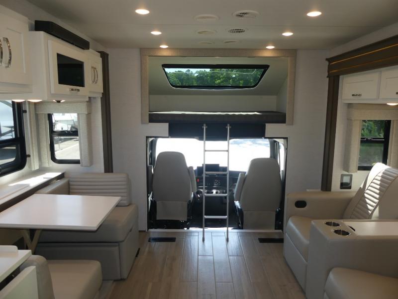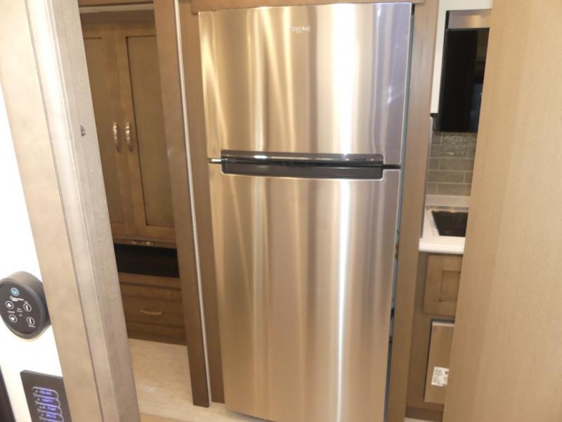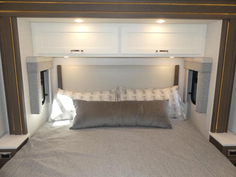 If you're looking for more space then this motorhome is for you! With a bath and a half, it's easy for everyone to use the restroom without having to use the camp's facilities. The full rear bathroom not only has a 40" x 30" shower, a wardrobe with shelves, and an area with a washer and dryer, but also an emergency exit behind the toilet. The private bedroom has a retracting king bed slide across from shirt wardrobes and a dresser with a TV. If you need more sleeping space then you can utilize the bunk over cab or lay on the 74" sofa comfort lounge. The chef can prepare their best home cooked meals with the countertop extension, the microwave convection oven with air fryer and 18 cu. ft. residential refrigerator, and you can comfortably enjoy all of your meals at the booth dinette which can also transform into an extra sleeping space if needed!