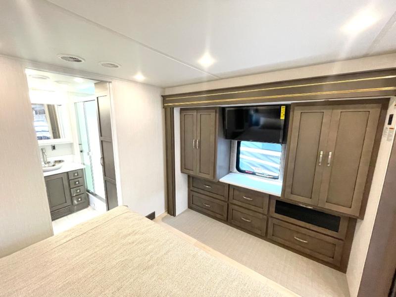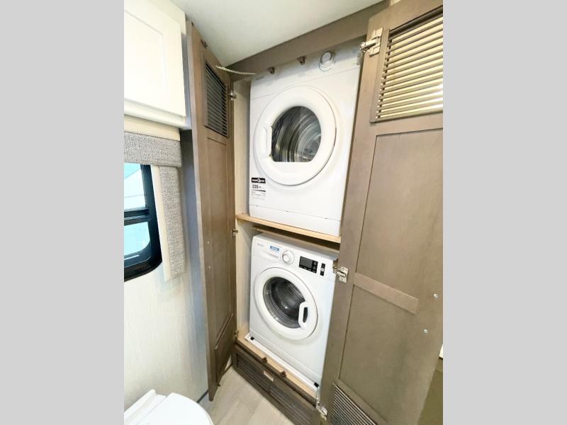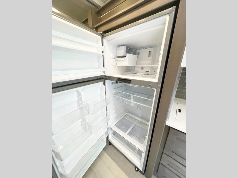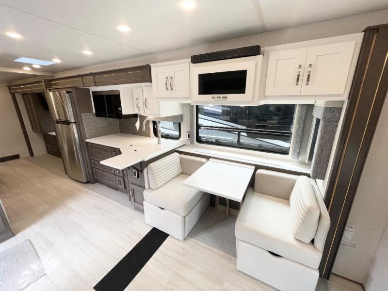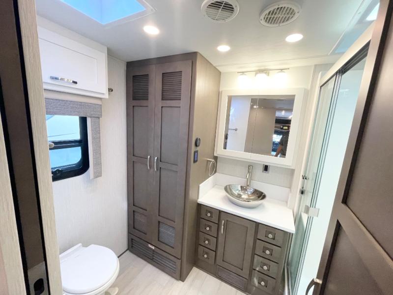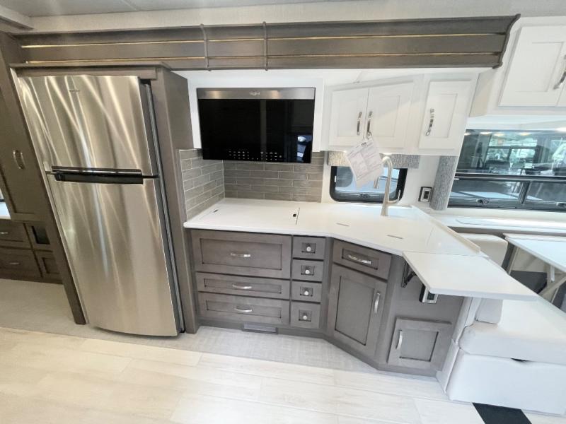 If you're looking for more space then this motorhome is for you! With a bath and a half, it's easy for everyone to use the restroom without having to use the camp's facilities. The full rear bathroom not only has a 40" x 30" shower, a wardrobe with shelves, and an area for either a wardrobe or an optional washer and dryer, but also an emergency exit behind the toilet. The private bedroom has a retracting king bed slide across from shirt wardrobes and a dresser with a TV. If you need more sleeping space then you can utilize the bunk over cab or lay on the 74" sofa comfort lounge. The chef can prepare their best home cooked meals with the countertop extension, the microwave convection oven with air fryer and 18 cu. ft. residential refrigerator, plus you could add the optional induction cooktop or optional dishwasher for easy cleanup, and you can comfortably enjoy all of your meals at the booth dinette which can also transform into an extra sleeping space if needed!