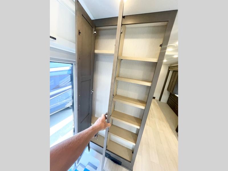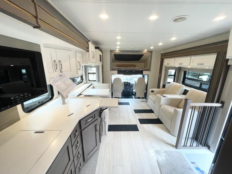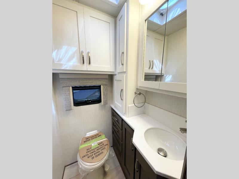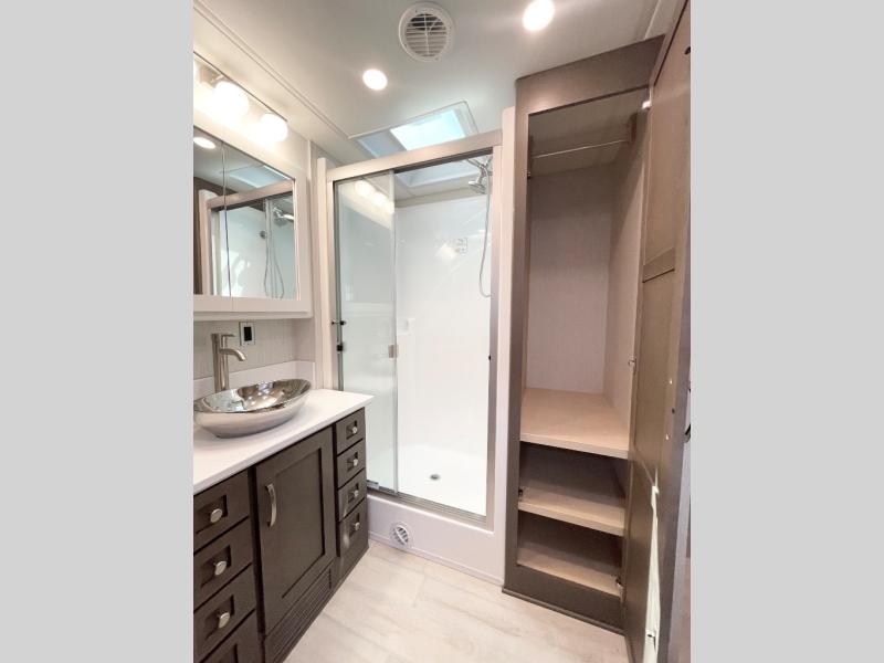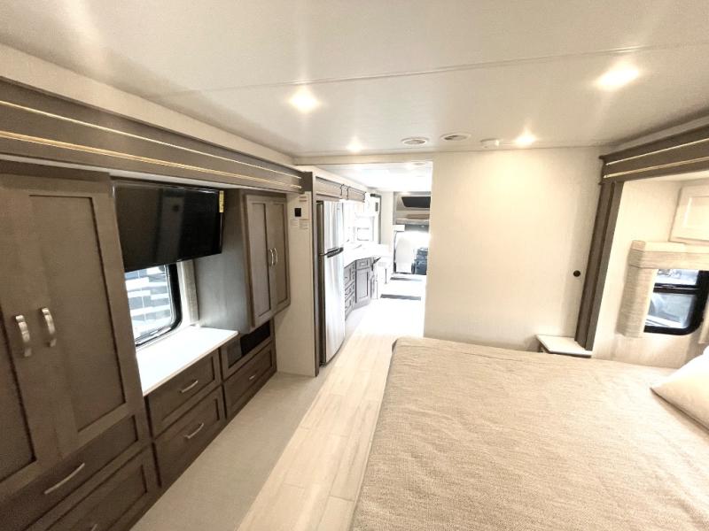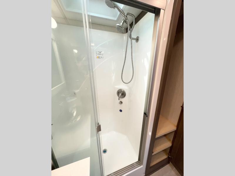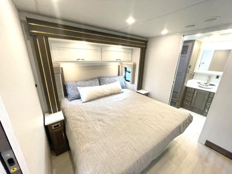 If you're looking for more space then this motorhome is for you! With a bath and a half, it's easy for everyone to use the restroom without having to use the camp's facilities. The full rear bathroom not only has a 40" x 30" shower, a wardrobe with shelves, and an area for either a wardrobe or an optional washer and dryer, but also an emergency exit behind the toilet. The private bedroom has a retracting king bed slide across from shirt wardrobes and a dresser with a TV. If you need more sleeping space then you can utilize the bunk over cab or lay on the 74" sofa comfort lounge. The chef can prepare their best home cooked meals with the countertop extension, the microwave convection oven with air fryer and 18 cu. ft. residential refrigerator, plus you could add the optional induction cooktop or optional dishwasher for easy cleanup, and you can comfortably enjoy all of your meals at the booth dinette which can also transform into an extra sleeping space if needed!