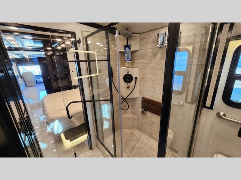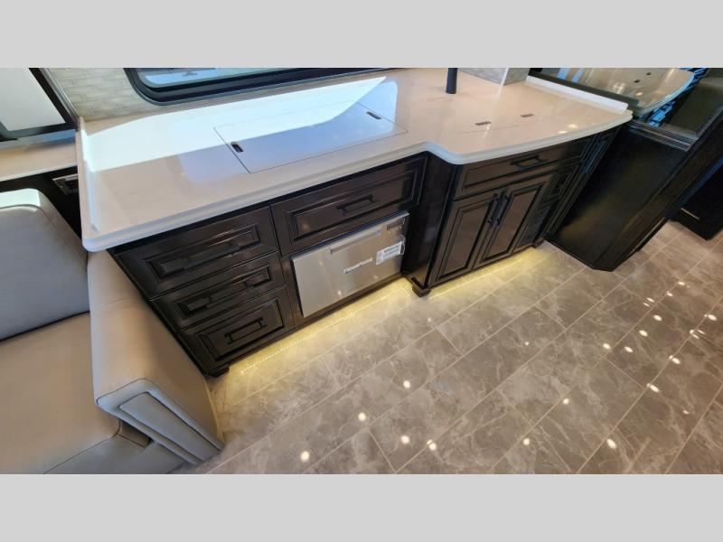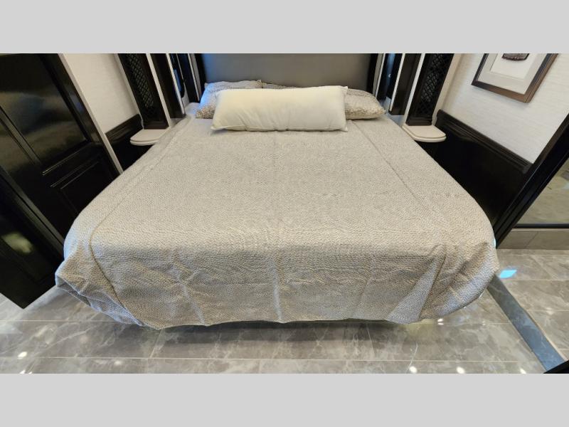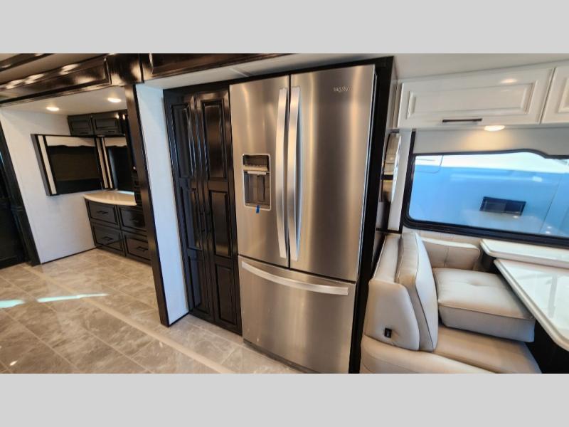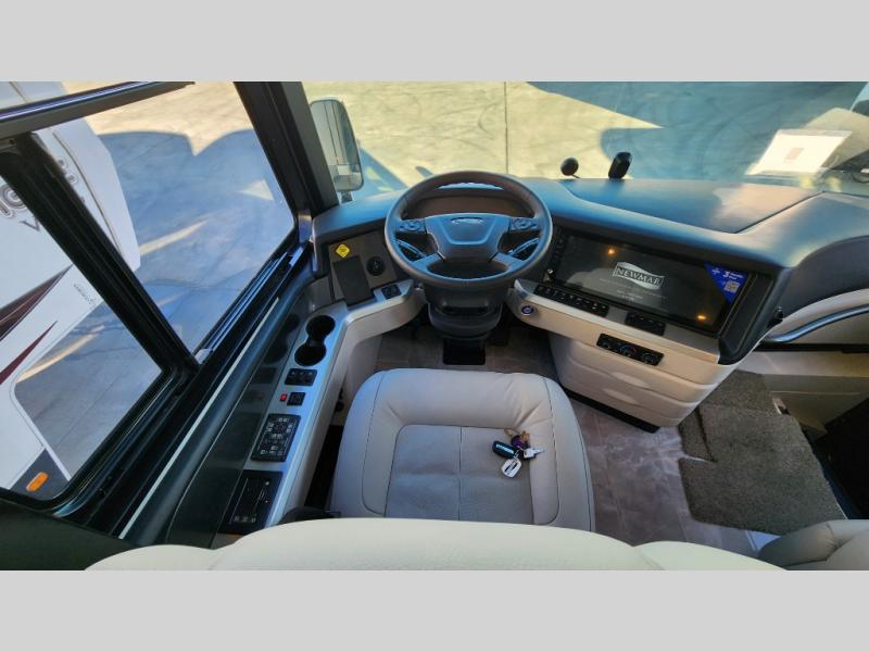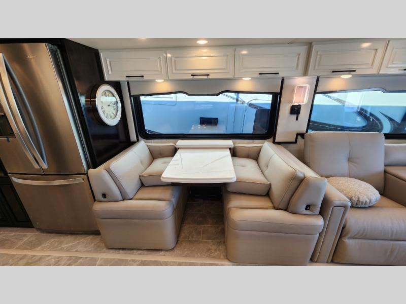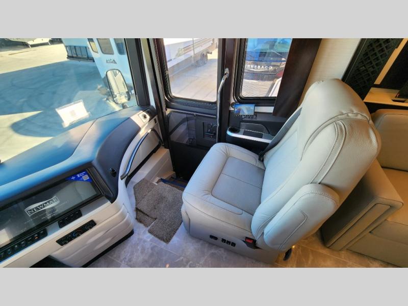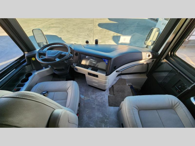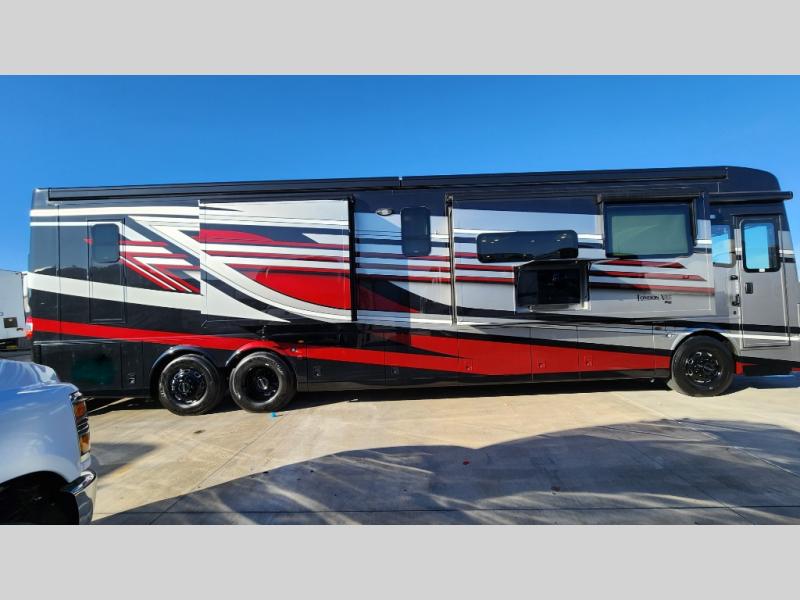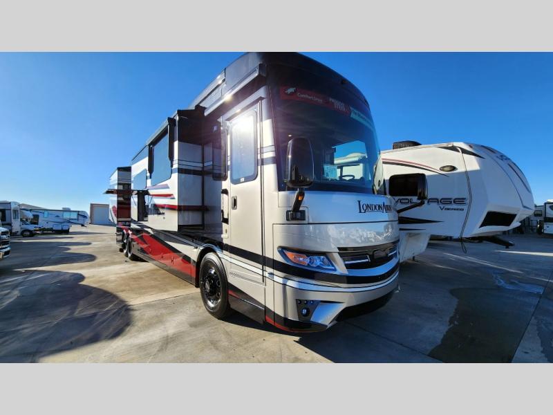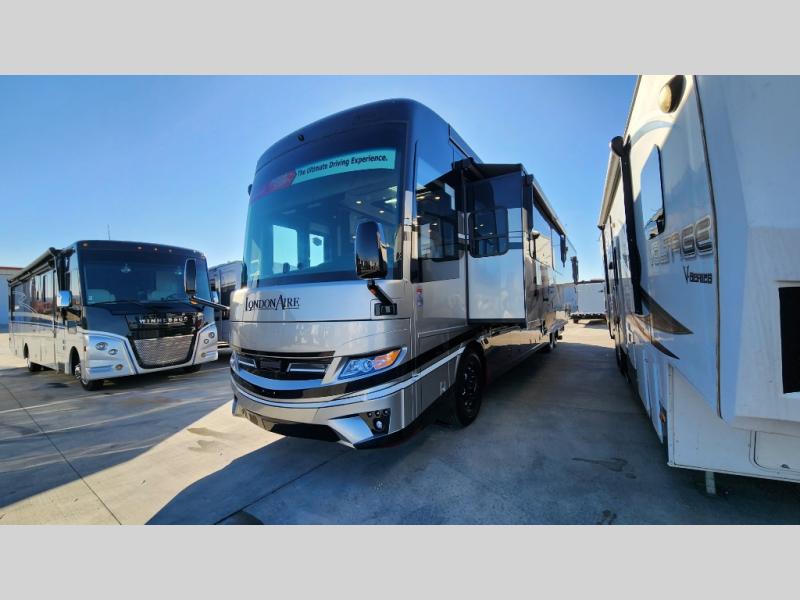 The London Aire Class A diesel motorhome by Newmar starts with a Freightliner chassis with a tag axle and 605 HP, tire pressure monitoring on the tag axle chassis, aluminum wheels, and an electronic chassis information center in dash. There is also 5/8" foam insulation laminated in sidewalls and ceiling to ensure years of use. You will stay comfortable with the three 15M Penguin heat pump central air conditioners with remote control thermostat that will keep you warm during those cooler months. Each model includes super polished solid surface countertops, hardwood cabinets with raised panel doors, and many more luxuries. Some of the conveniences you are sure to appreciate are the central vacuum with a tool kit, the Aqua Miser shower system, and the air leveling control system for hassle-free setup.